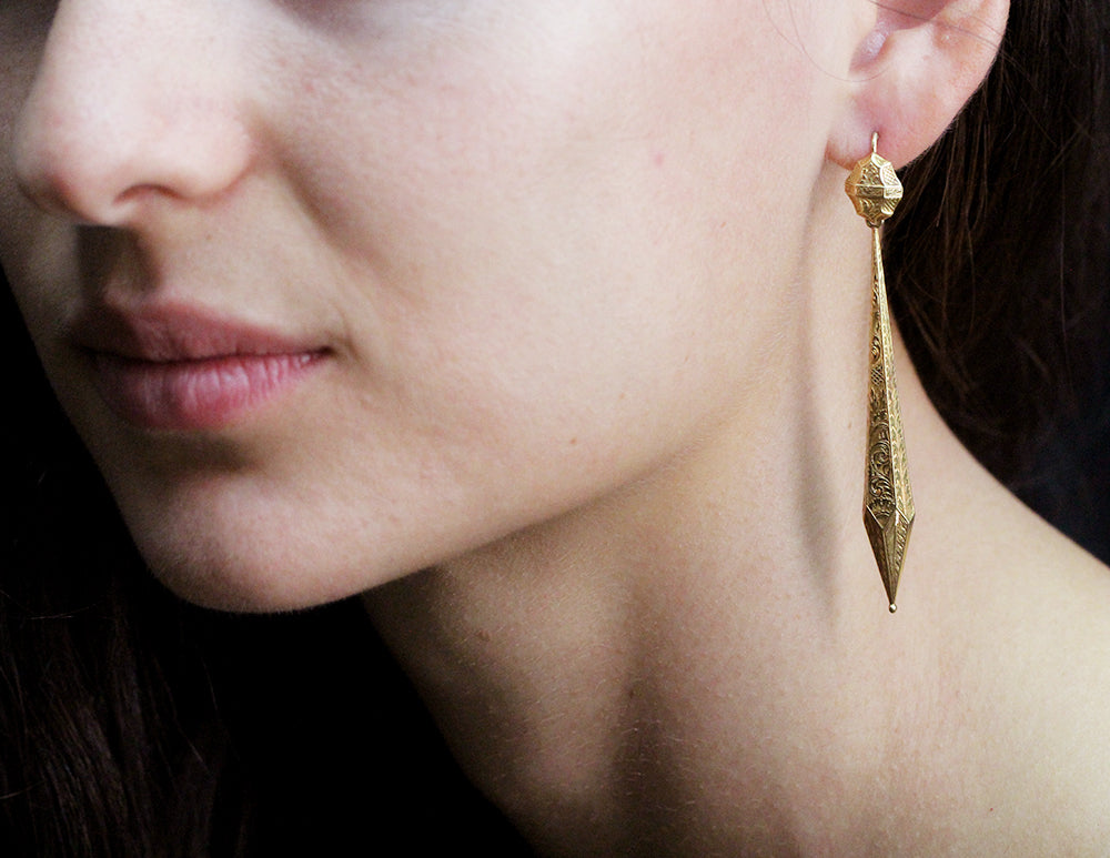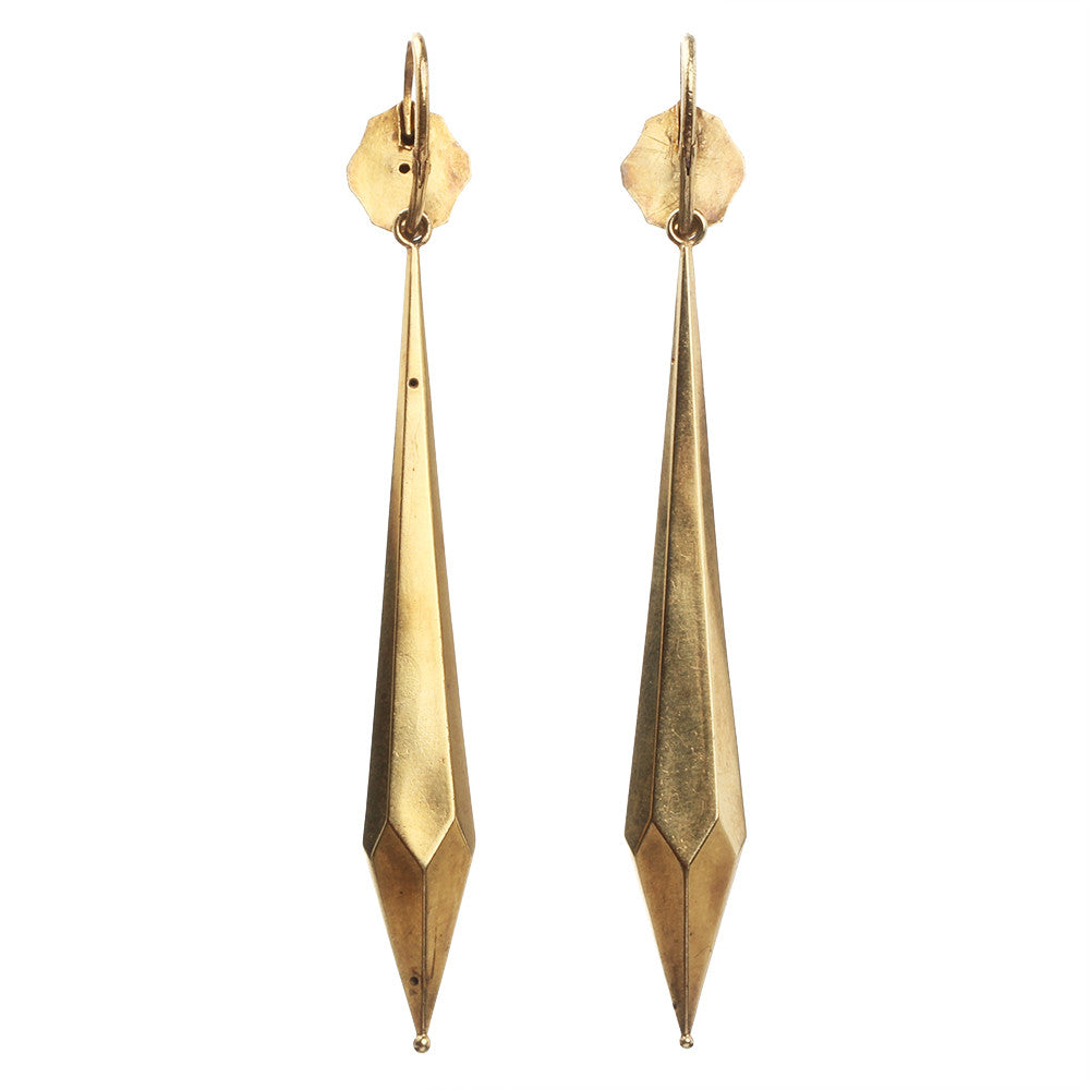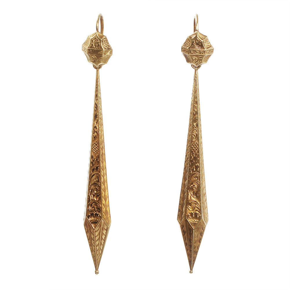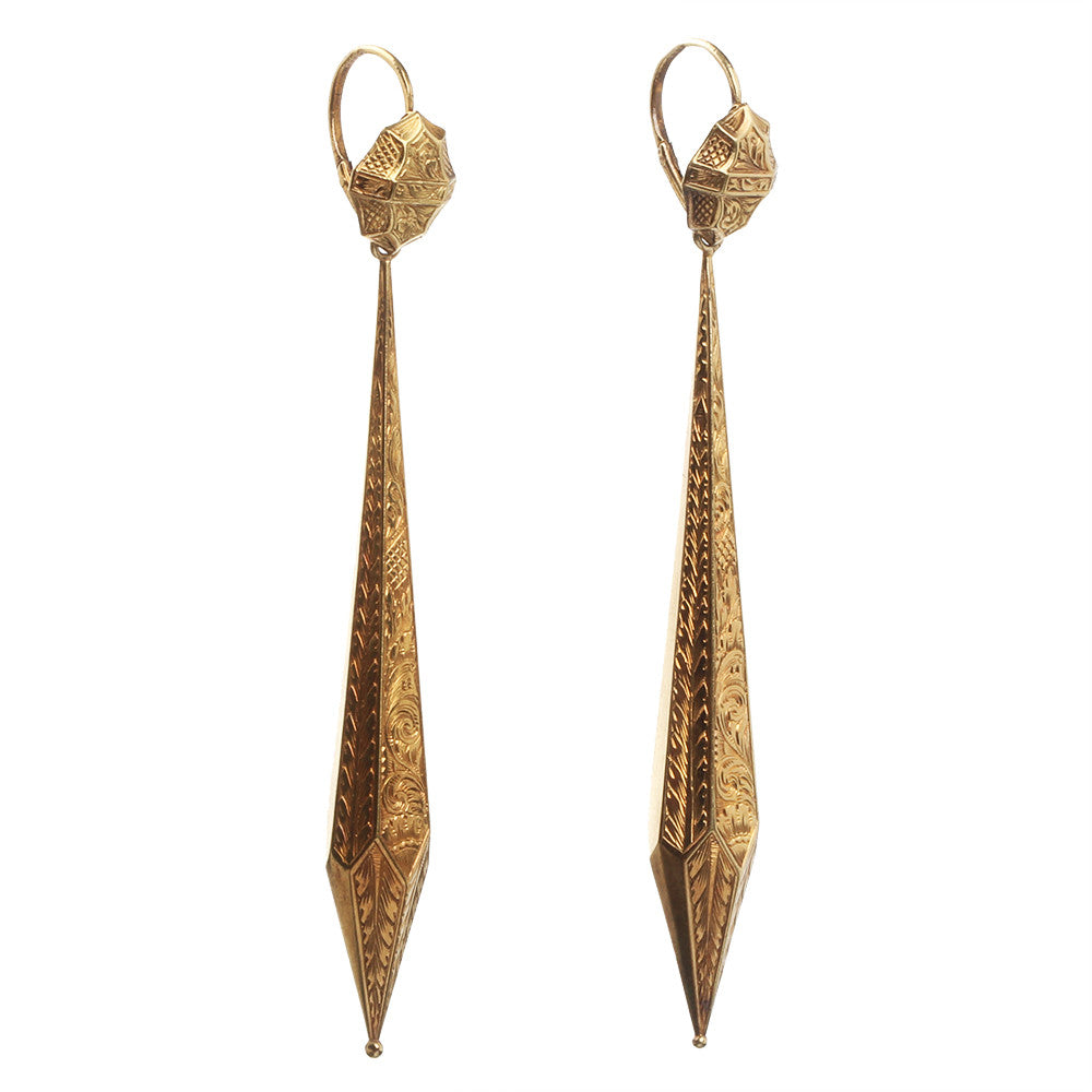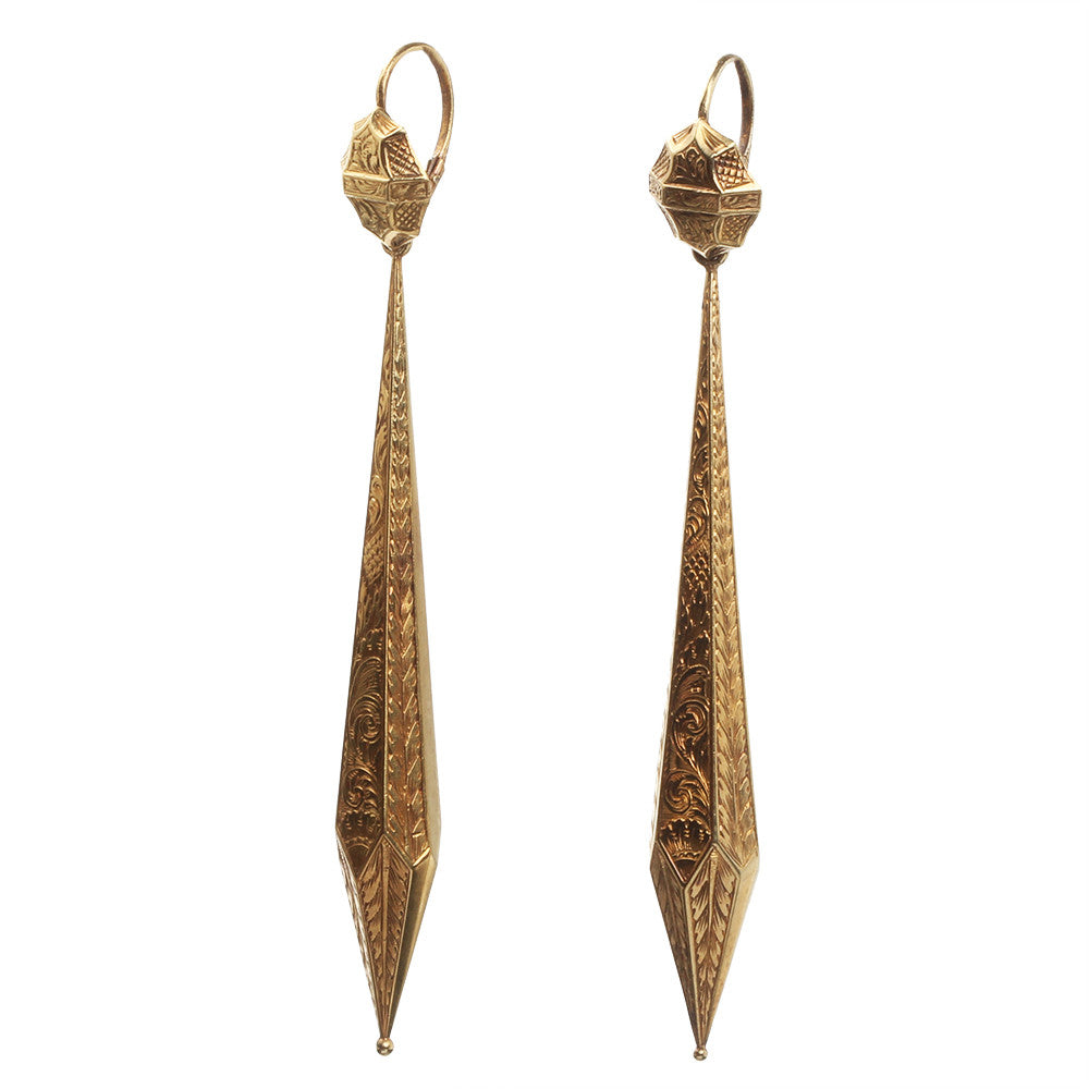Georgian Era 18k gold torpedo earrings. Torpedoes can be removed and worn on the elaborately engraved side or the plain. Also the tops can be worn alone. Circa 1810, English in Origin.