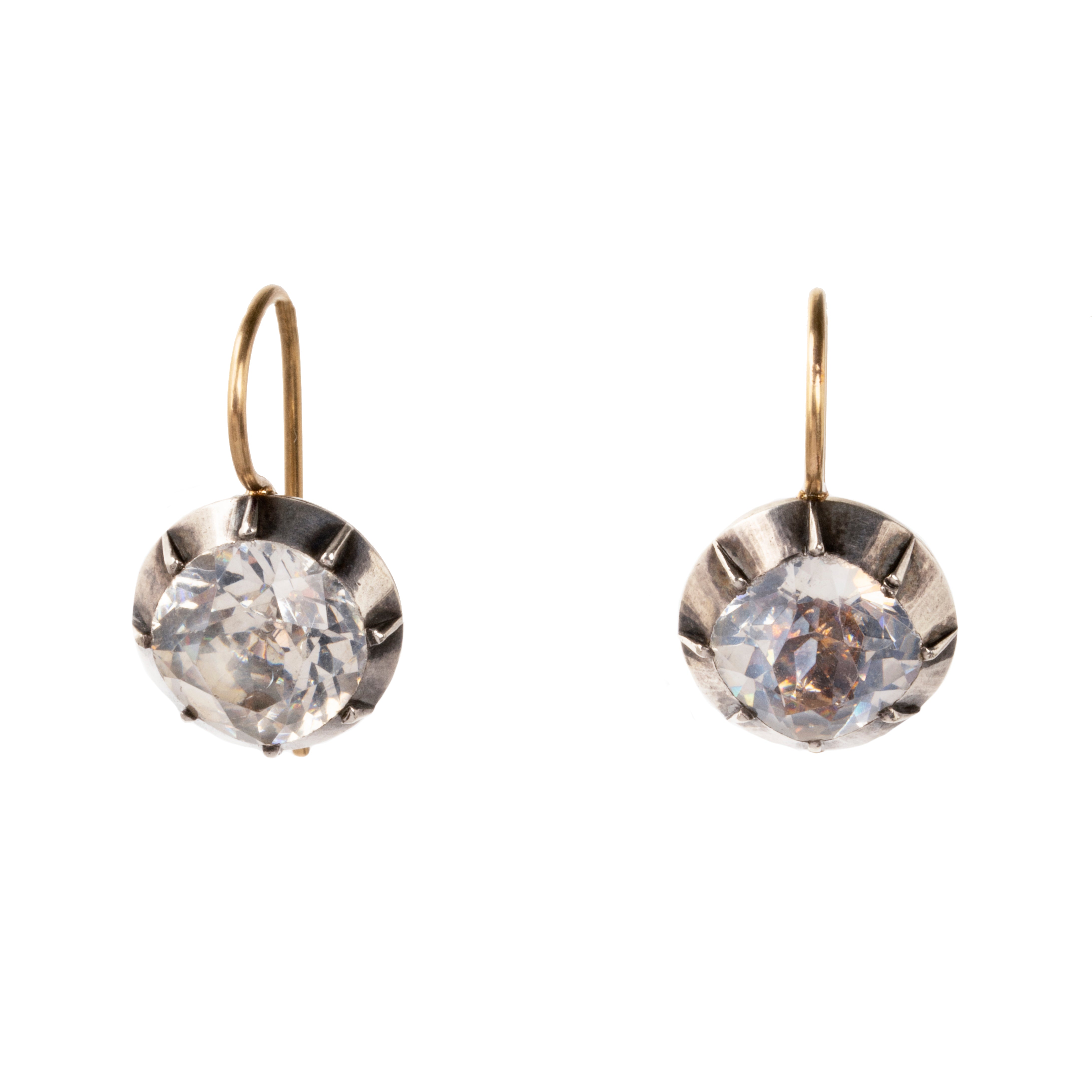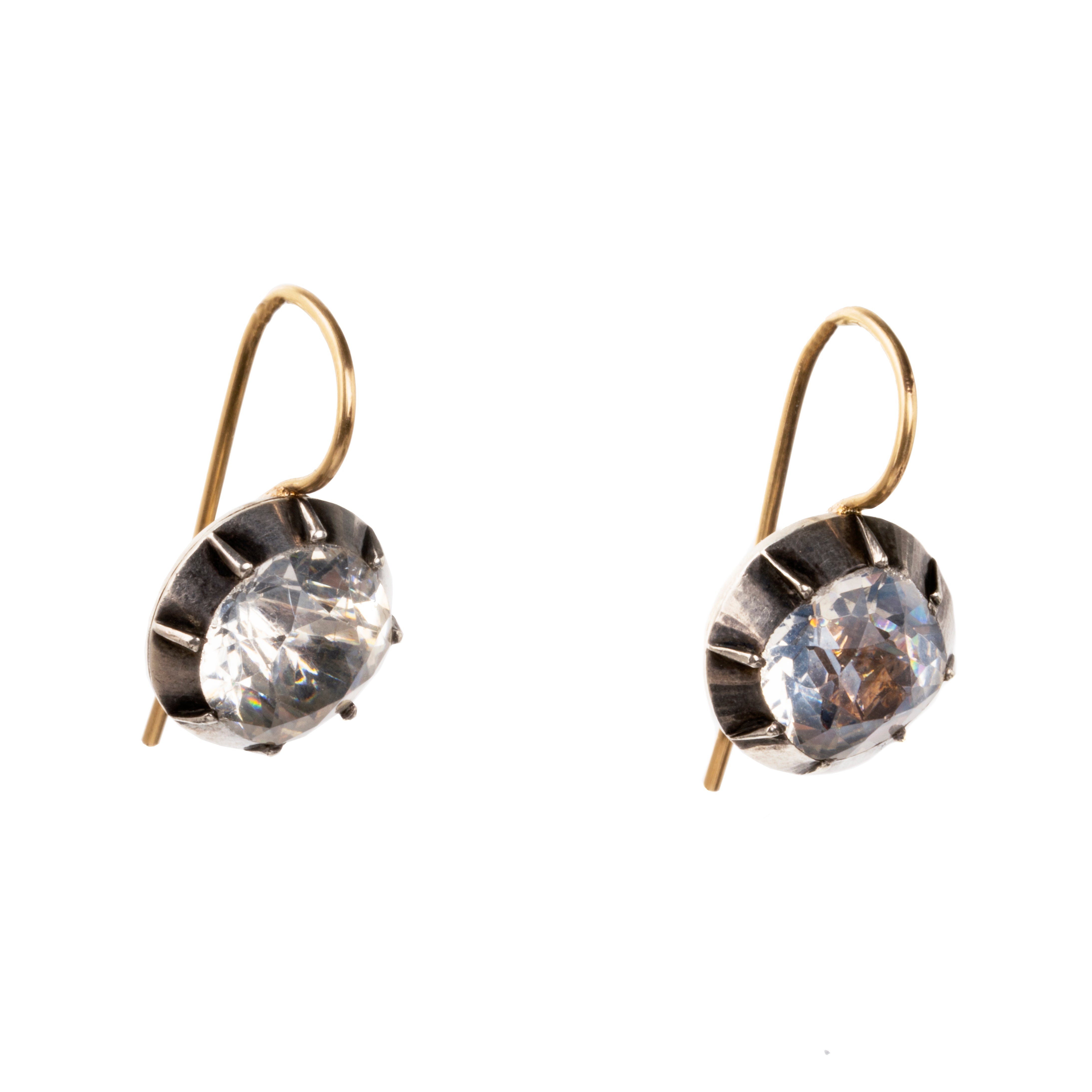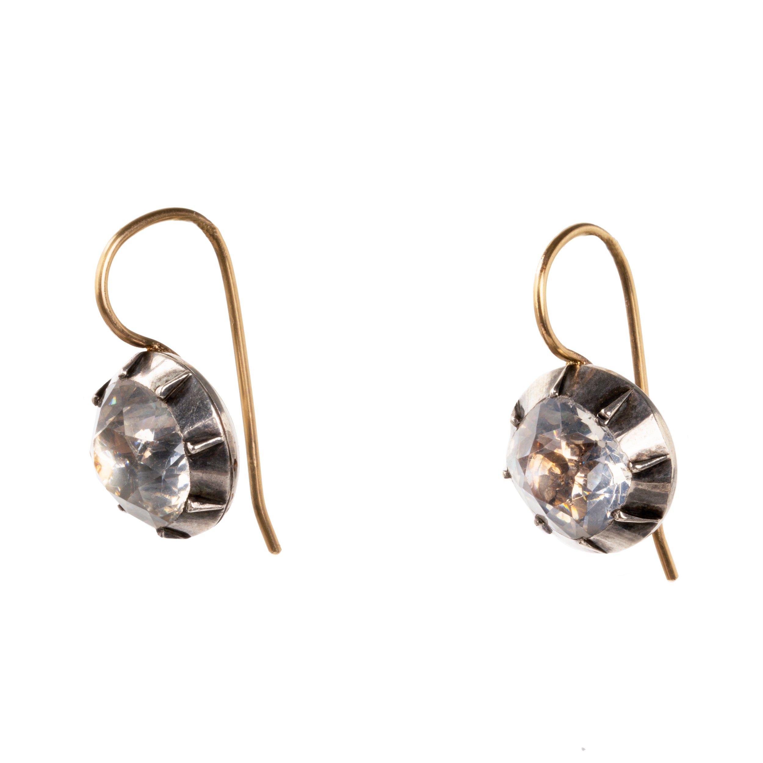 Georgian era cushion shaped white paste earrings.Paste stones are set in foiled back silver settings on 18k gold wires. What were once beautiful Georgian era buttons or cufflinks are now perfect everyday earrings. English in origin. Circa 1820.