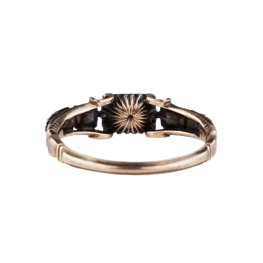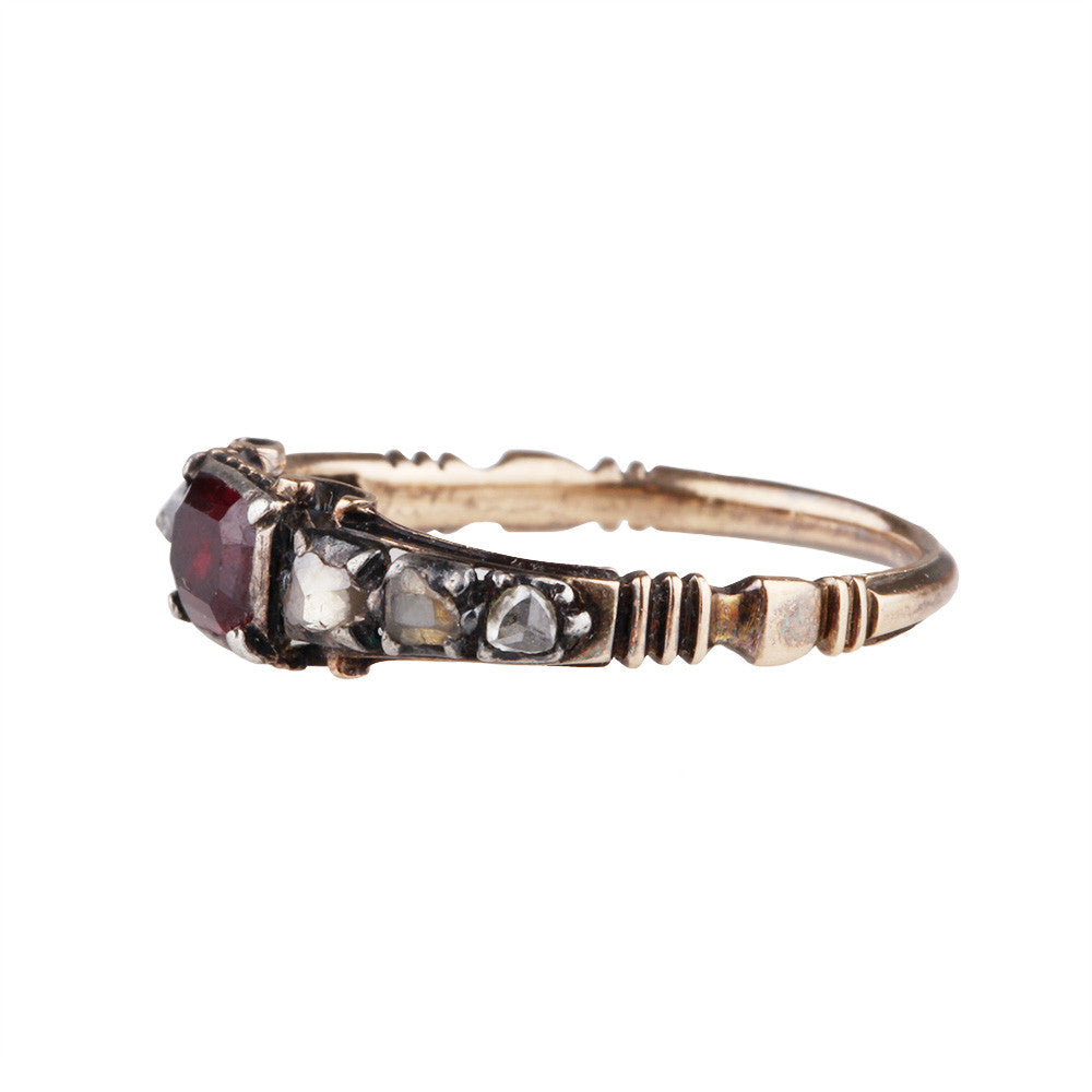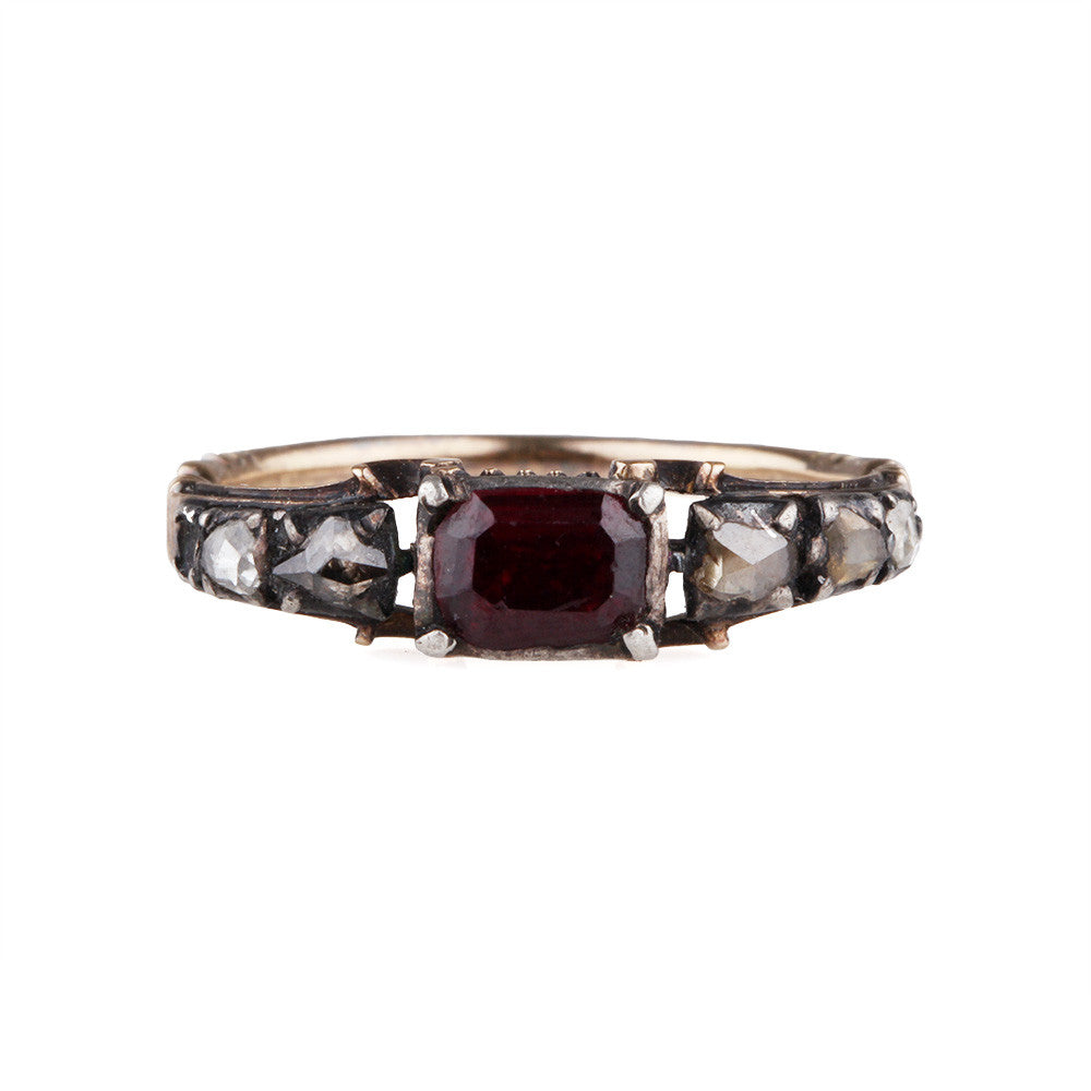 Georgian garnet and rose cut diamond ring. The stones are set in silver while the remainder of the ring is in gold. Reeded detail on back of setting. Found in London, Circa 1790.