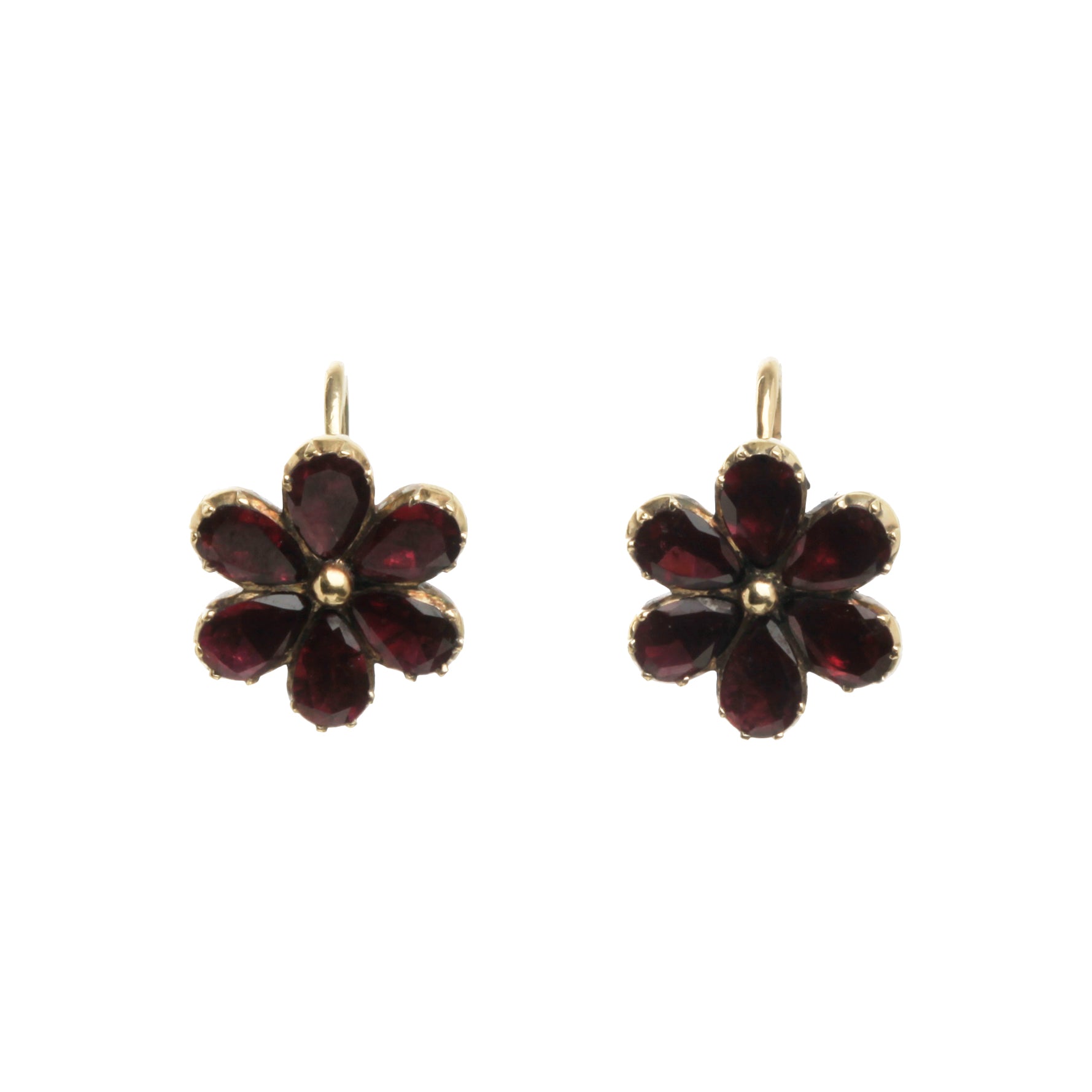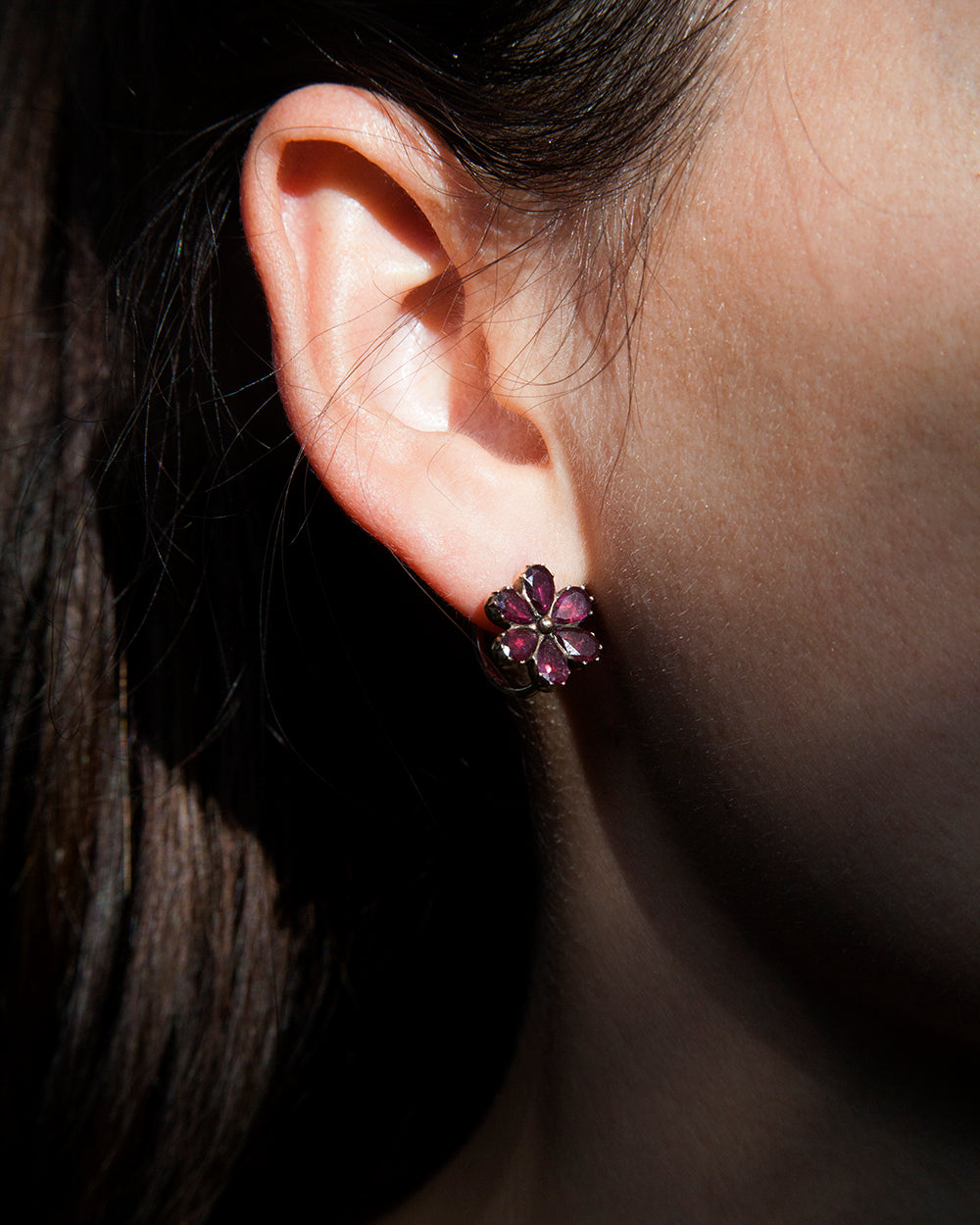Georgian era garnet pansy earrings. In rose gold. Here flat cut garnets are set closed back in rose gold form a 6 petal flower earring. Circa 1820. English in Origin