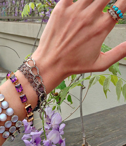 Shown on model with an assortment of Bell & Bird antique bracelets and rings. Contact shop for more details on these pieces.