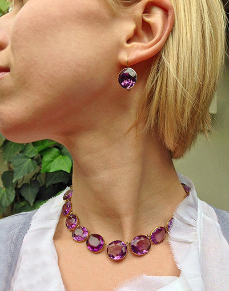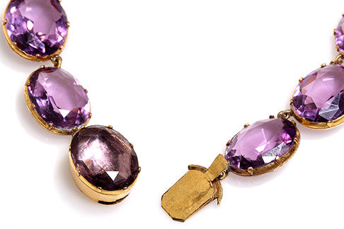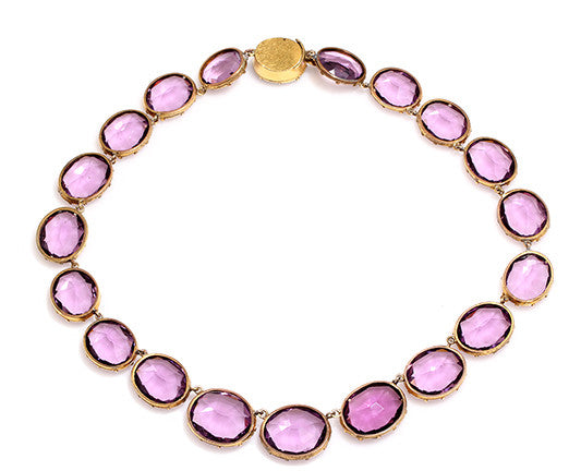 Georgian gilt amethyst paste rivière. Oversized purple stones in open backed settings. Foiled paste clasp. Late Georgian to Victorian. Bold and wearable. See our Field Guide to learn more about paste jewels.