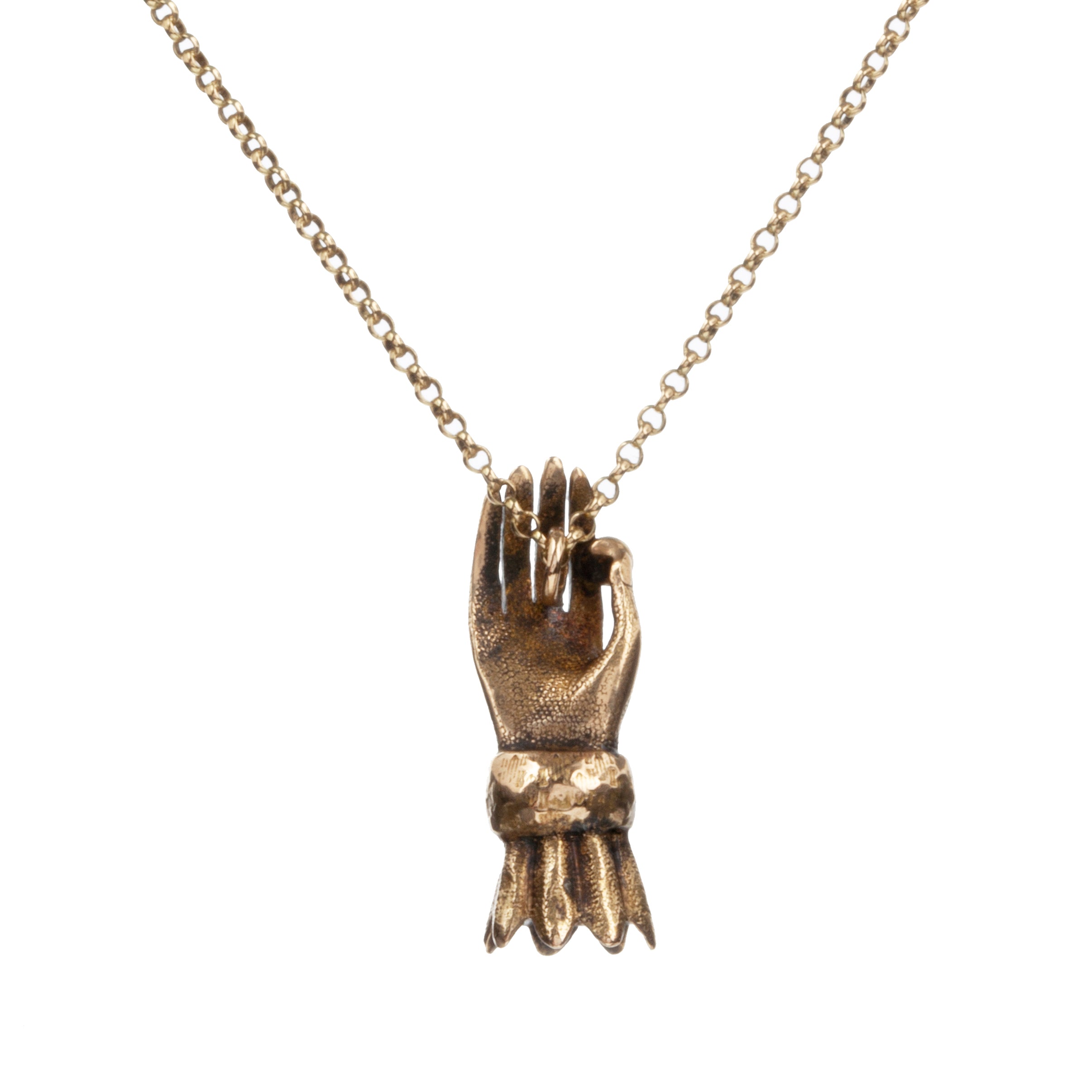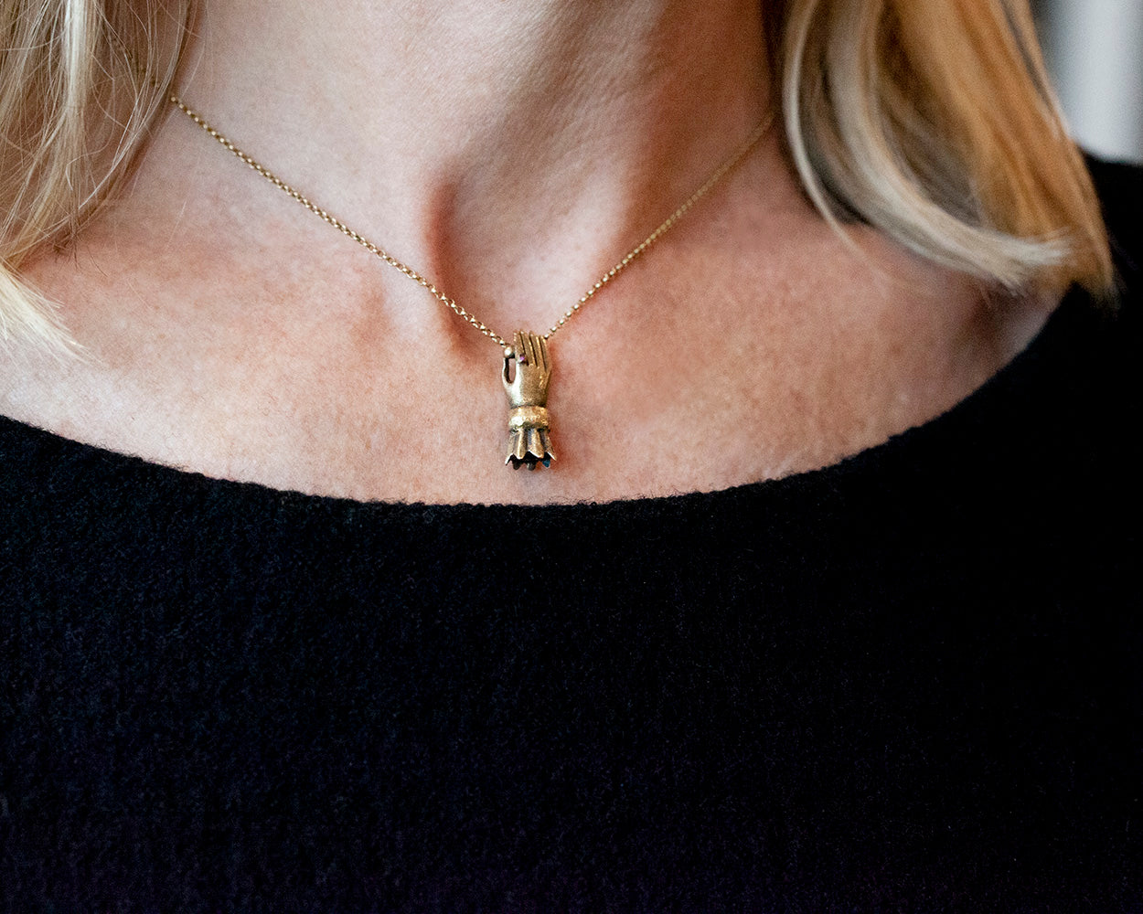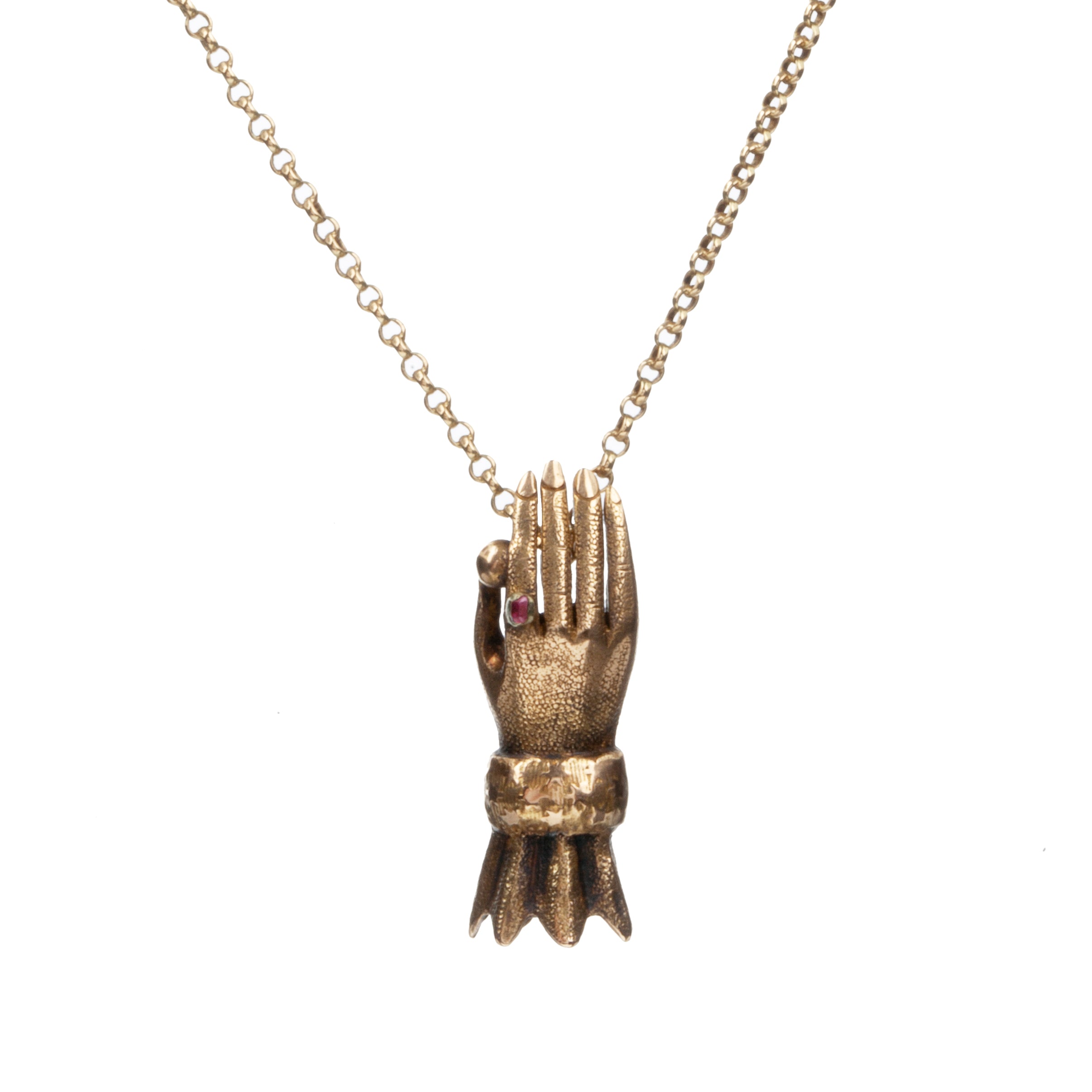 Early 19th Century hand pendant. The hand is wearing a tiny ruby ring and manchette bracelet. The hand was popular motif of the time, symbolic of friendship. The pendant was once acted as a clasp for a period longuard or muff chain and later converted into a pendant. Hanging on a vintage 15k gold chain. English in origin. Circa 1820.