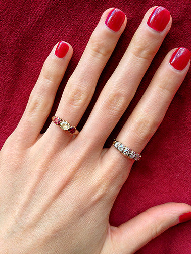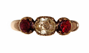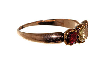 Georgian era paste ring with bright paste stones in garnet and topaz colors. Circa 1780-1810. English in origin. Paste stones in closed back cut away settings.