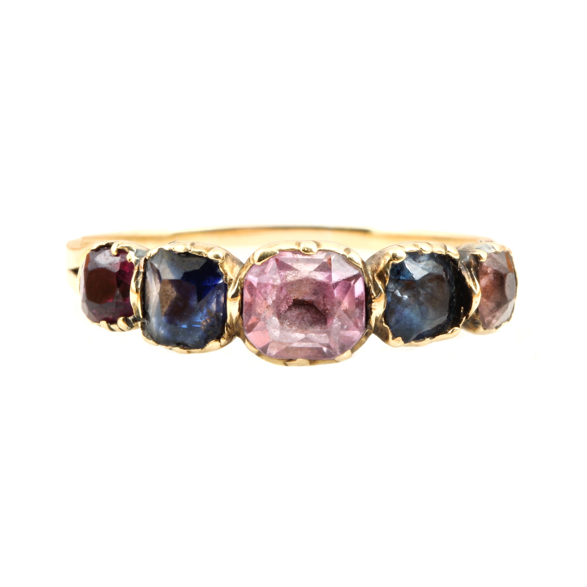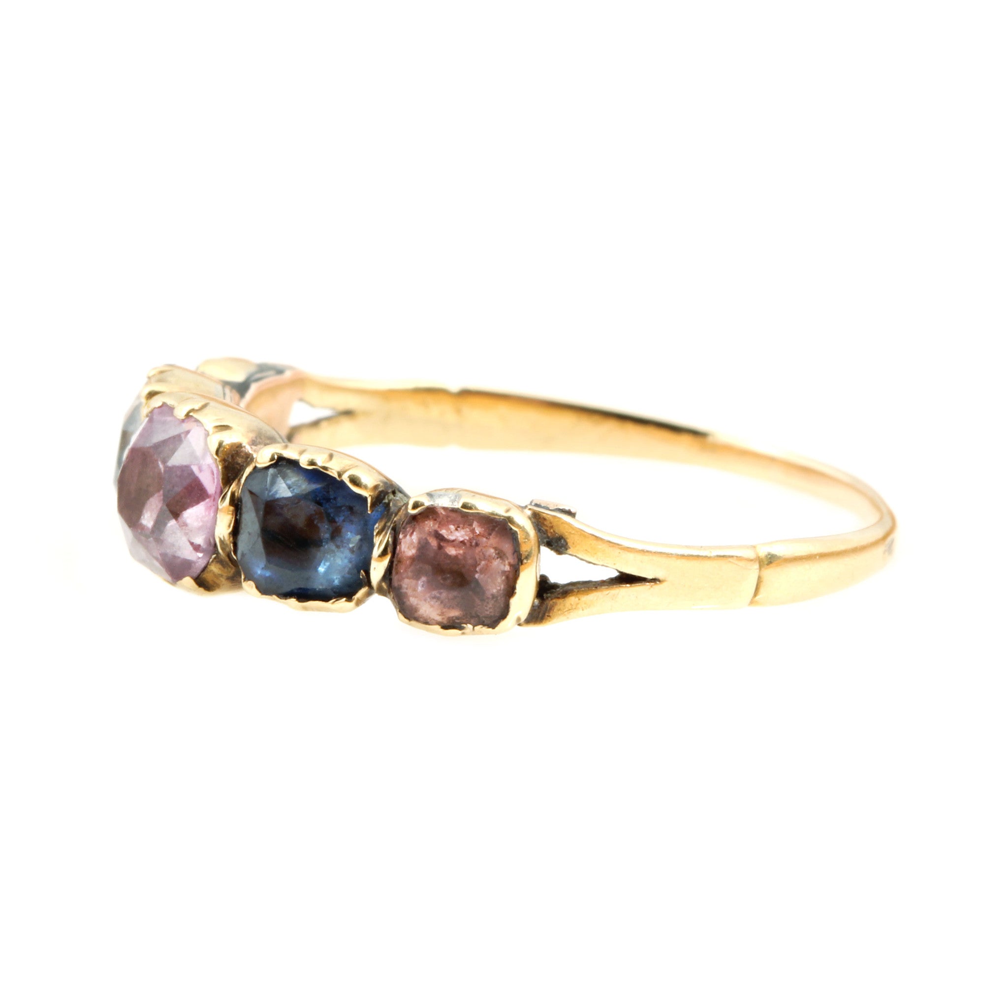 A rare 19th Century multi-gemstone ring. This 200 year old ring shows some age from being worn and loved. There is a nicely done reinforcement on the reverse of the settings. Set in 18k gold with topaz and sapphire gemstones in varied colors. English in origin. Circa 1800.