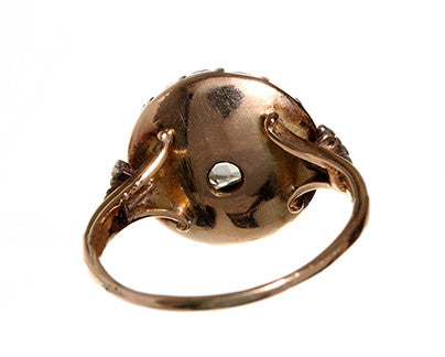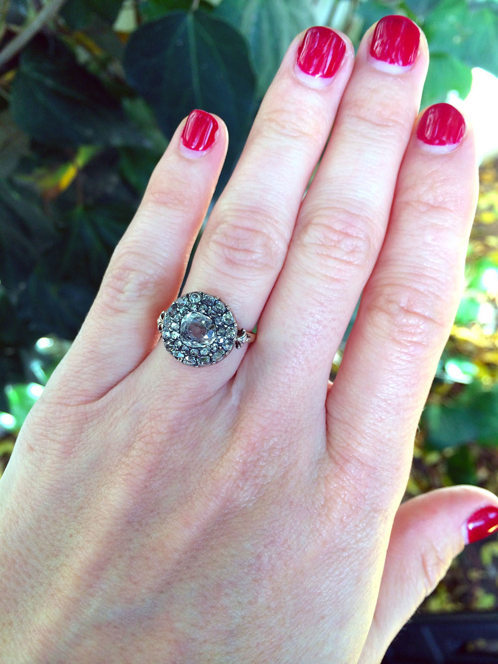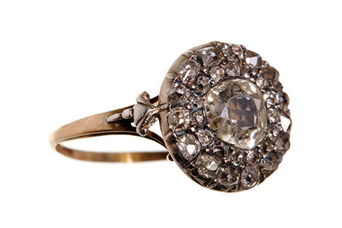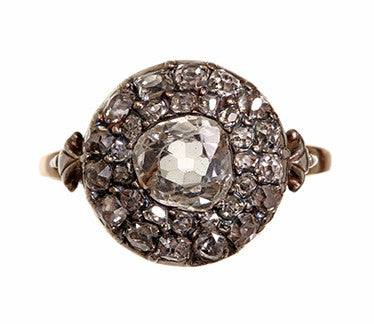 Early Georgian old mine cut diamond cluster ring in silver and gold. Central flat cut old mine brilliant diamond surrounded by two rows of old mine cut diamonds. Formally close set with removed foil backings has been opened making the ring suitable for engagement ring wear. Silver topped gold. Circa 1790.