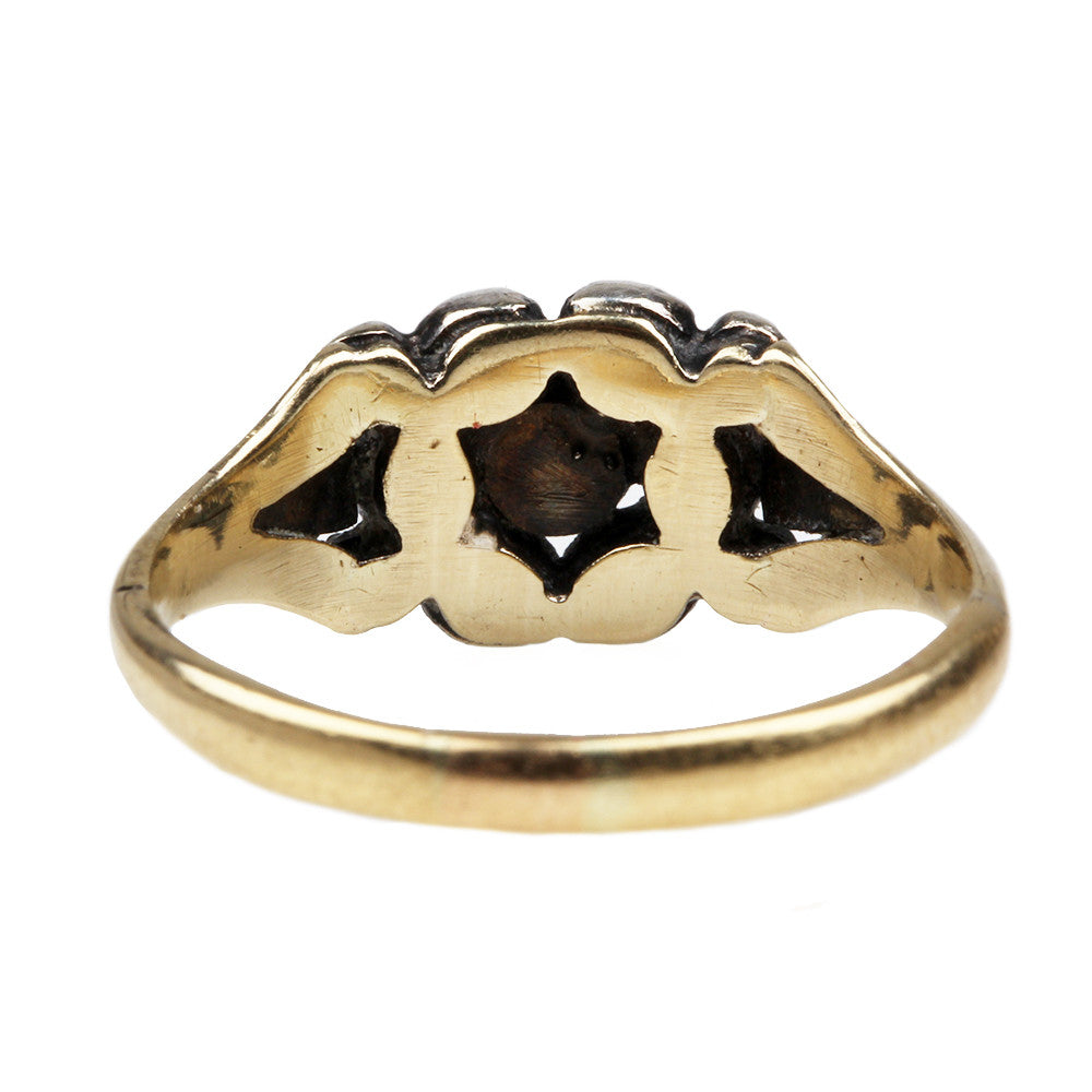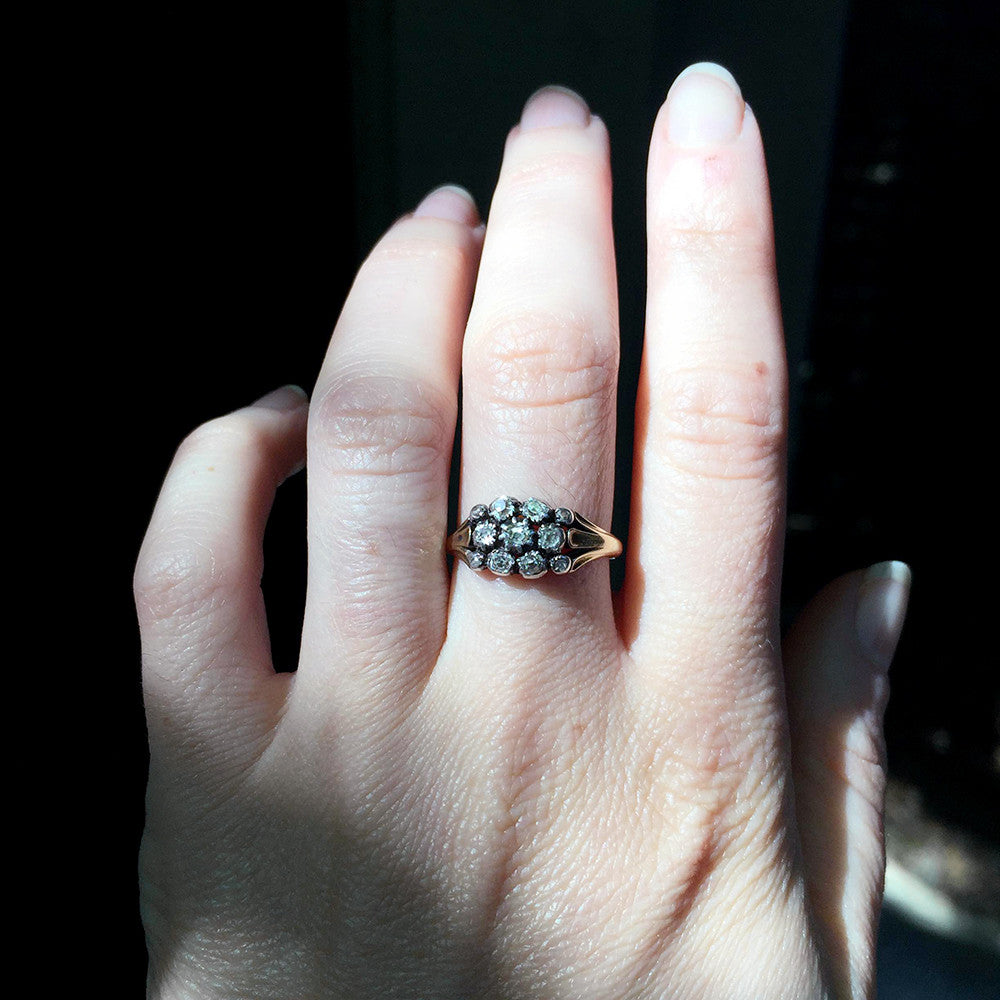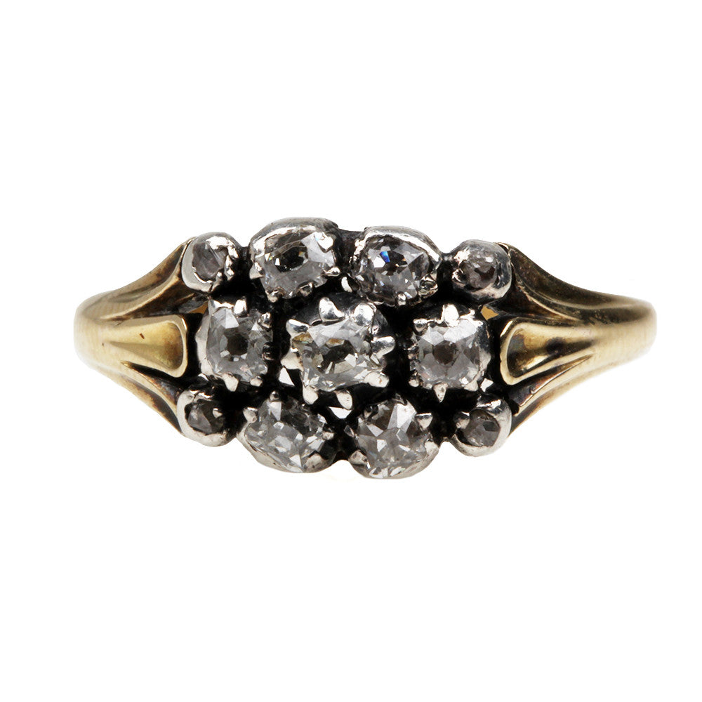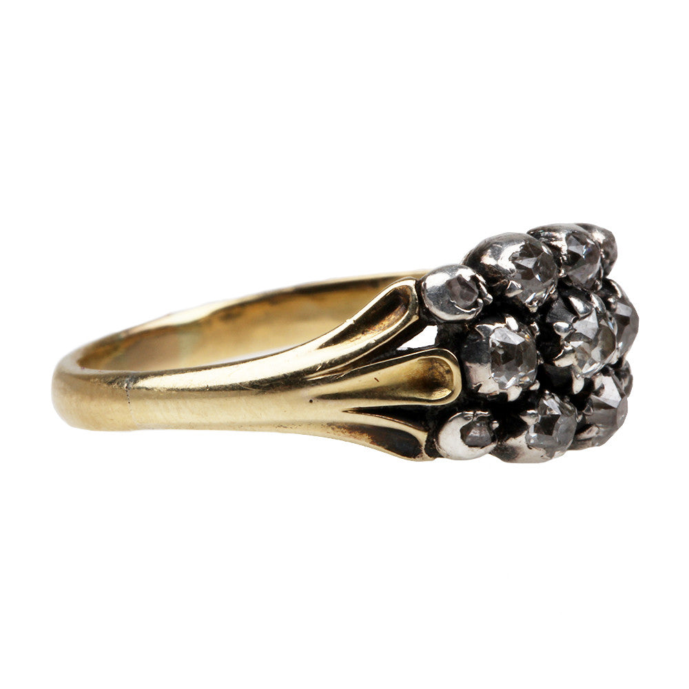 Early Victorian old mine cut diamond ring. 11 diamonds set in sliver on gold. English in origin, Circa 1830.