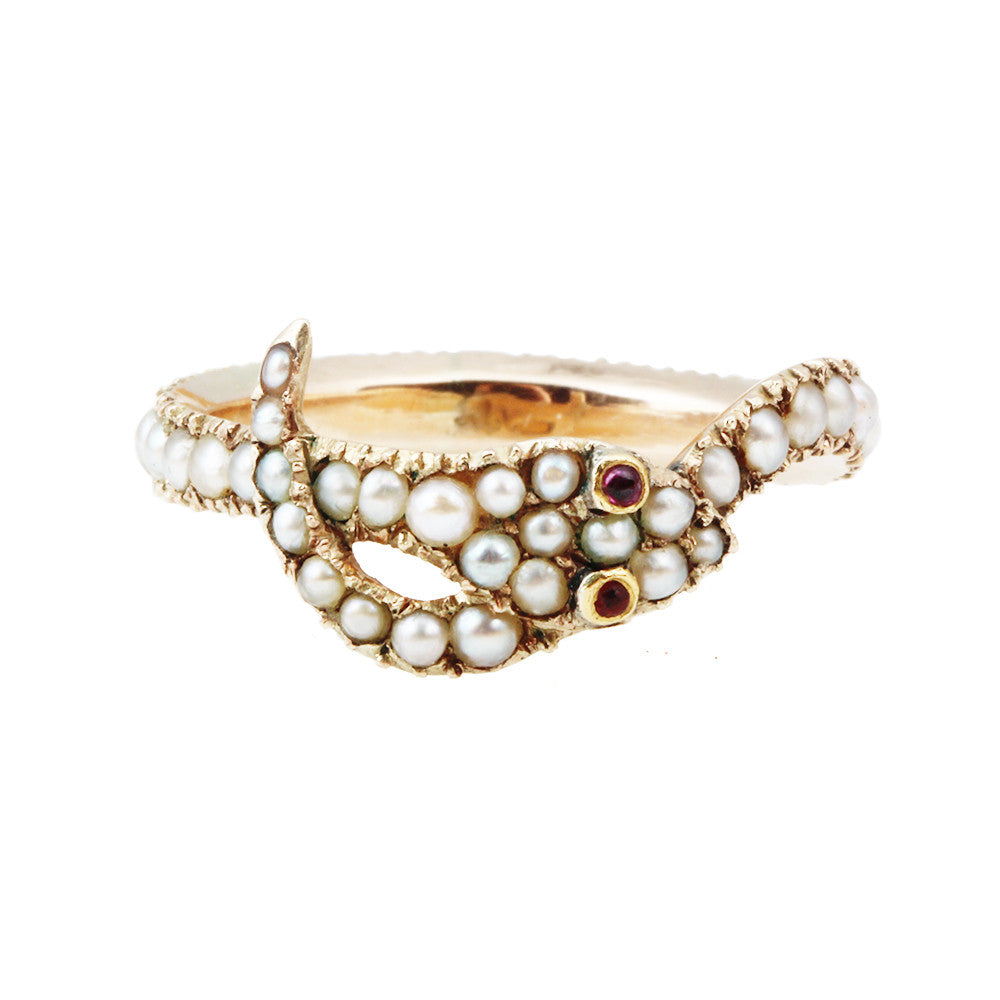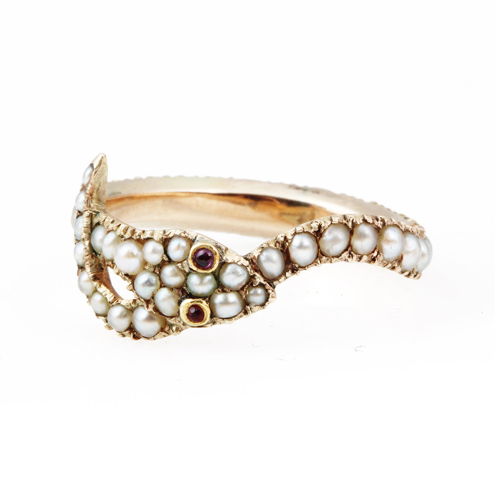 Early 19th Century natural pearl snake ring. Pearls and garnet eyes set in 18k gold. The snake was a popular Victorian-era symbol for eternal love. English in origin, Circa 1810.