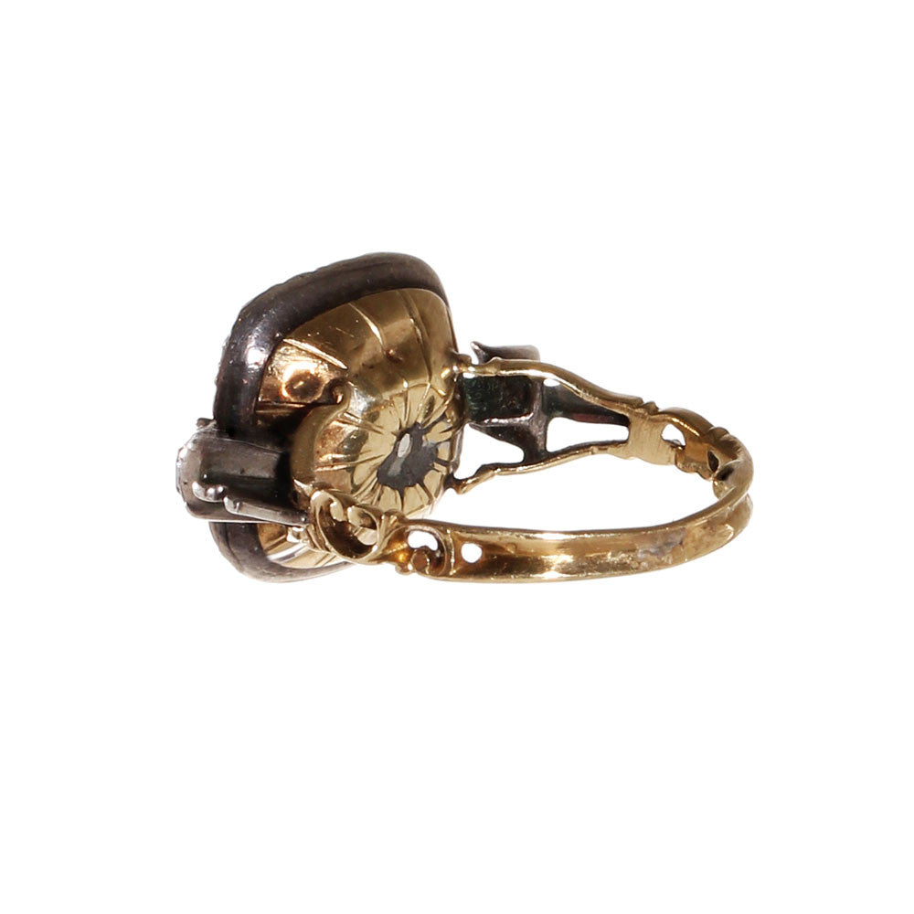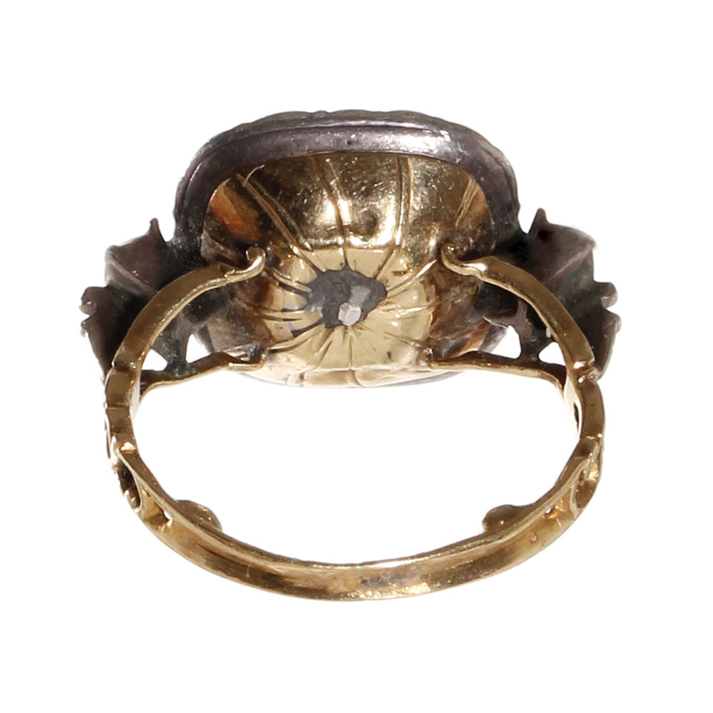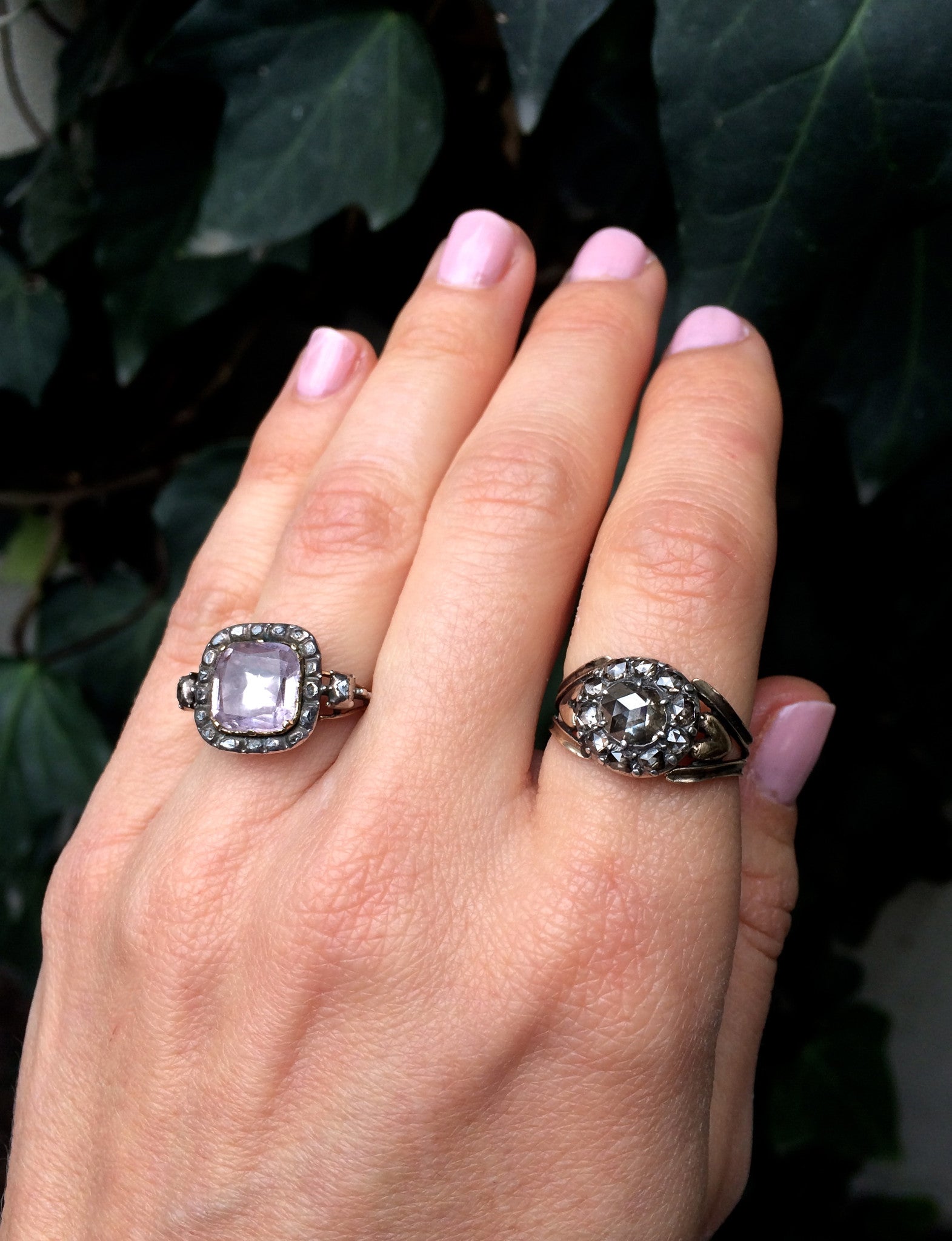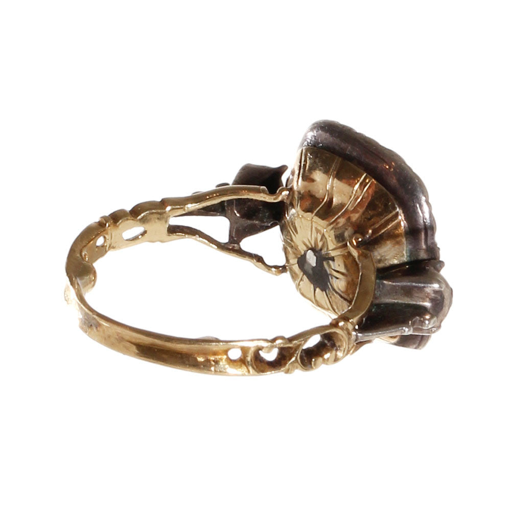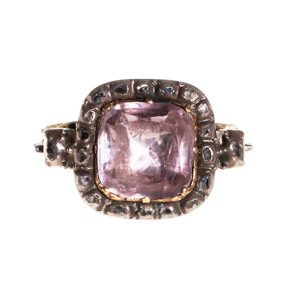 18th century natural pink topaz & diamond ring. Large in scale, the topaz is set in high carat gold with the mixed cut diamonds set in silver. Beautifully original details, including hand engraved details on the closed back setting. The ring has shows wear from years of love and use but remains in good condition, considering its 200+ year history. English in origin, circa 1760.