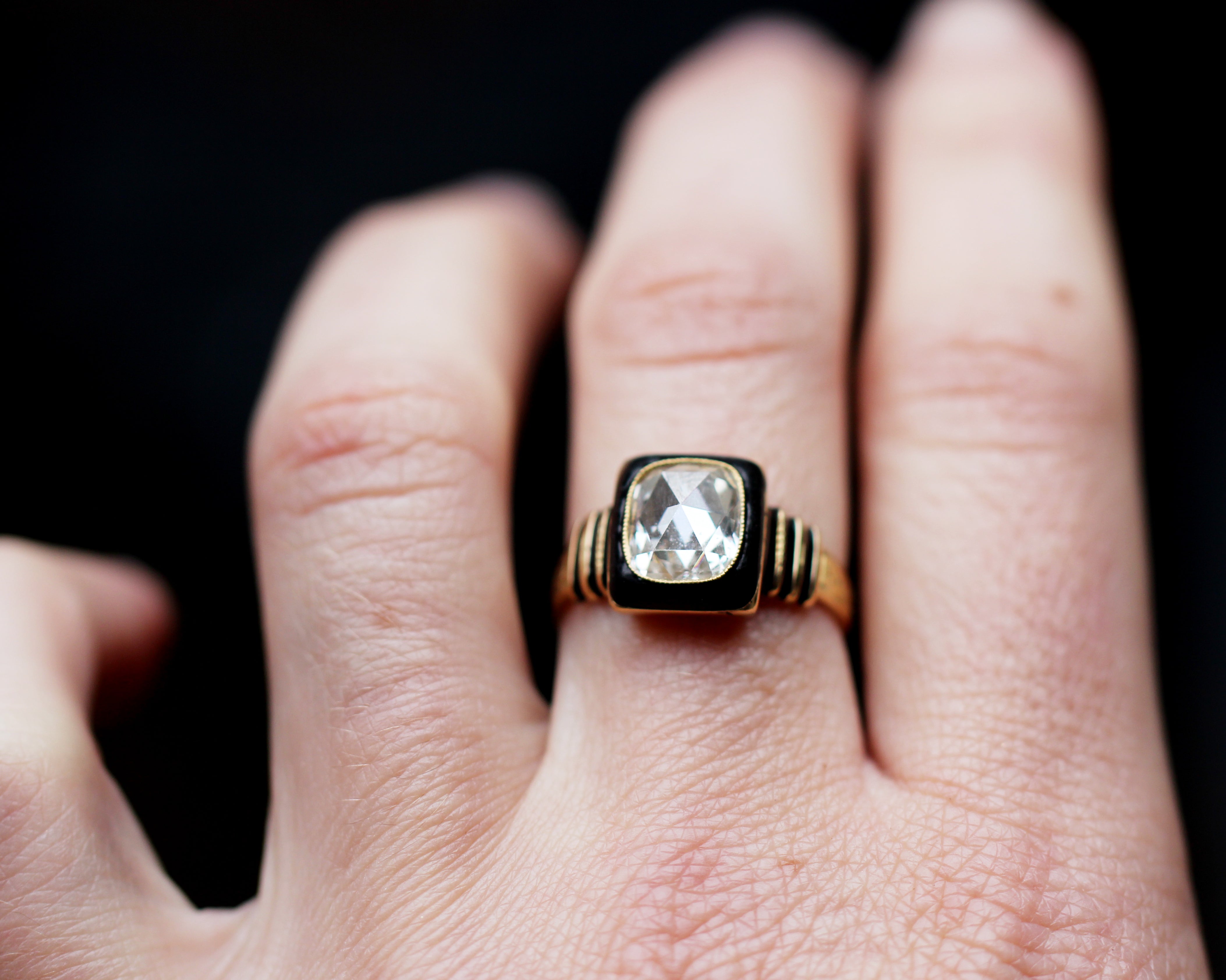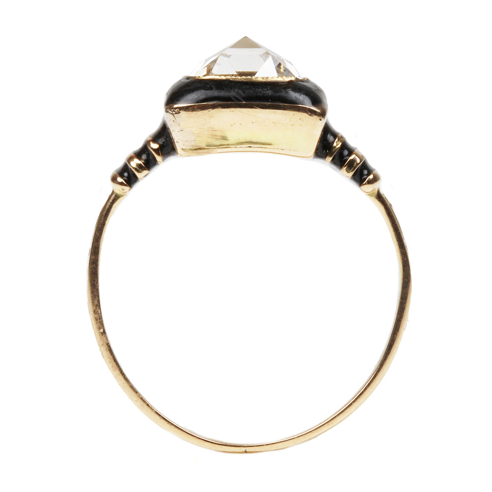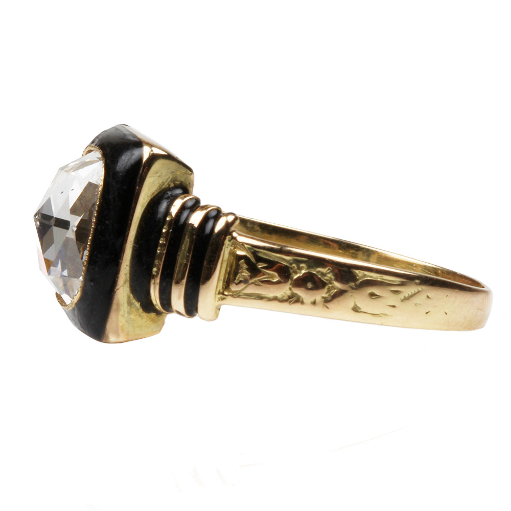Rose cut diamond and black enamel ring. Approximately 1.29 carat Rose cut diamond set in an closed back setting with black enamel surround. Black enamel stripes details on the band. English in Origin. Circa 1840.