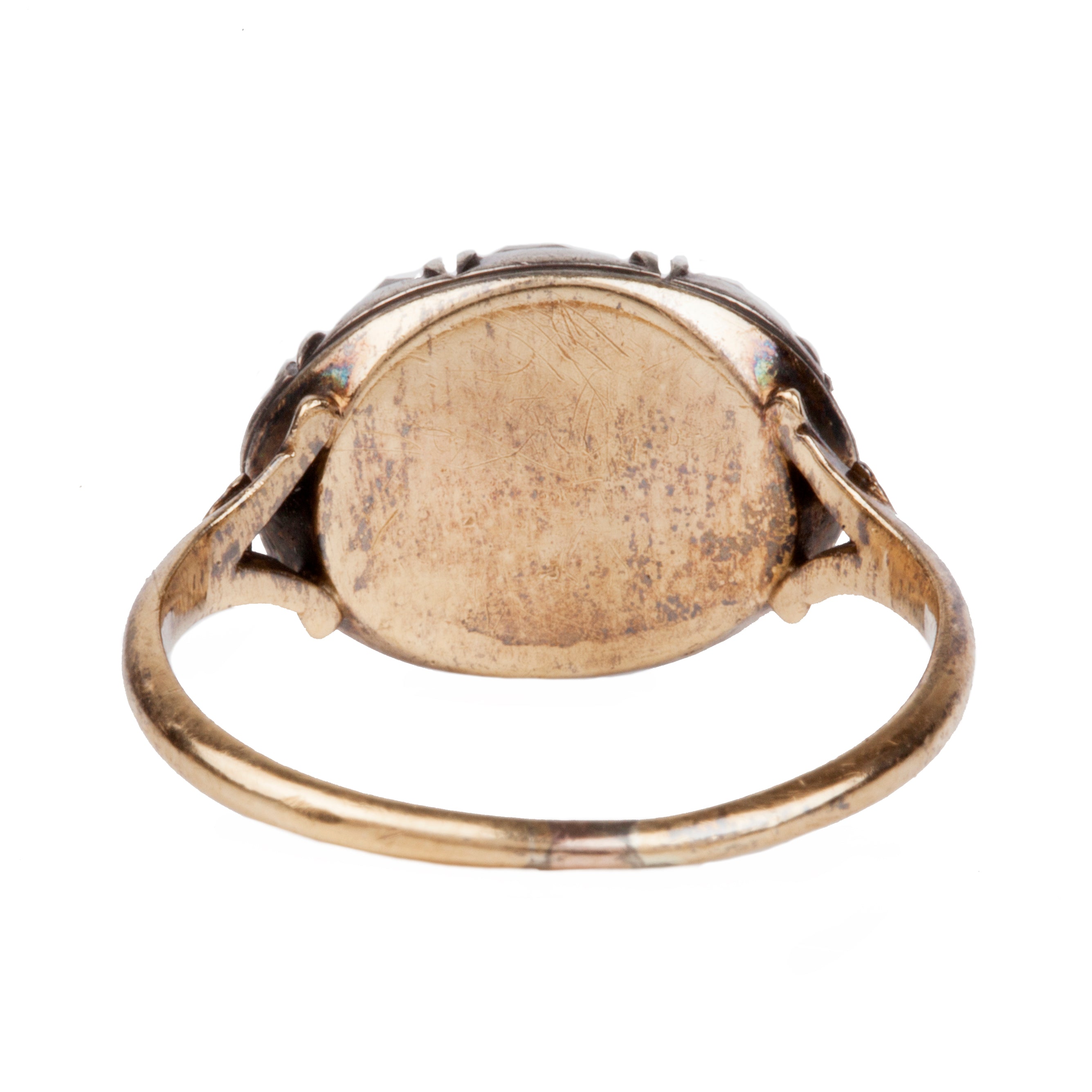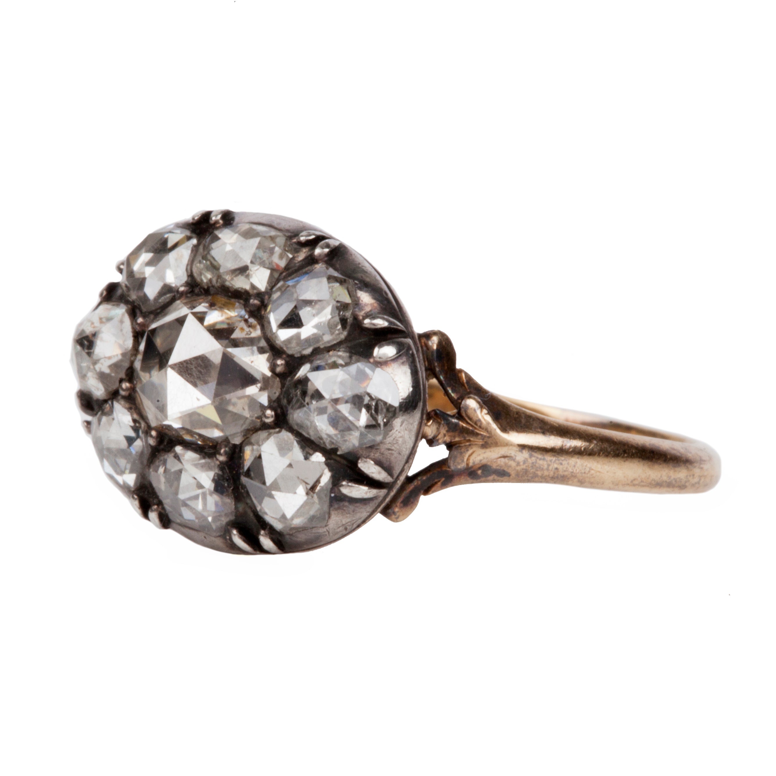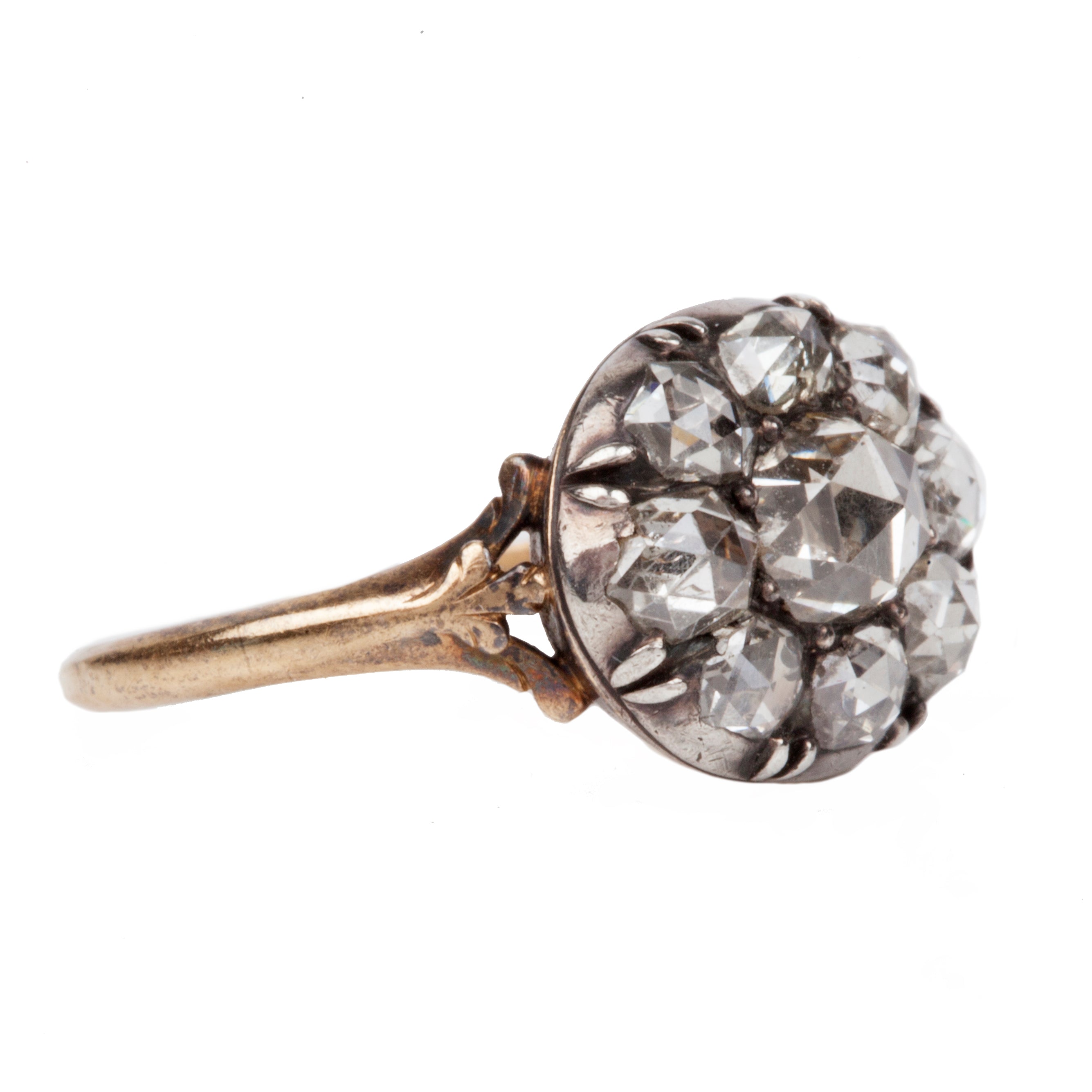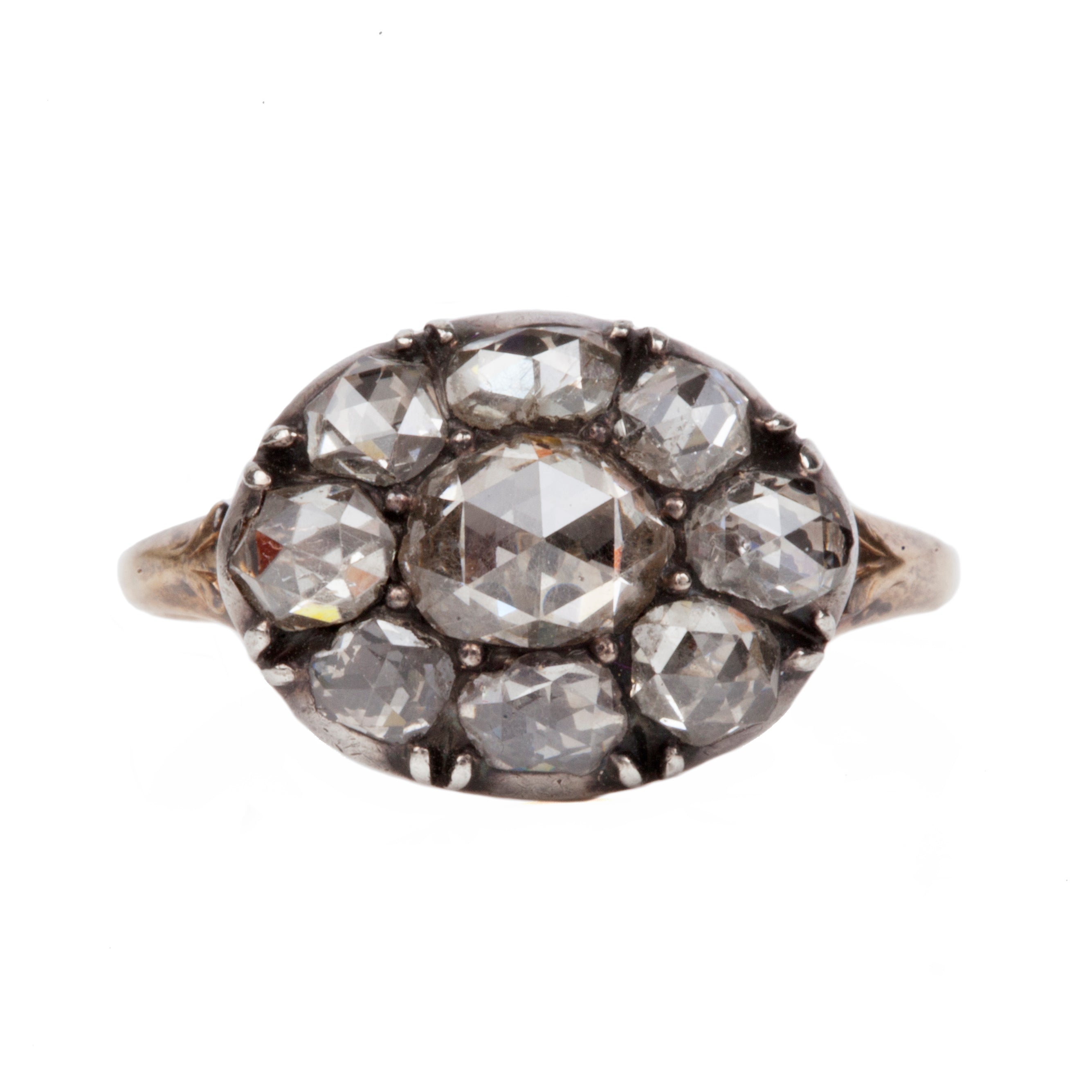 Georgian era diamond cluster ring. Nine rose cut diamonds are set in silver foiled back settings on an 18k gold shank, which is appropriate for the time period. English in Origin. Circa 1810.