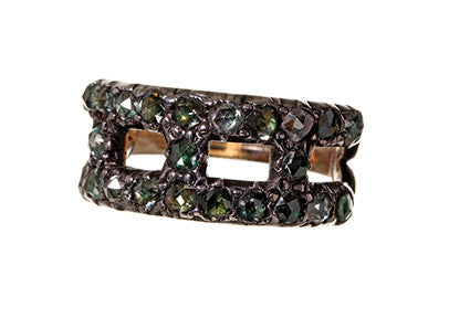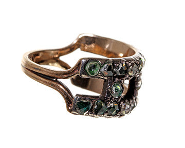 Circa 1800 rose cut diamond ring with 18k gold and silver mount. The foils behind the stones have oxidized to a brilliant green.