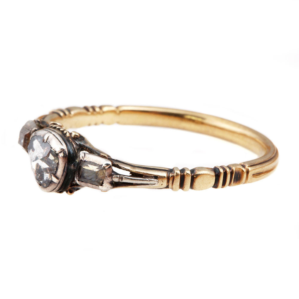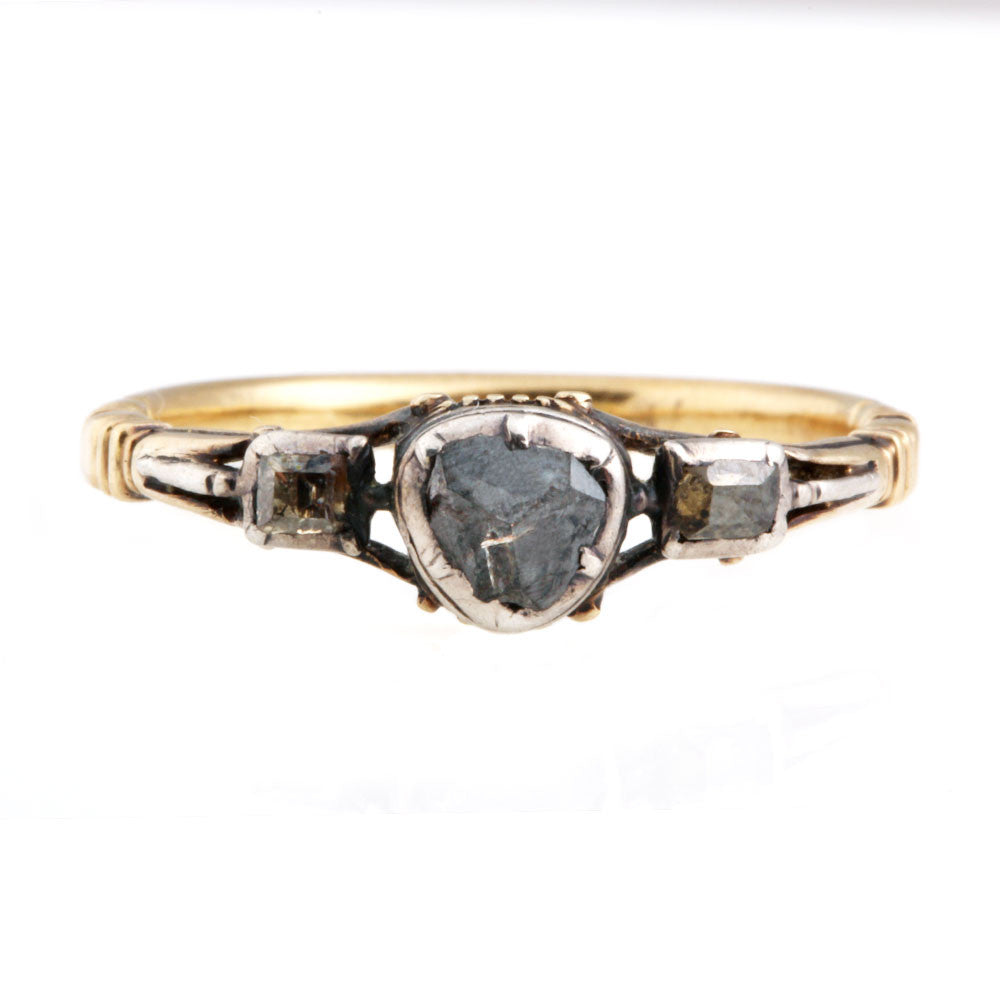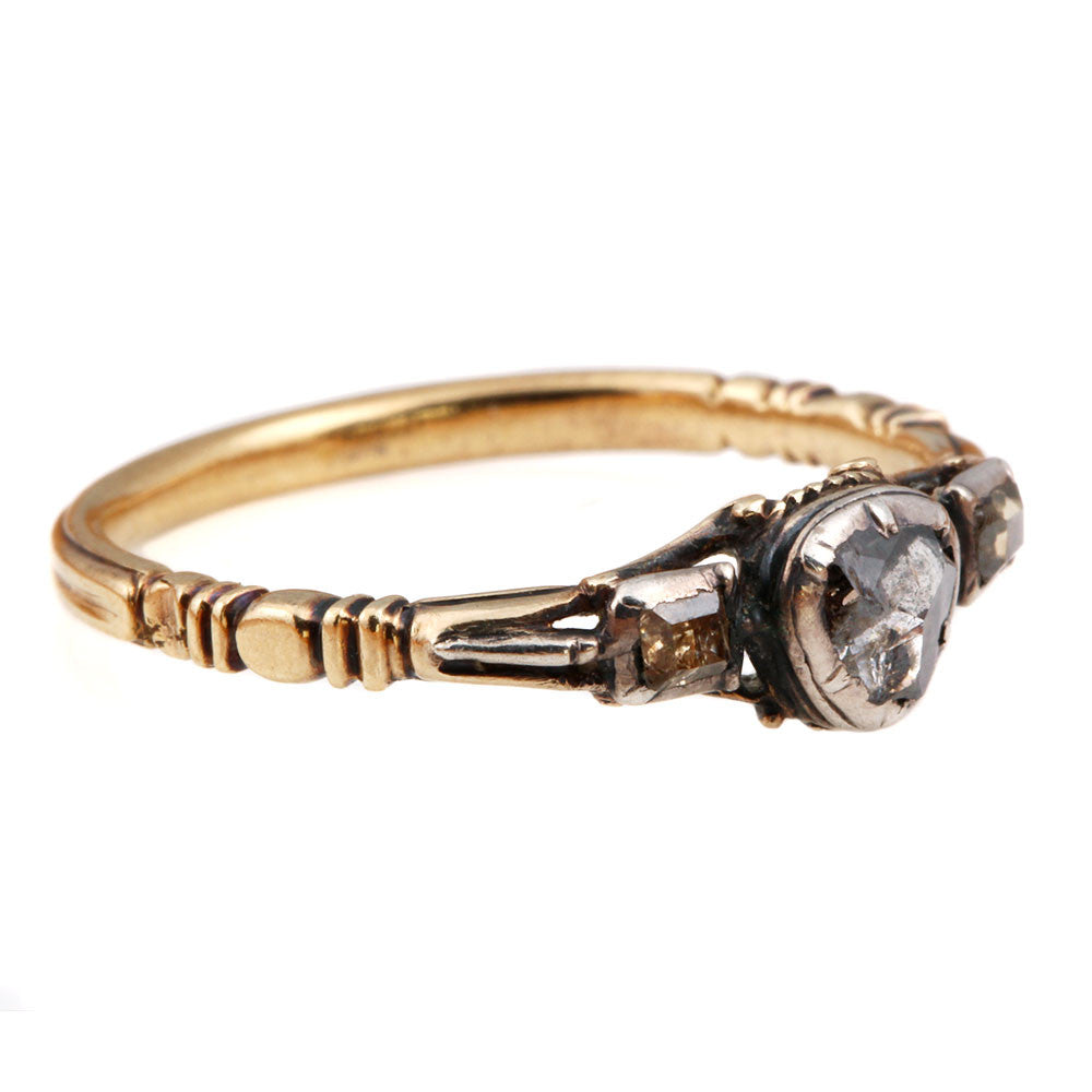 Mid 18th century mixed-cut diamond ring. The center rose cut diamond is flanked by two table cut stones. The stones are set in silver while the remainder of the ring is in 18k gold. The beautiful reeded back and all original details on the shank are intact and appear to be in original condition. English in origin, circa 1760.