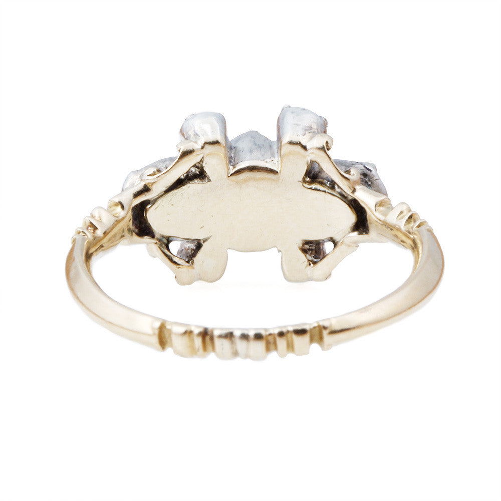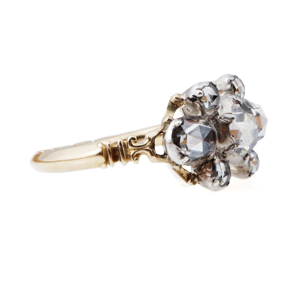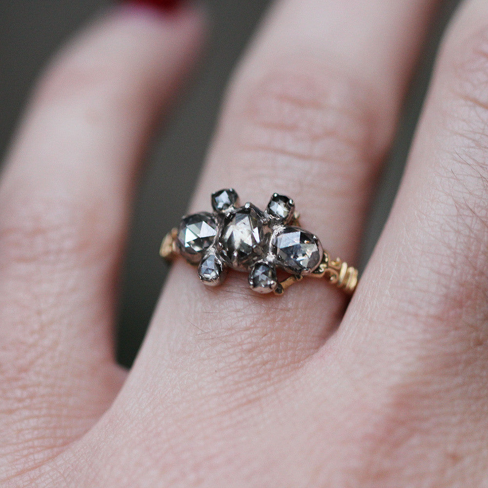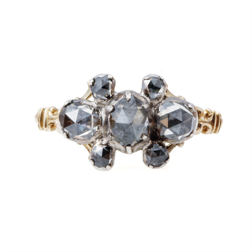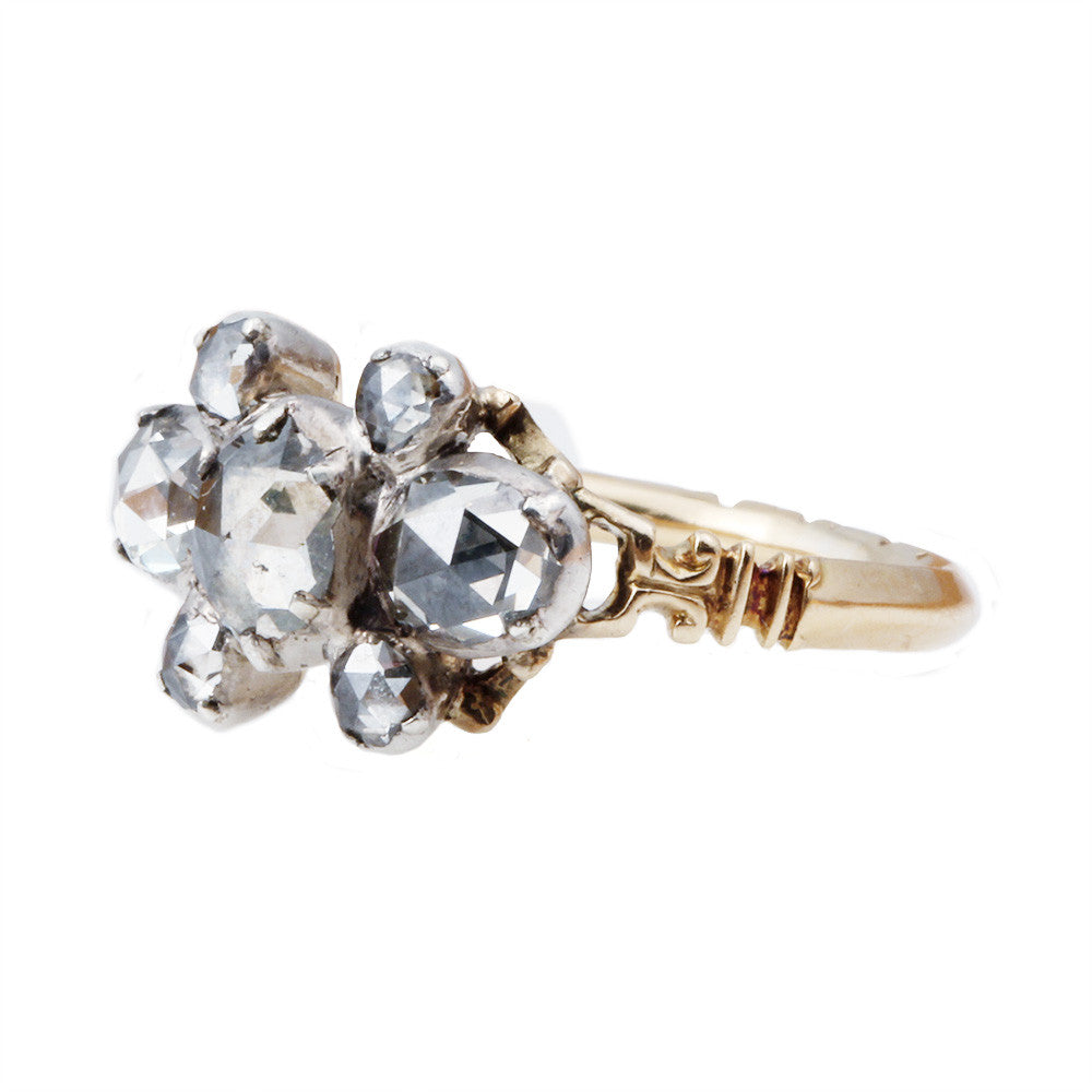 Georgian 7 stone rose cut diamond ring. Diamonds are set in closed back silver cut away settings on a rose gold band. Circa 1810, English in origin.