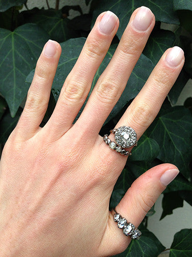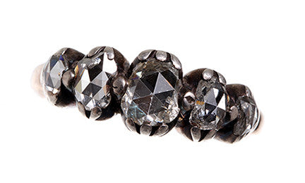 Size 9 can be sized. Shown on model with our Exceptional Georgian Old Mine Cut Diamond Cluster Ring and our Old Cut Diamond Band (available in-store only).