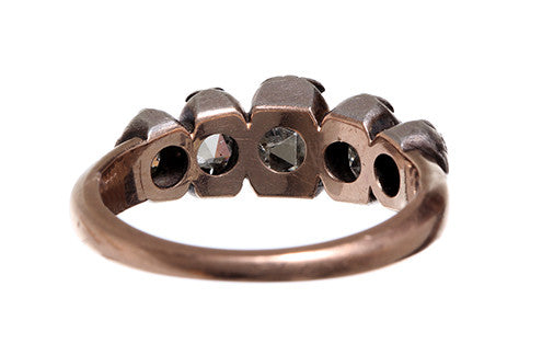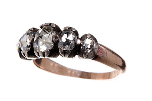Fantastic large scale Rose cut diamond half-hoop ring. Diamonds set silver and gold cut-away settings. Circa 1780-1810. What would have been originally closed and foiled backs have been opened making the ring more wearable.