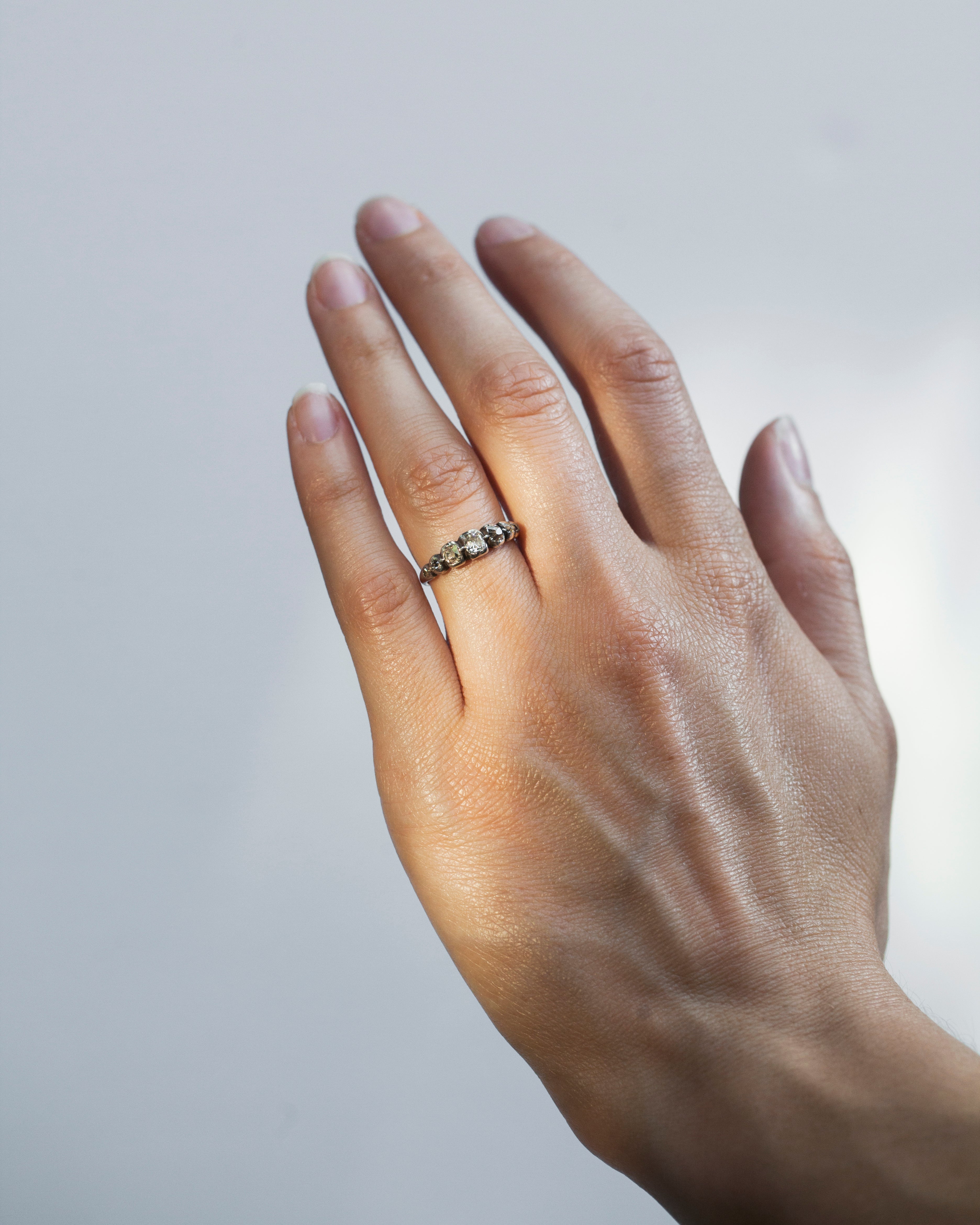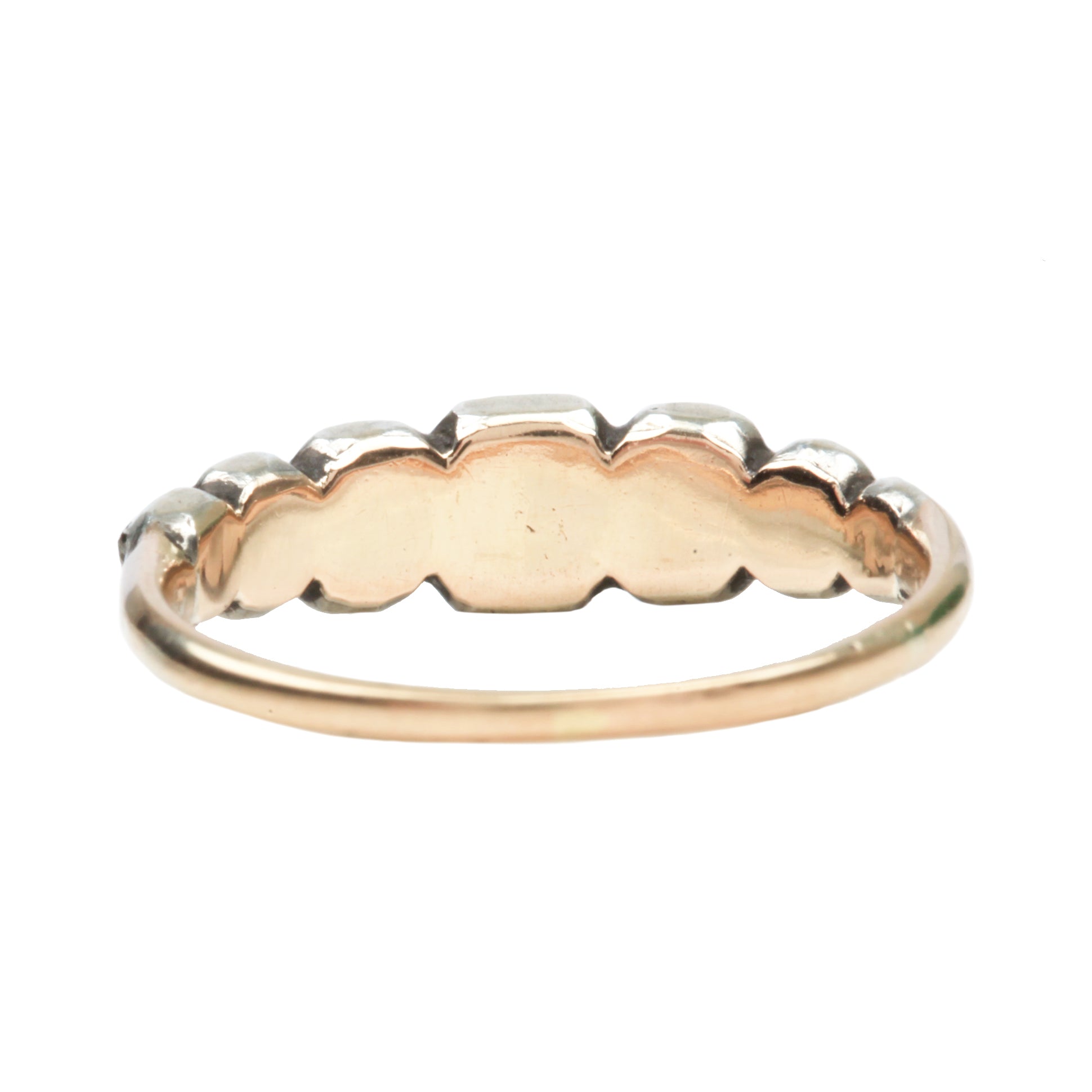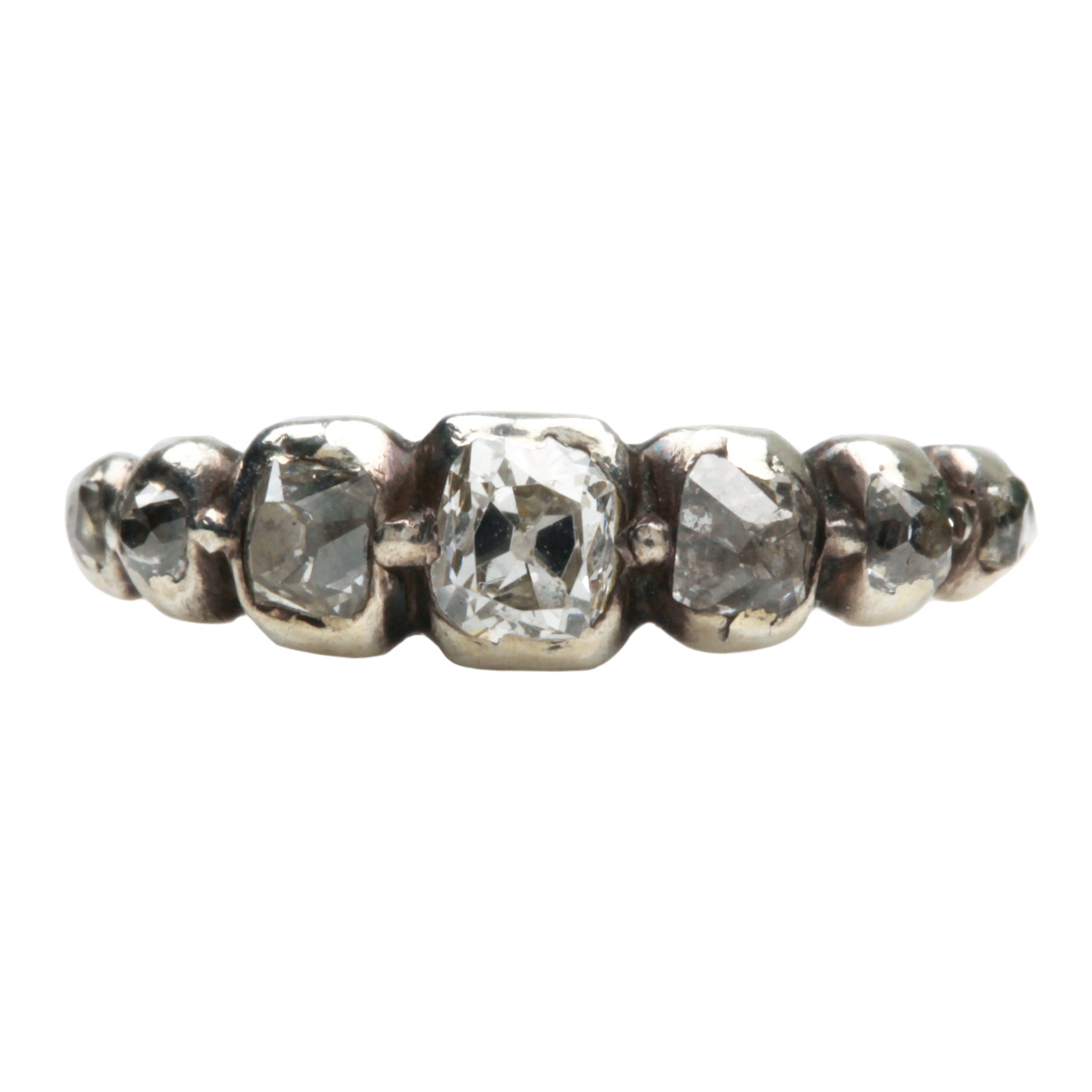 Georgian era seven stone Old Mine Cut diamond ring. Old Mine diamond is foil backed and set in a cut-away silver setting which is of the period style. Circa 1790. English in origin.