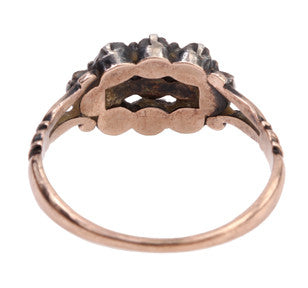 Circa 1760-1810 European 9k gold and silver ring with table cut diamonds.
