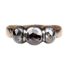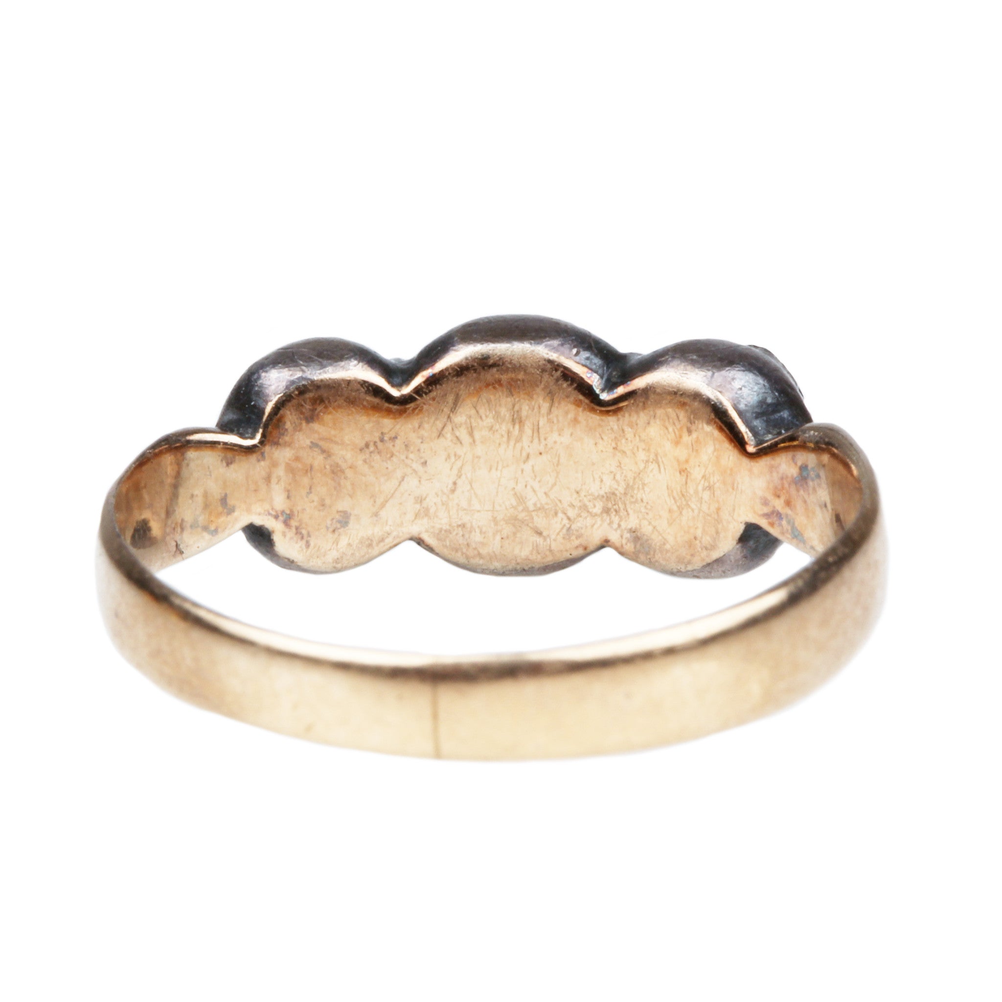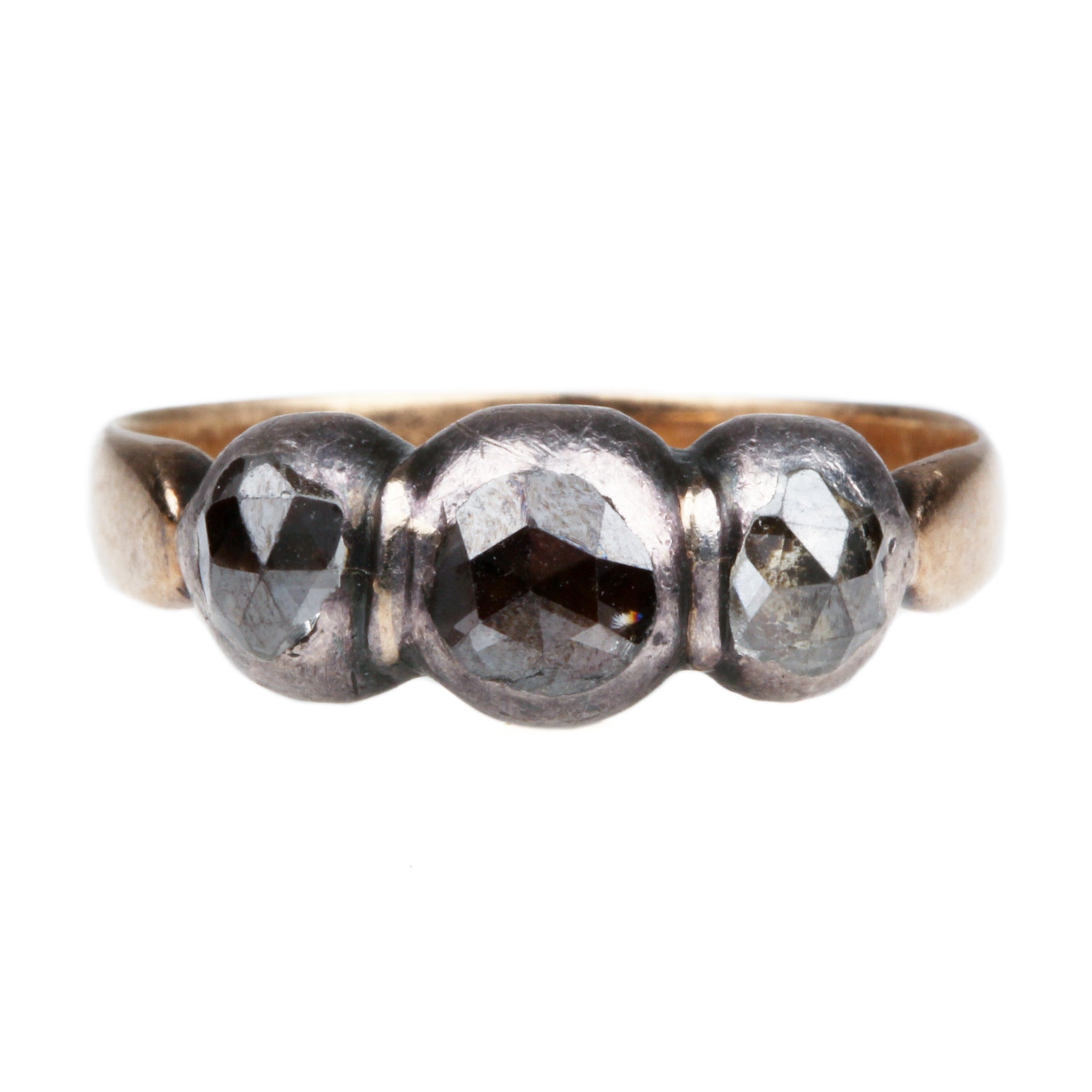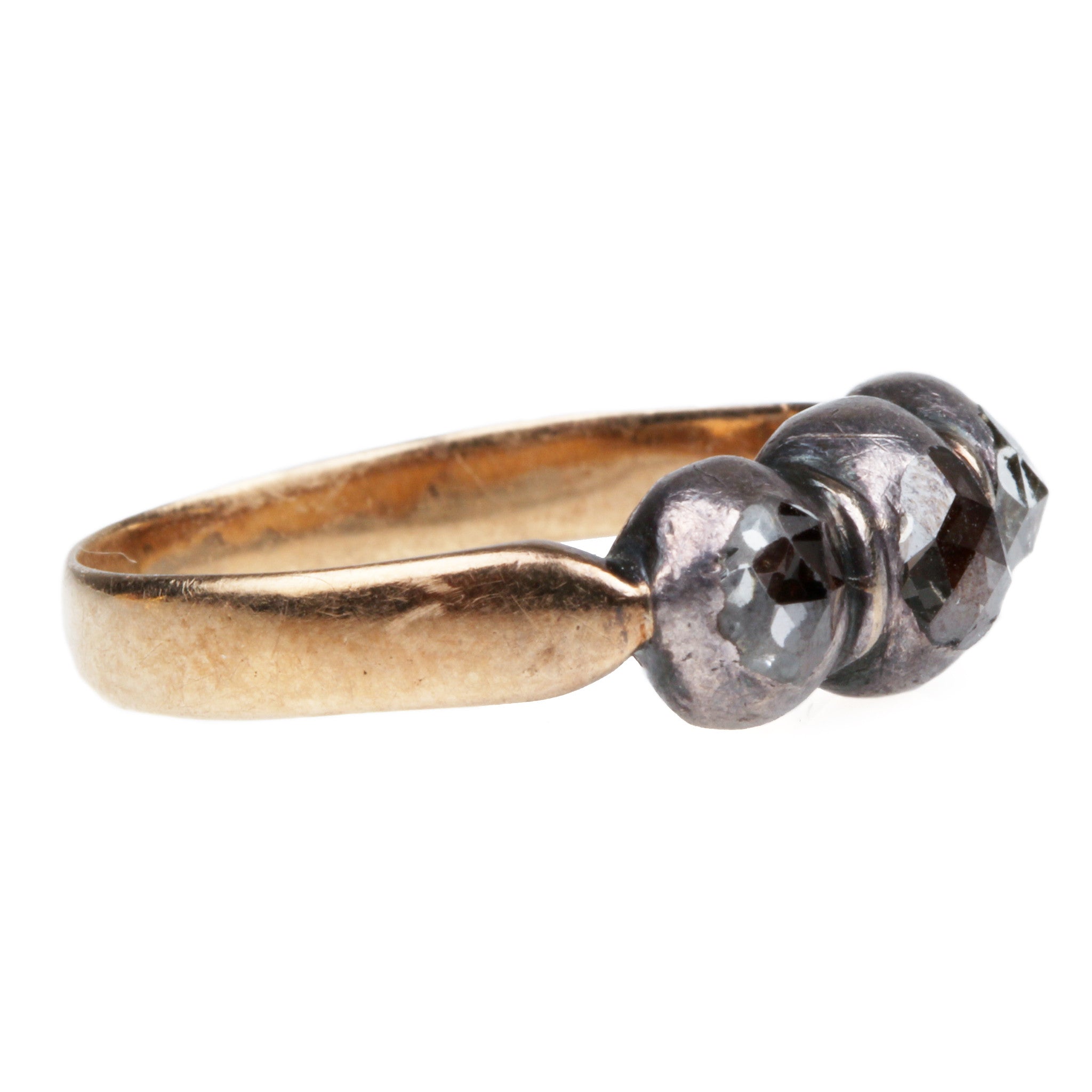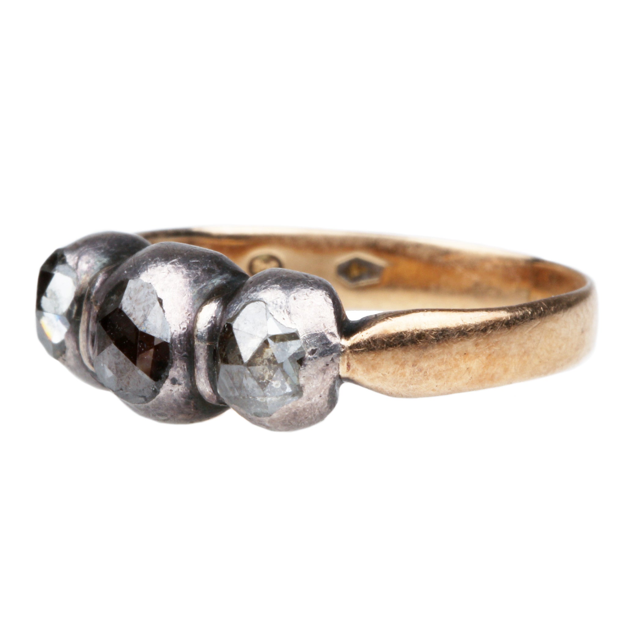 Early 19th Century diamond ring. Three rose cut diamonds are set in silver cut away settings with an 18k gold shank. English in origin, Circa 1810.