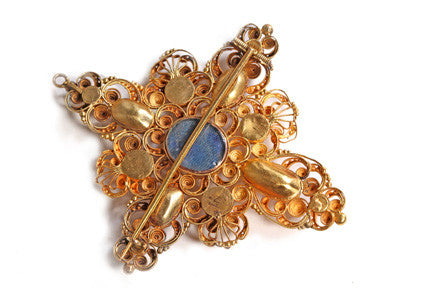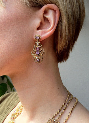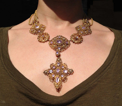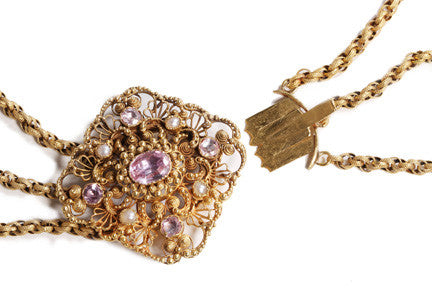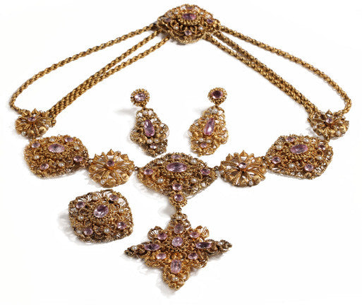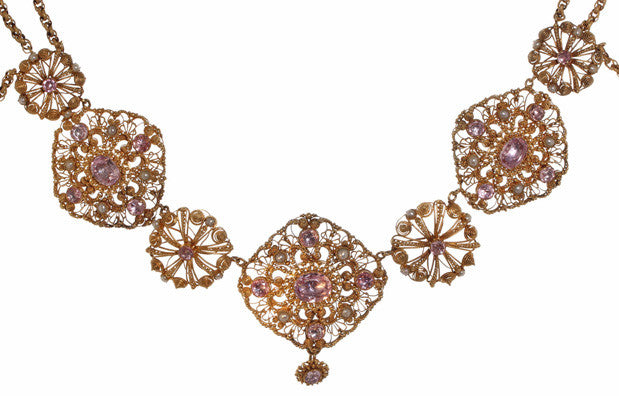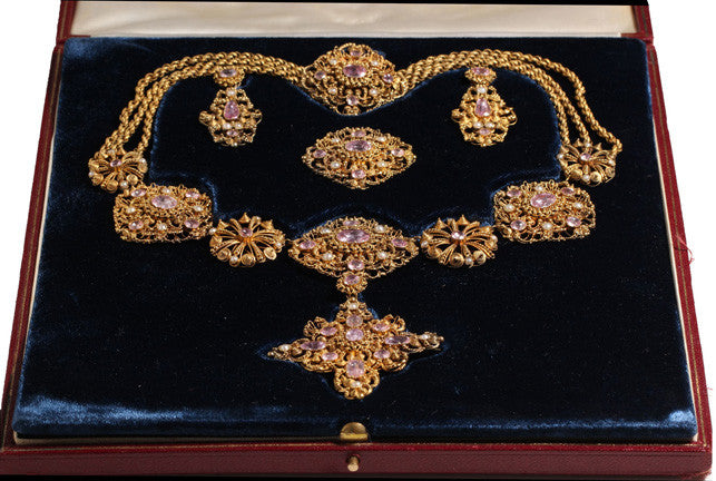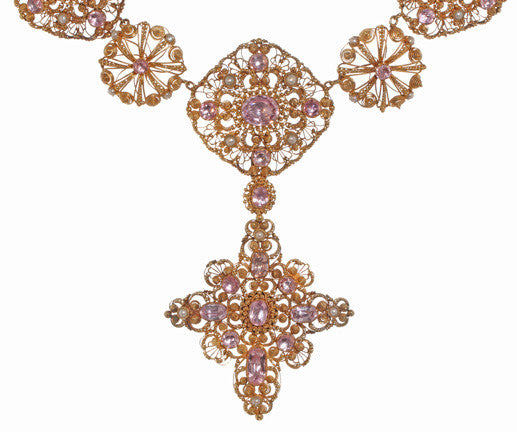 Circa 1820/30. This 18k gold cannetille parure with pearls and natural pink topaz includes: earrings necklace brooch and detachable cross pendant that can be worn as an additional brooch. There is a hidden locket on the reverse of the cross pendant.