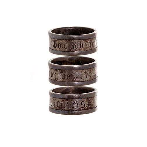 Gold gab ich fur eisen translates to I gave gold for iron It is a patriotic symbol and a piece of social history. A woman would have given her gold wedding band and been given this iron ring in exchange. See similar ring at the Imperial Wars Museum in London.