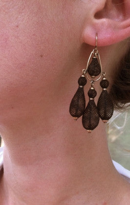 Hair was used in sentimental exchange and for friendship tokens as much as memorializing the dead. Hairwork was a popular tradition in Europe and America through about 1870. These are a rare example of hairwork earrings.