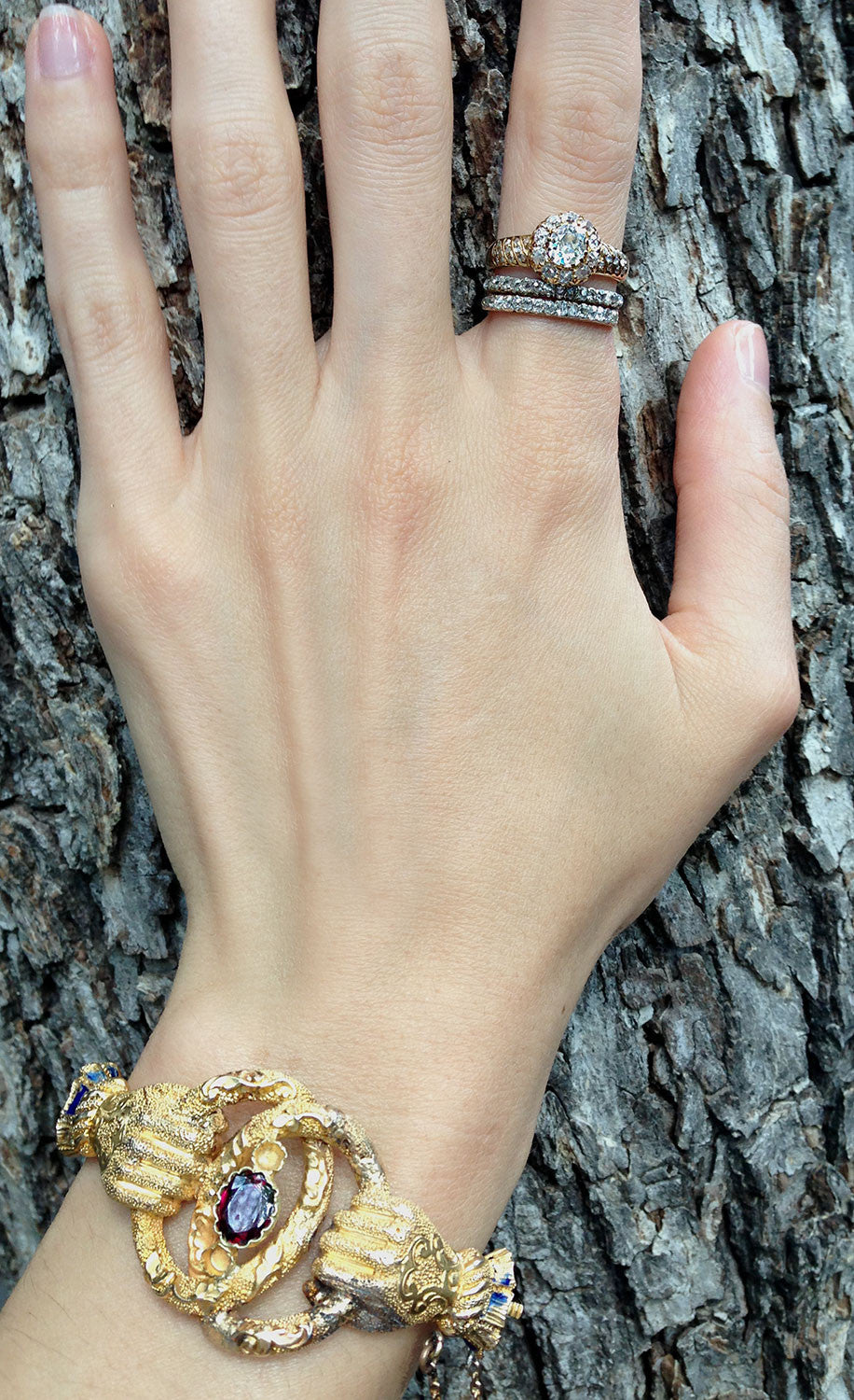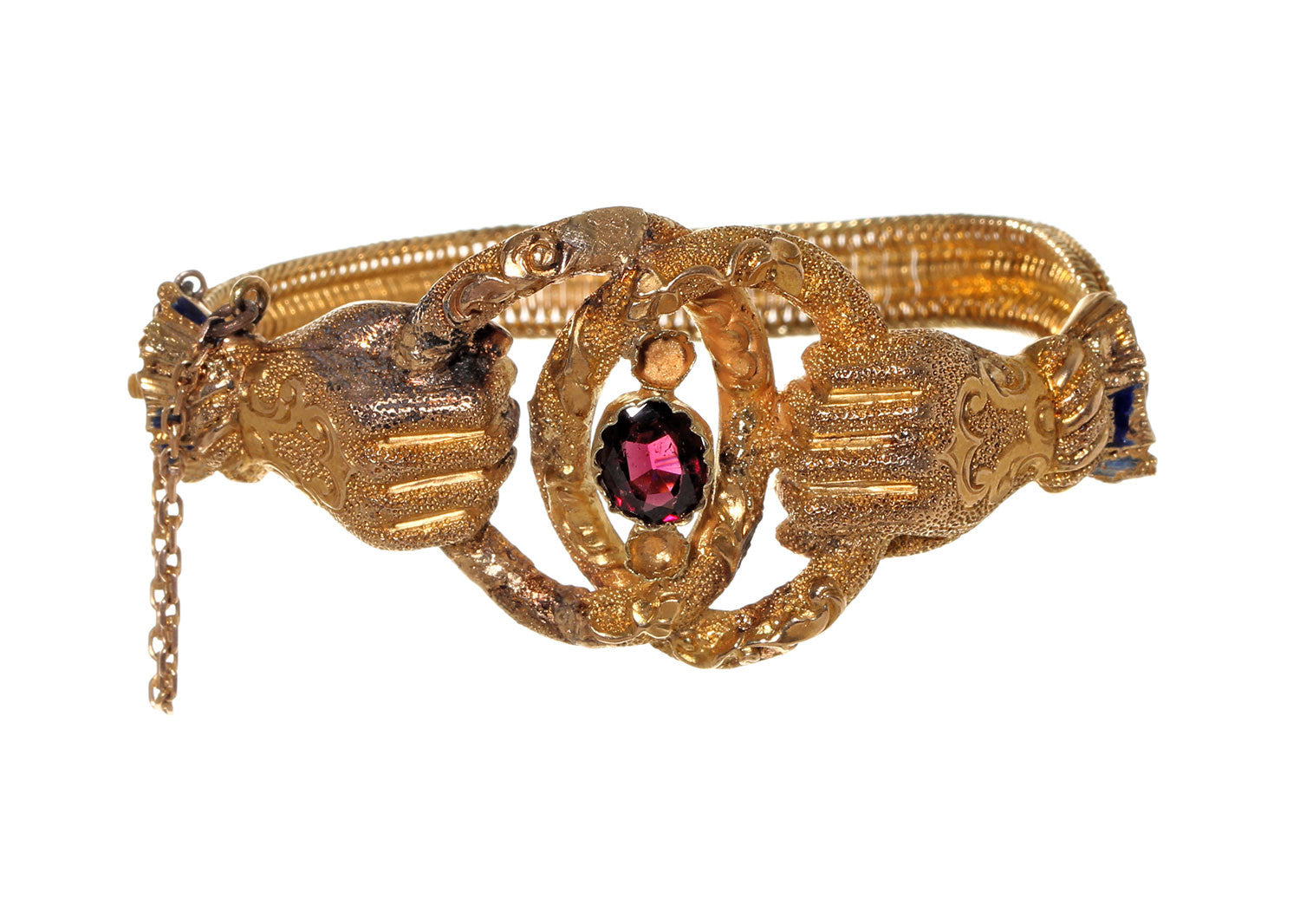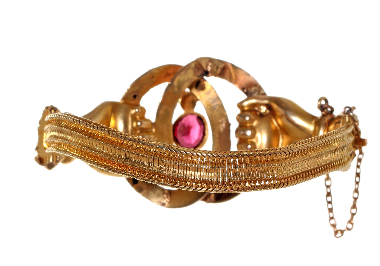 Victorian era Clasped hands bracelet. Two gloved hands are clasping interlocking rings. One garnet stone, in 14k Gold. Clasped hands were often used in 19th century jewelry as symbols of friendship and loyalty.