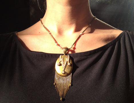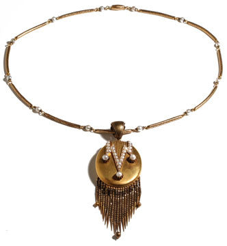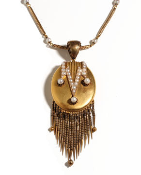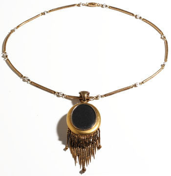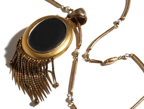 Made in 15k Gold with a beautiful 150+ year old patina. Could easily be polished to a bright finish if preferred. Original glass in tact on reverse. All fringe present and perfect. Found in London.