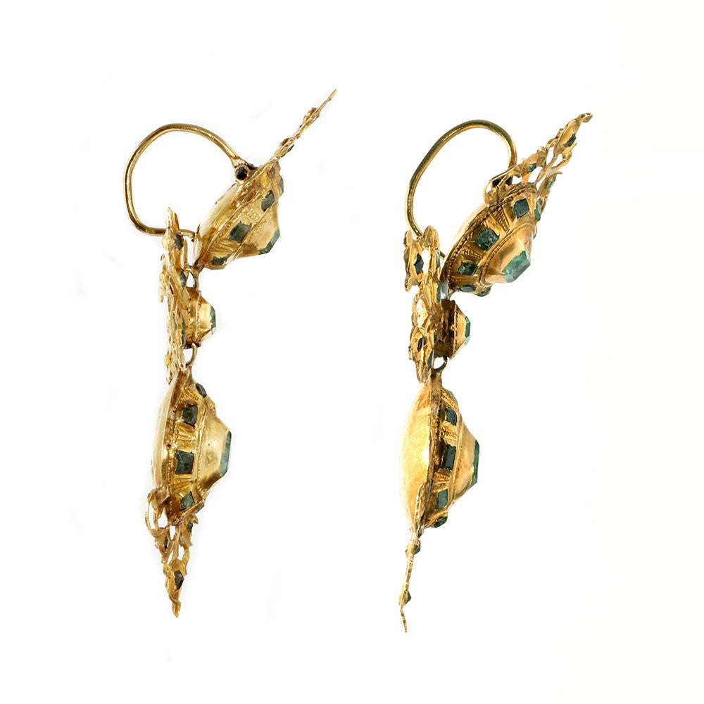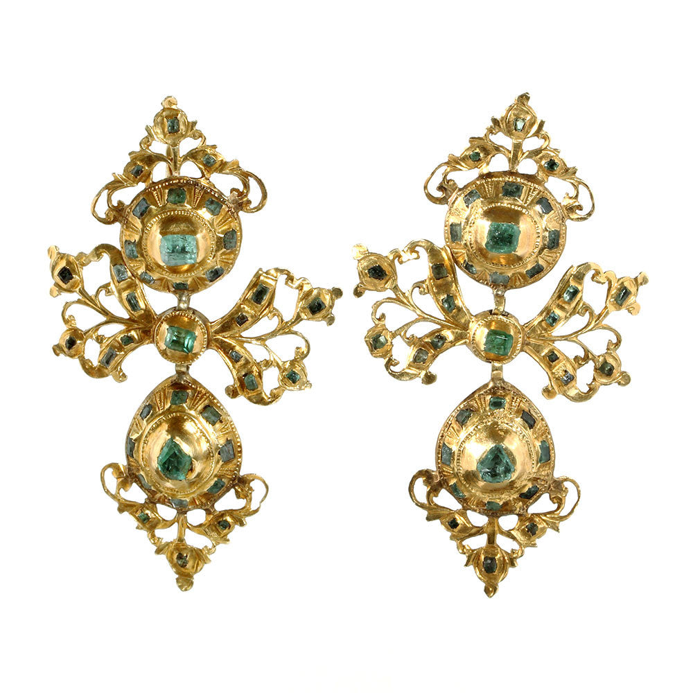 Circa 1780, these earrings are Spanish in origin. Hand made in 18k gold and emeralds, most probably sourced in colonial mines in Columbia and Peru. Original ear wires in a Lazo design, the Spanish word for bow, they are a variation on the pendeloque drop. When worn in the Spanish court, they would have been accompanied by a large ribbon shaped bodice ornament.