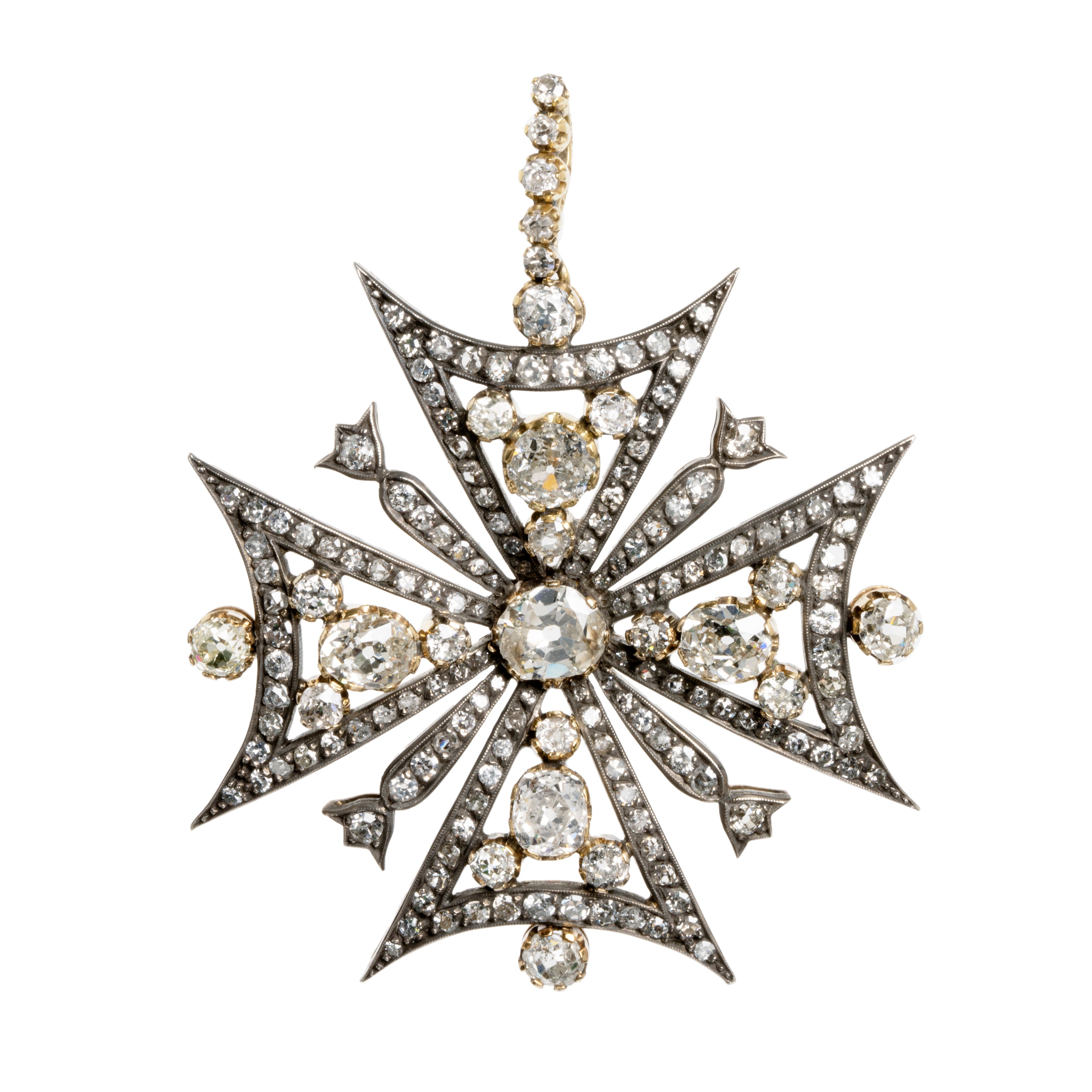 Large diamond pendant with approximately 8.4 carats of mixed antique cut diamonds. 175 Old mine cut and old European cut diamonds are set in silver on 14k gold, typical of the time period. Imperial Russian hallmarks. Circa 1898-1908.