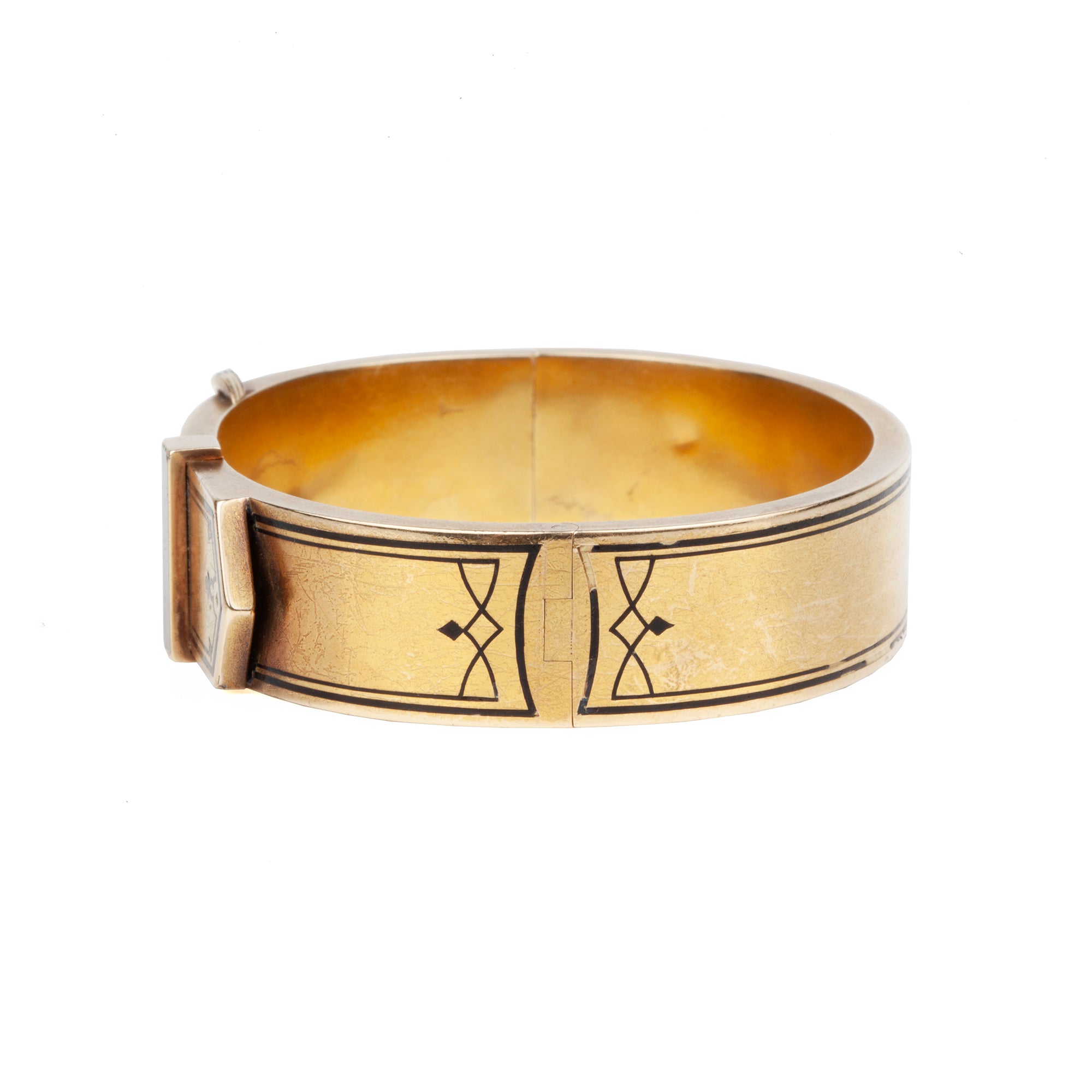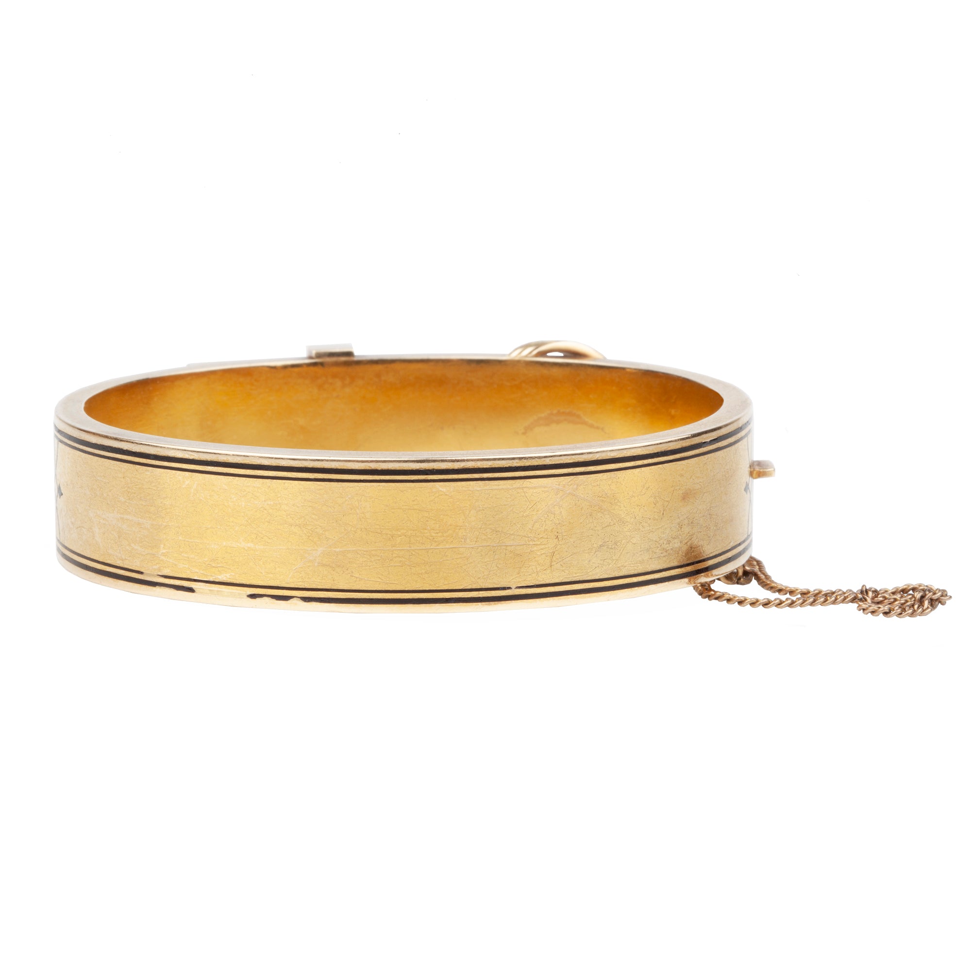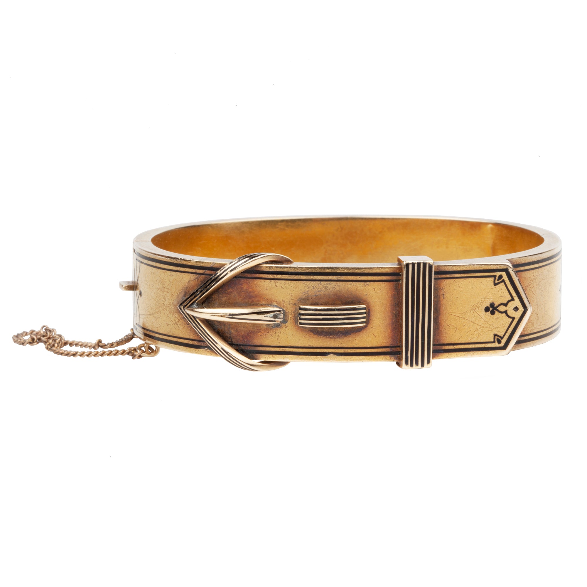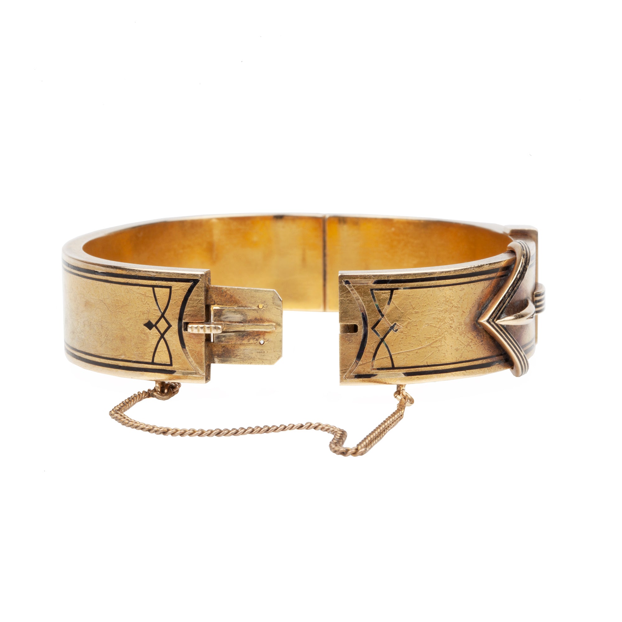 Late 19th-century buckle bangle with striped black enamel detail. Light in weight in 14k gold with a rich patina. Circa 1880.
