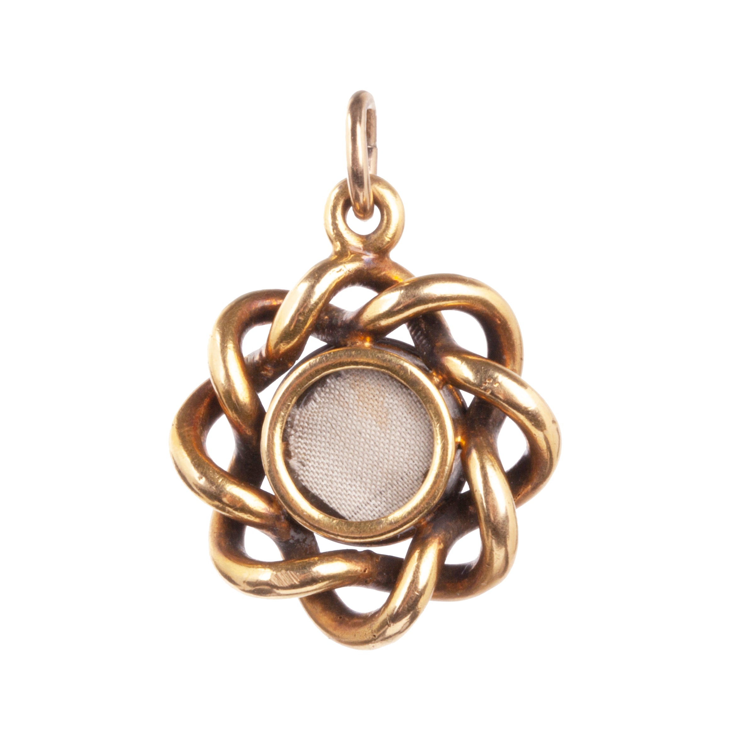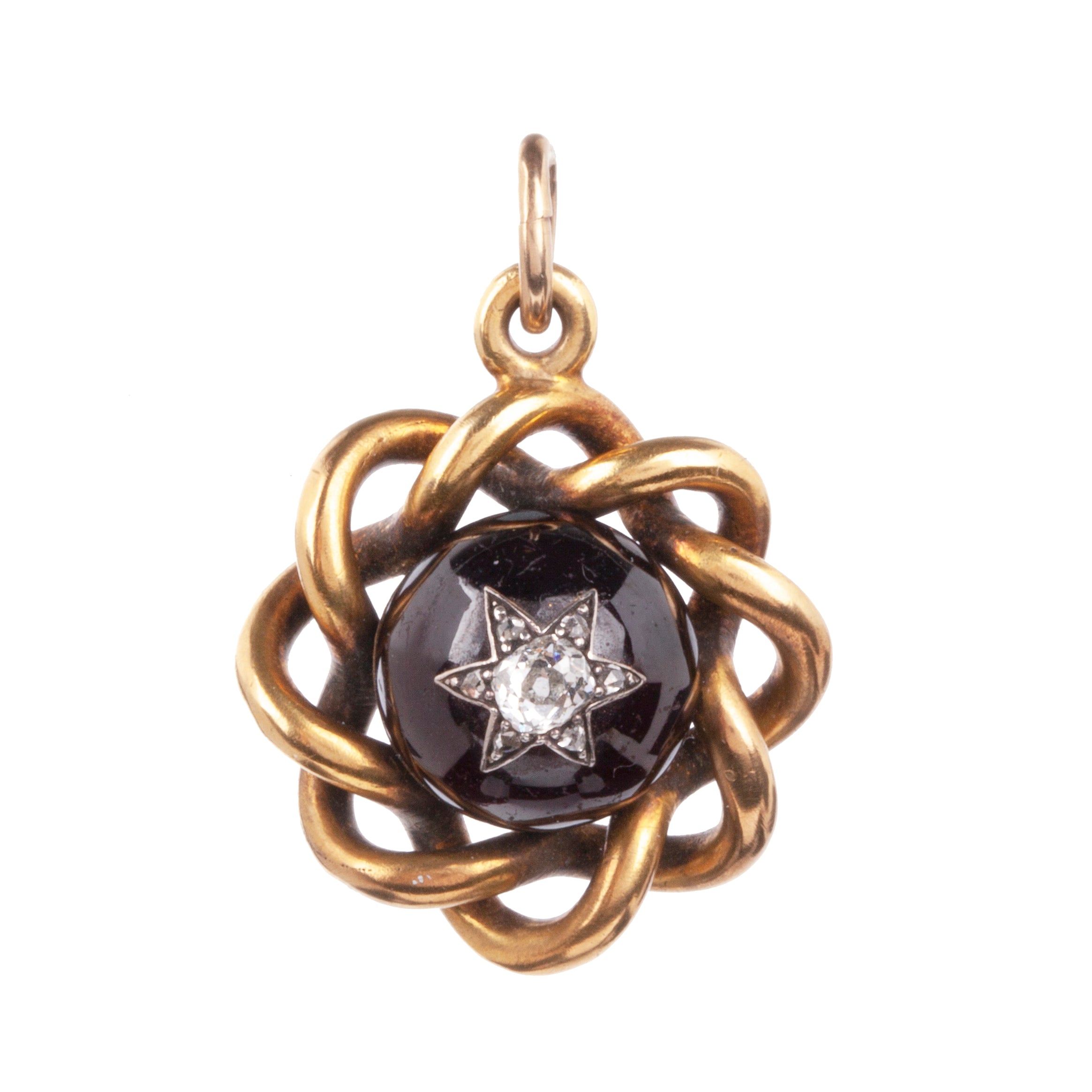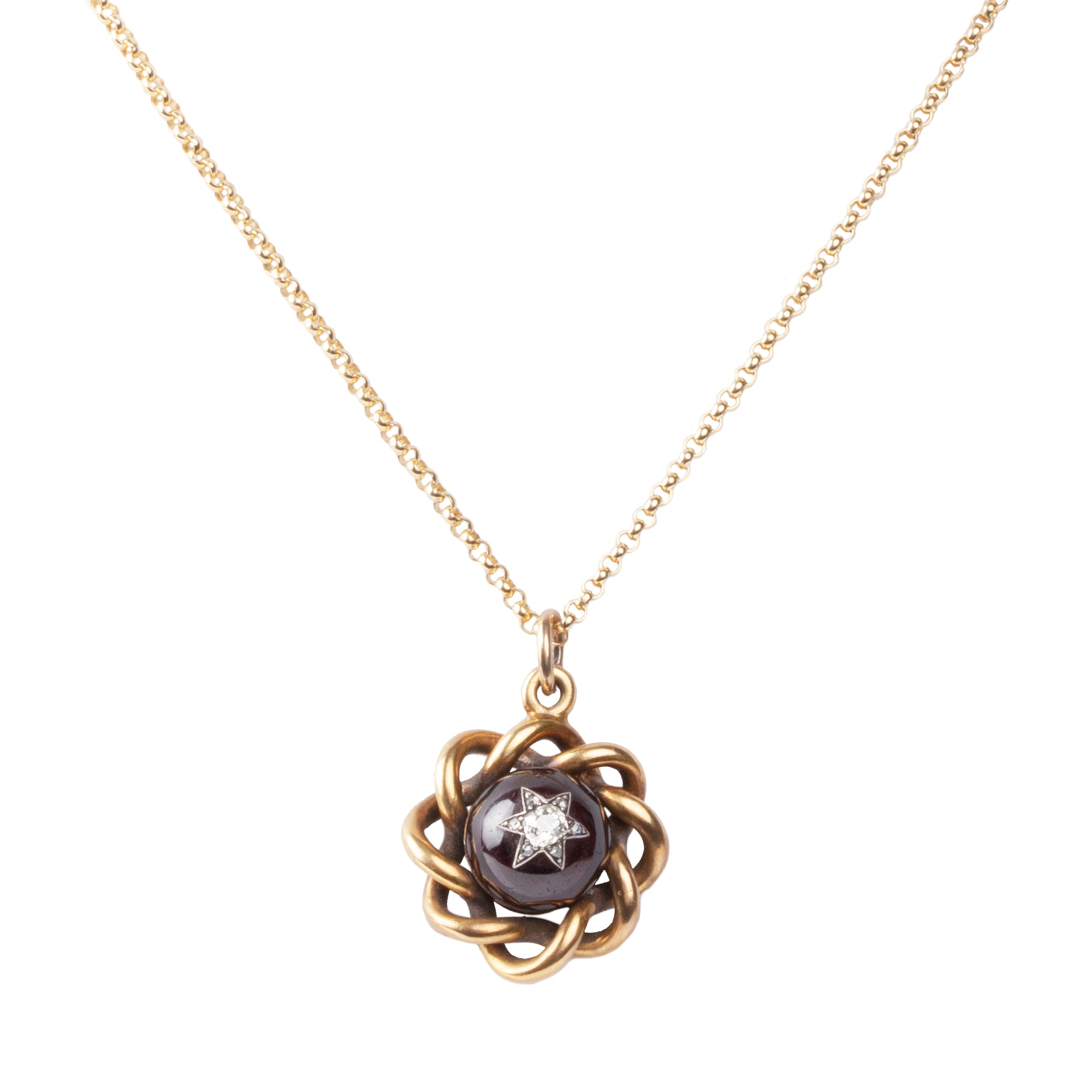 Later 19th century garnet and diamond locket, in 9kt gold. Garnet cabochon set with old mine cut and rose cut diamond star burst. Gemstones surrounded by gold twist circle detail. The original glass intact. English in origin. Circa 1890.