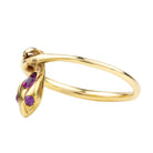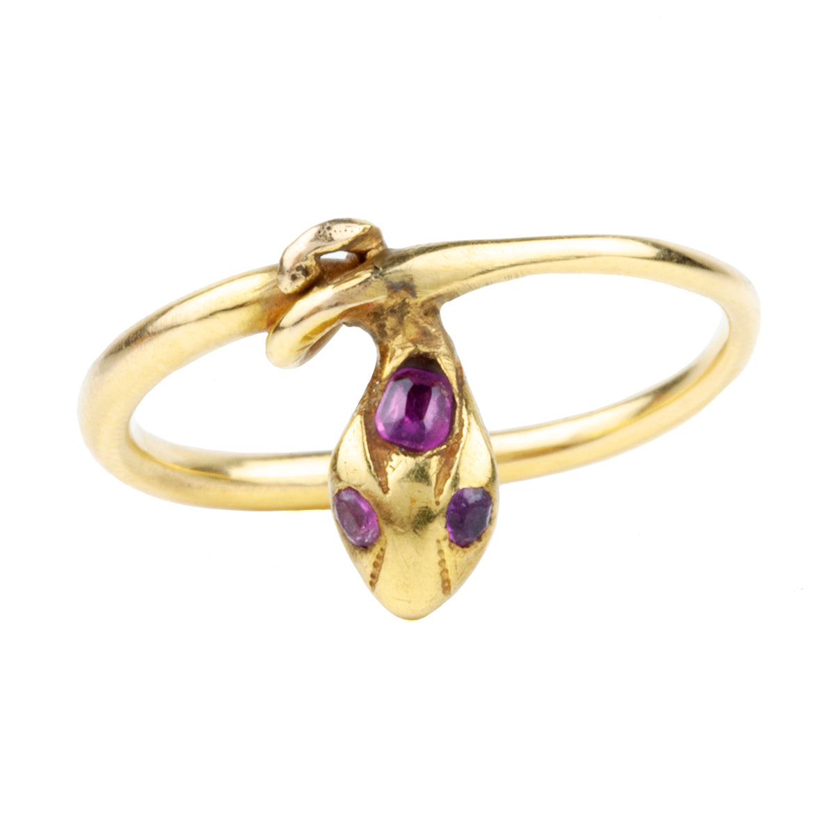A delicate 19th century snake ring set with three natural rubies in 18k gold. English in origin. Circa 1870. The body of the snake encircles the finger with the tail coiling around the neck. Each ruby is bright and rich in color.
