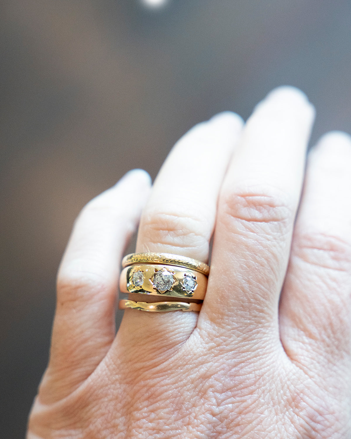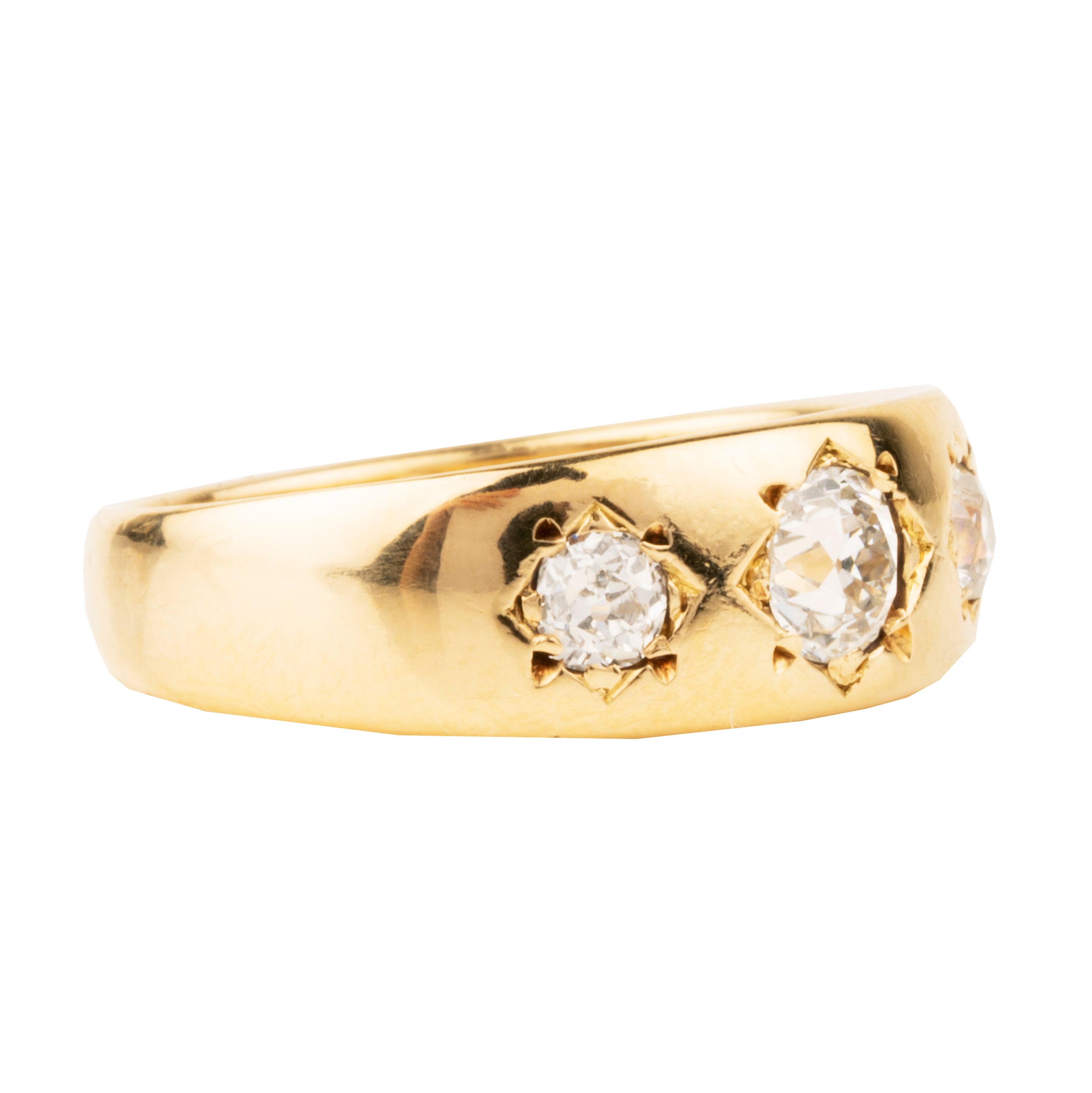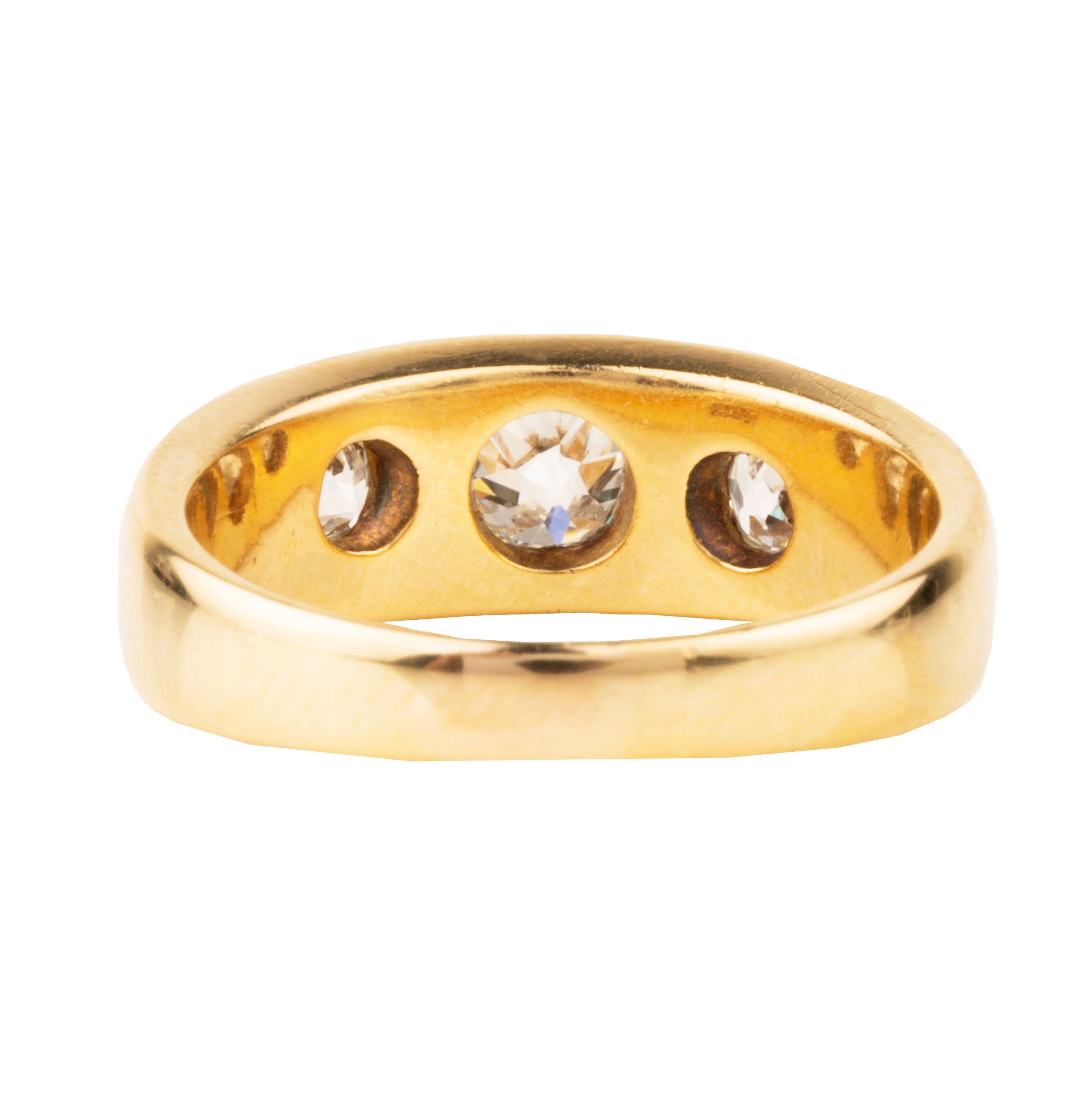 Late Victorian era three stone diamond ring, in 18k gold. Three old mine cut diamonds flush set in band. English Hallmarks. Found in Ireland. Circa 1900.