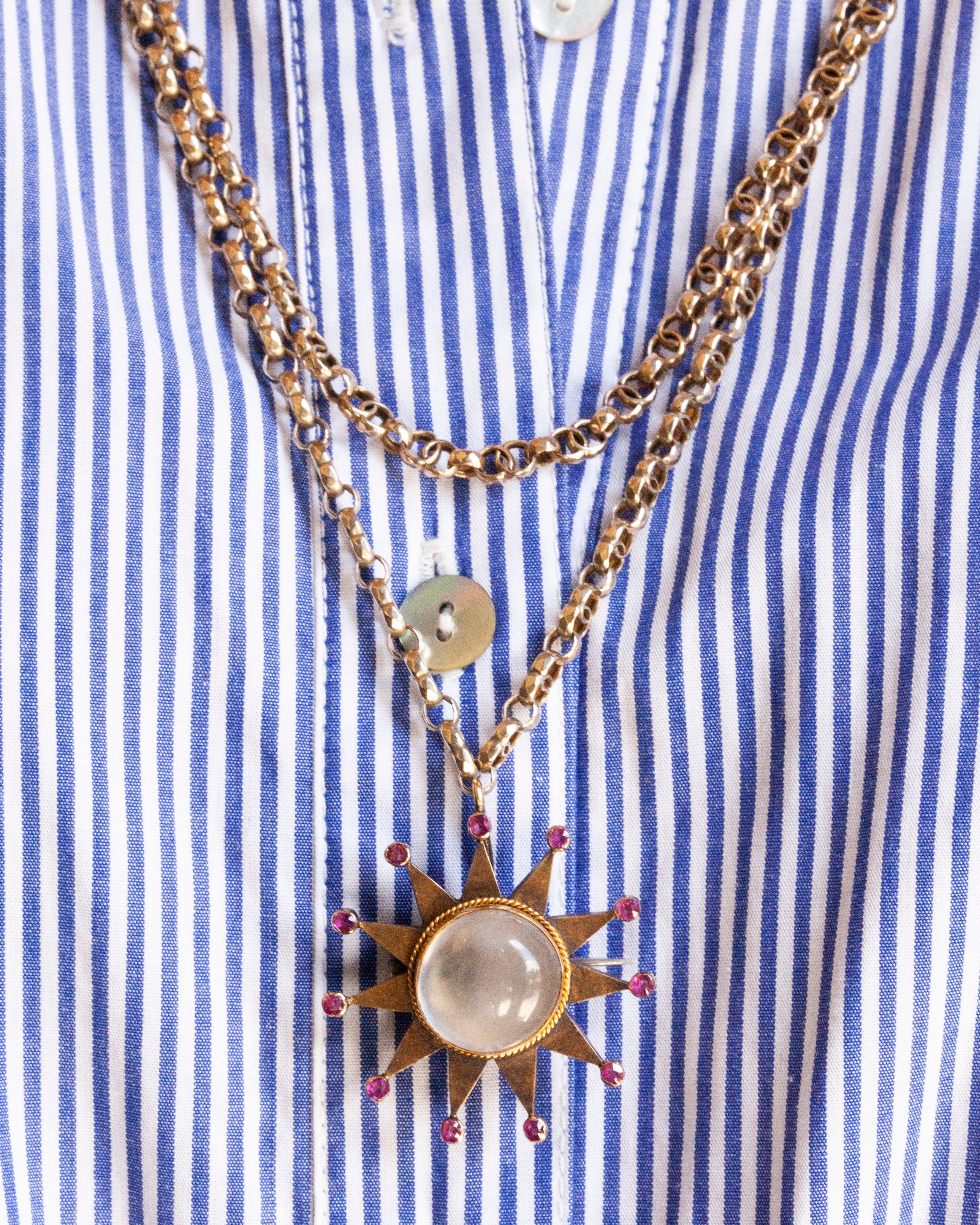 Measures in 2" across. The pendant hangs on a Victorian 9k gold chain, which is sold separately. Please email us at info@bellandbird.com for chain options.