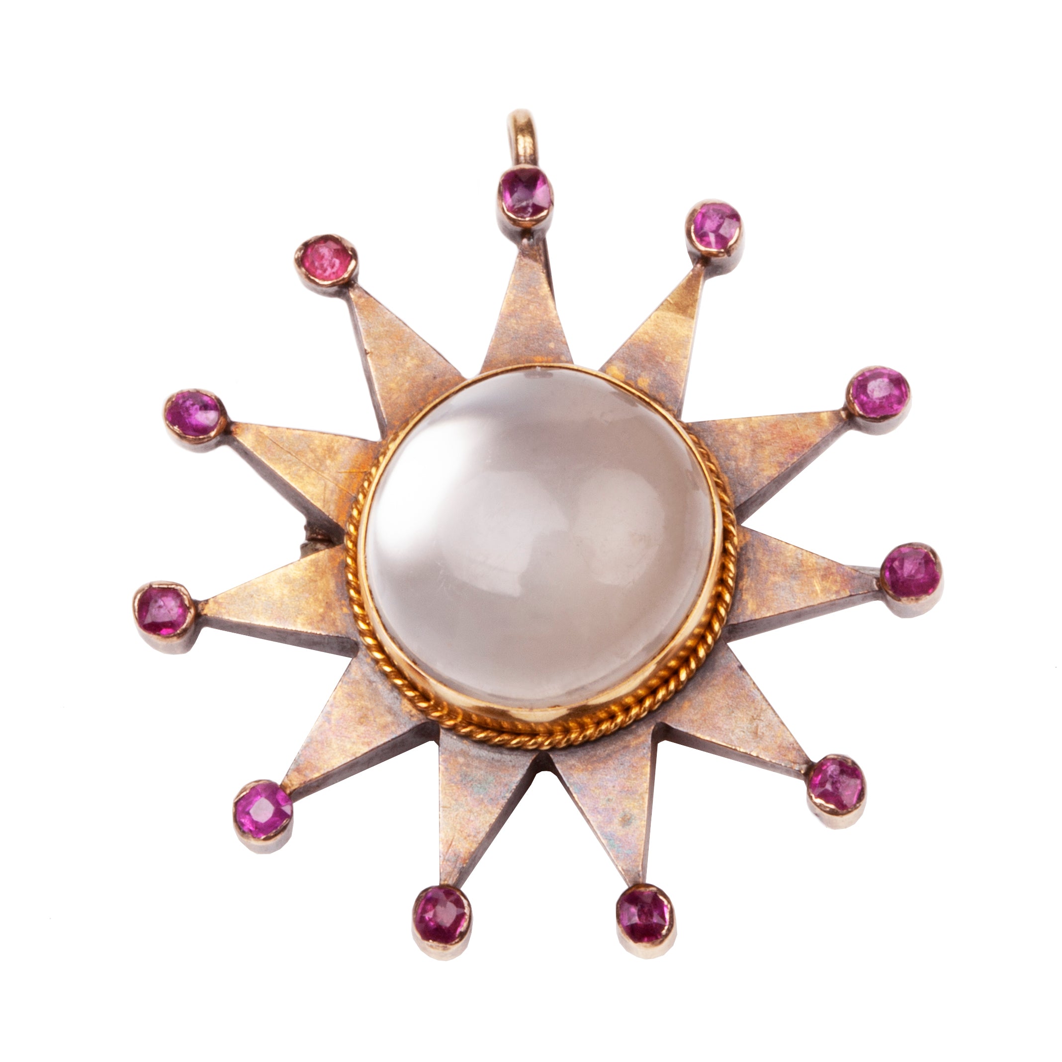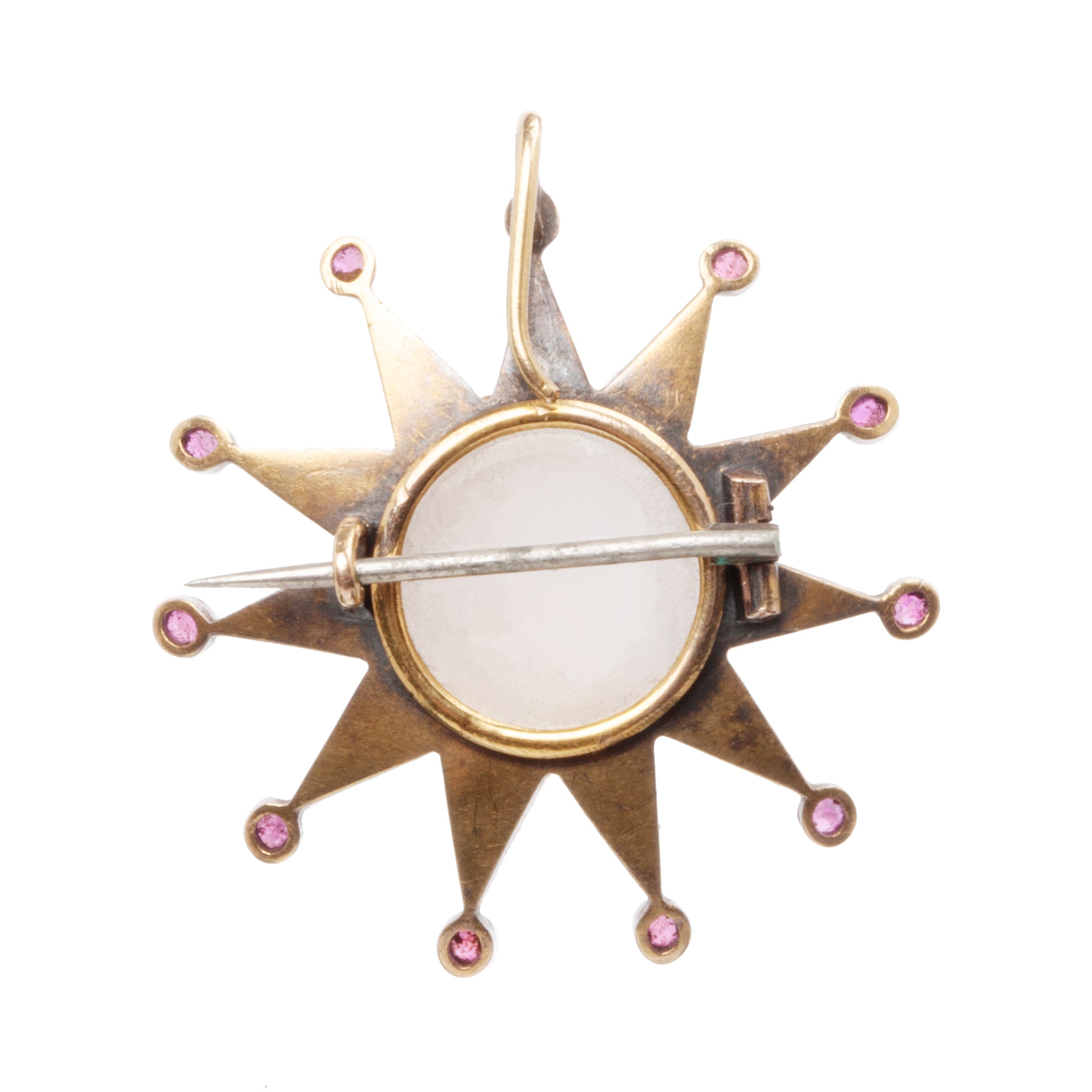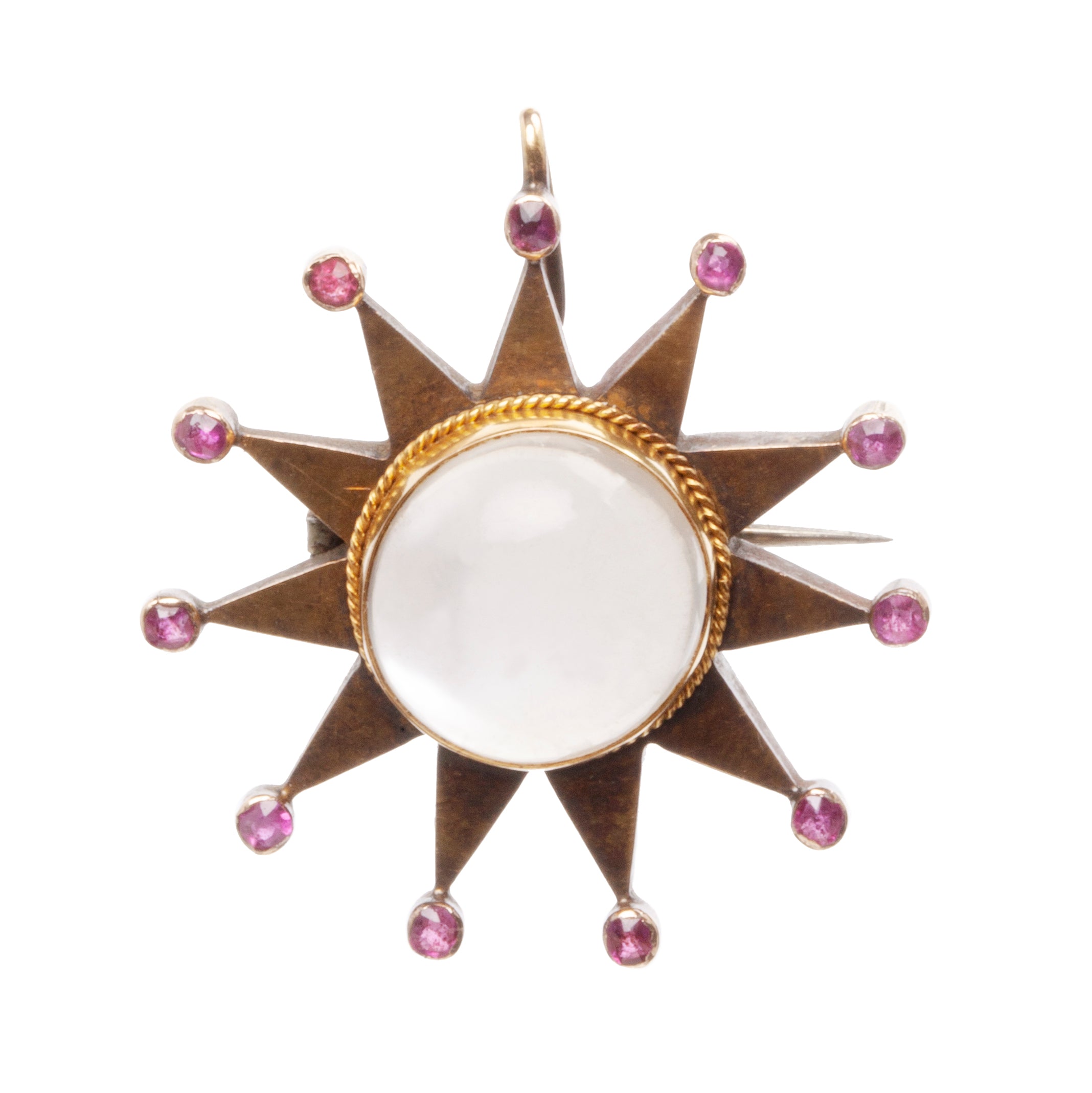 Late Victorian Moonstone and Ruby Star Pendant, in gold. Original brooch fixture is attached. English in Origin.