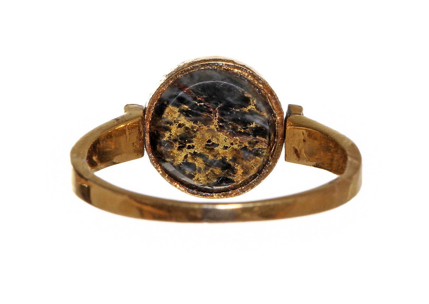 Mid 19th century Victorian era Gold in Quartz ring that spins to reveal an & onyx panel with the letter "A" in rose cut diamonds. The ring is set with a polished specimen of natural quartz containing pure gold ore.