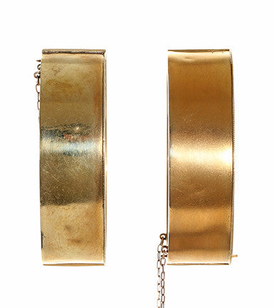 Sold as a set. Each is hinged at side with push-tab closures and security chains. Each bangle measures .75" wide with an inner circumference of 6.1".