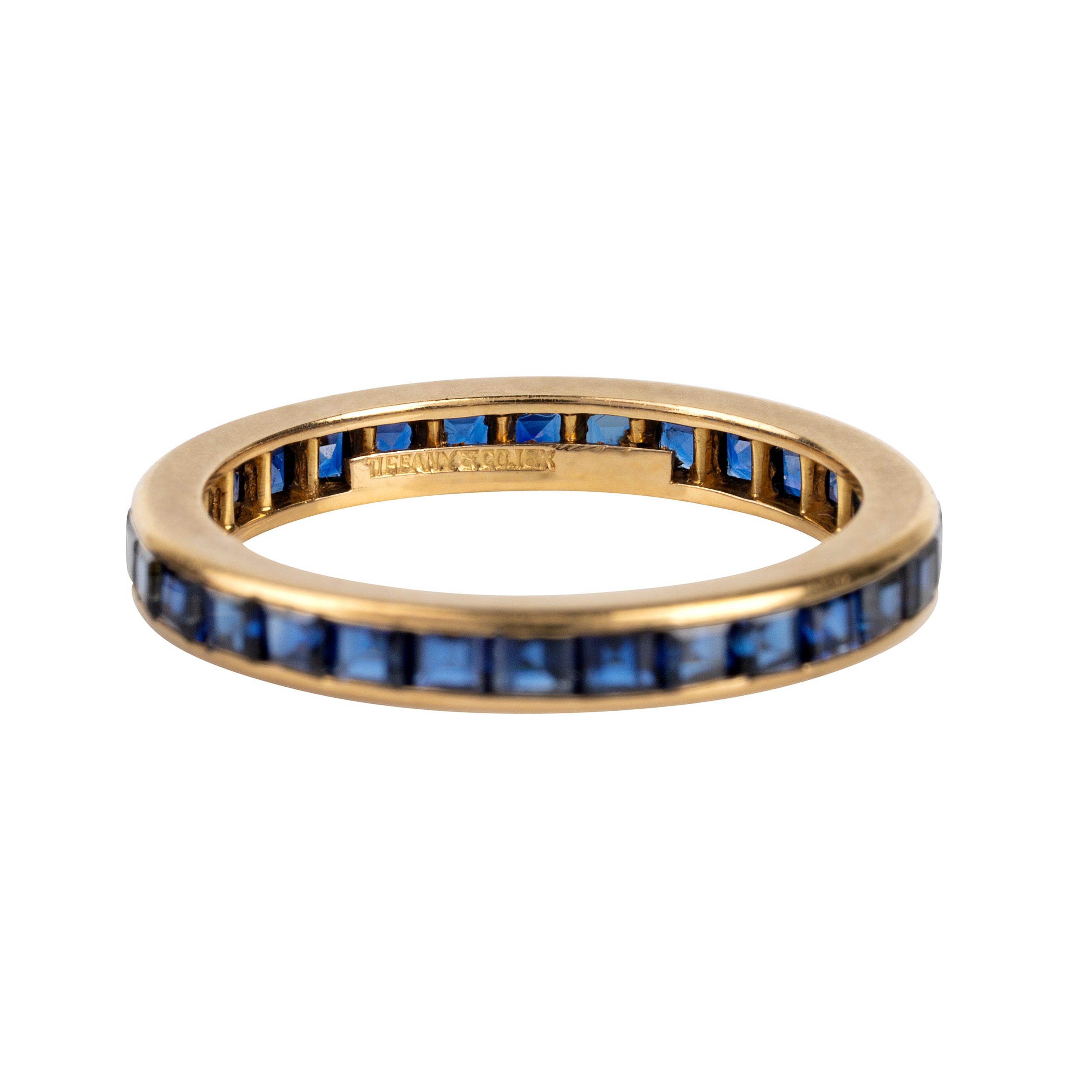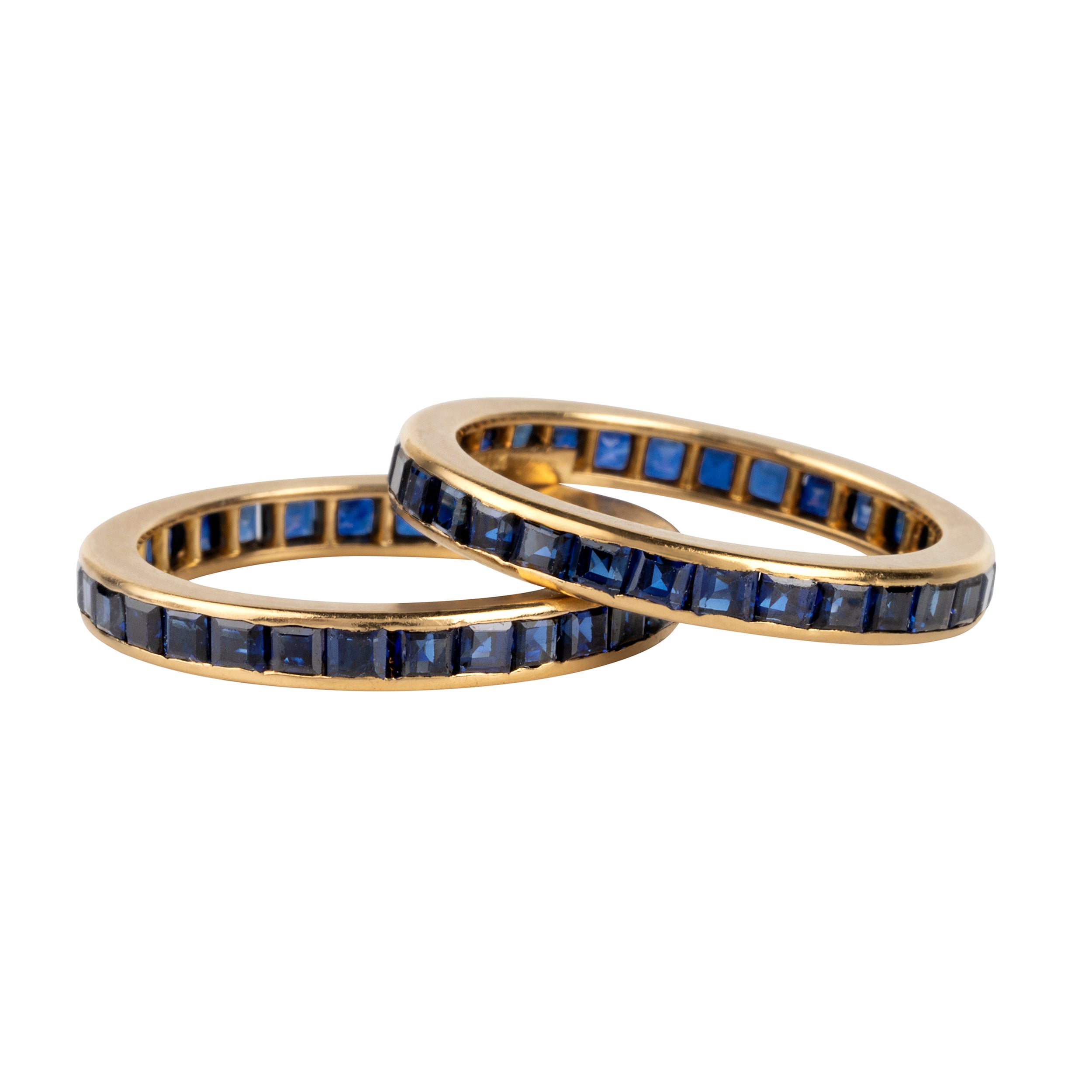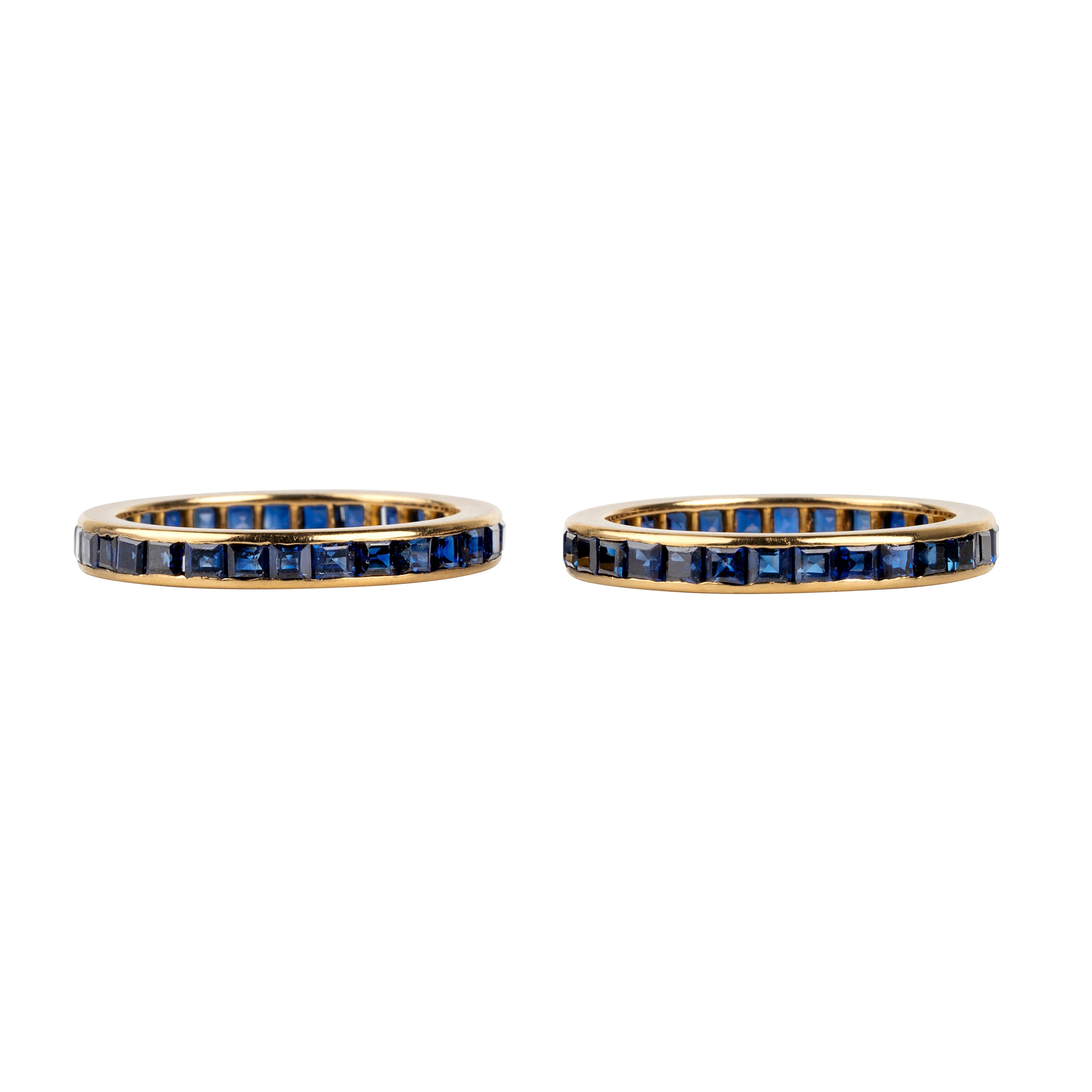 Matched pair of vintage Tiffany and Co. sapphire eternity bands. French cut blue sapphires in channel set 18k gold. American.