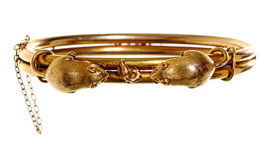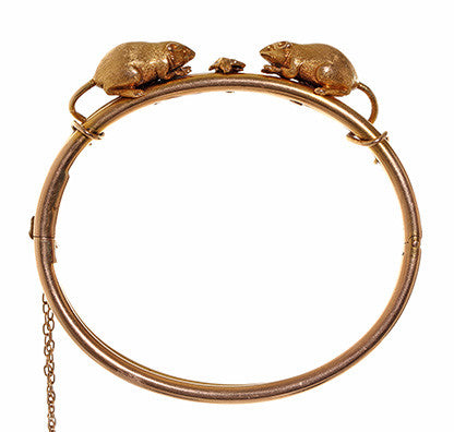 Amusing English mouse bangle Circa 1880's in 15k Gold. These unlikely subjects for jewelry were offered as lucky charms.