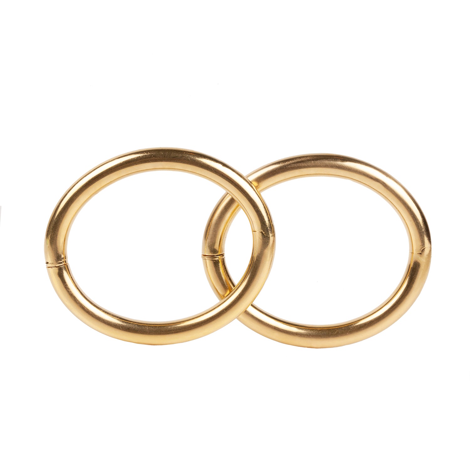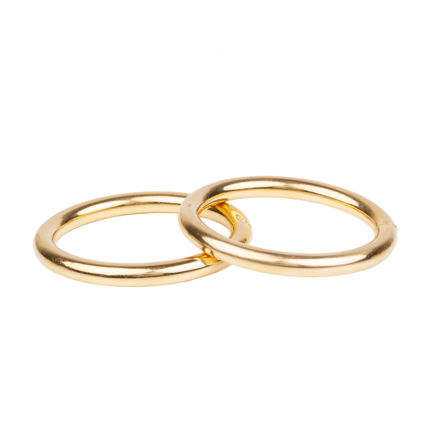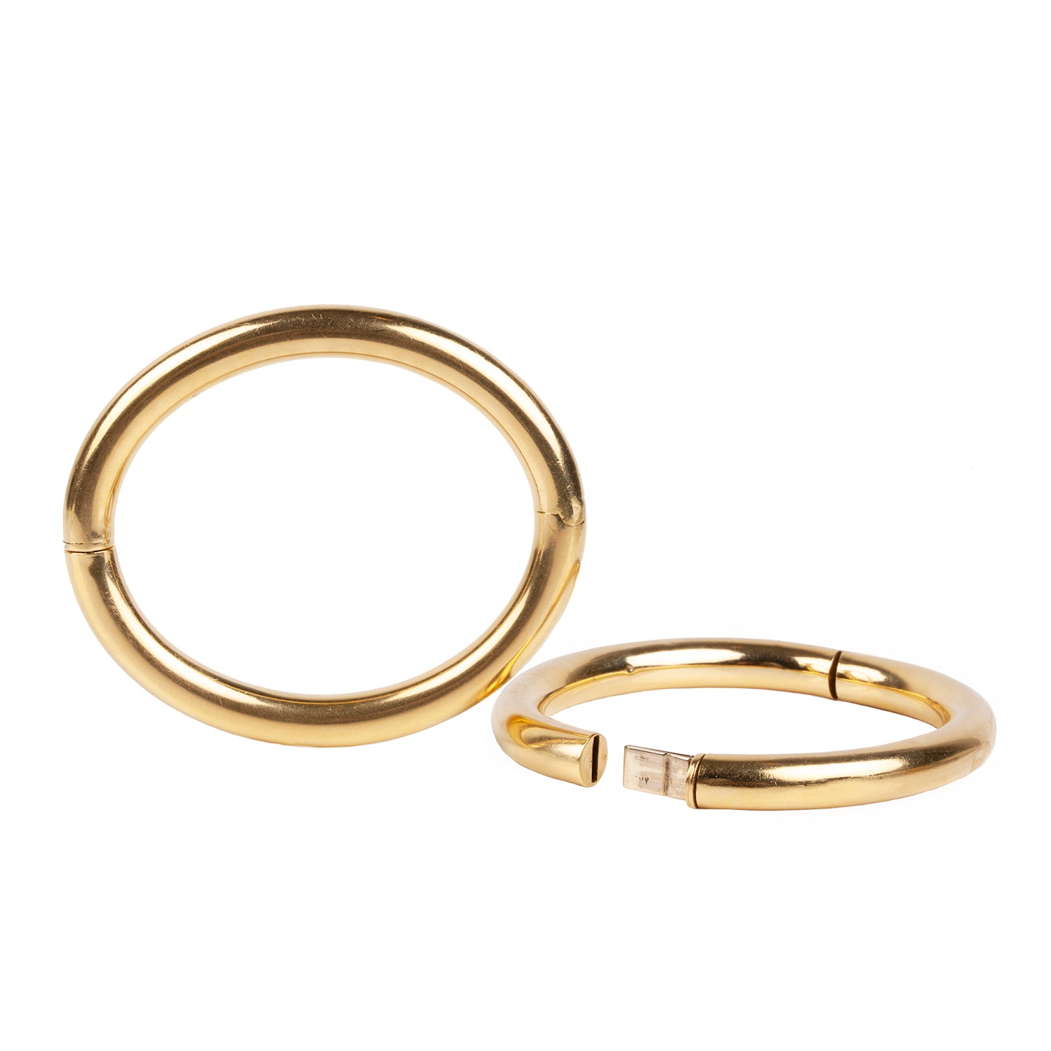 Chic matched pair of oval bangles. Wear them stacked or one on each wrist. Rich yellow gold bracelets finely constructed with hidden push button clasps. Hallmarks indicate an Italian origin, manufactured in the mid-20th century. 18k Gold.