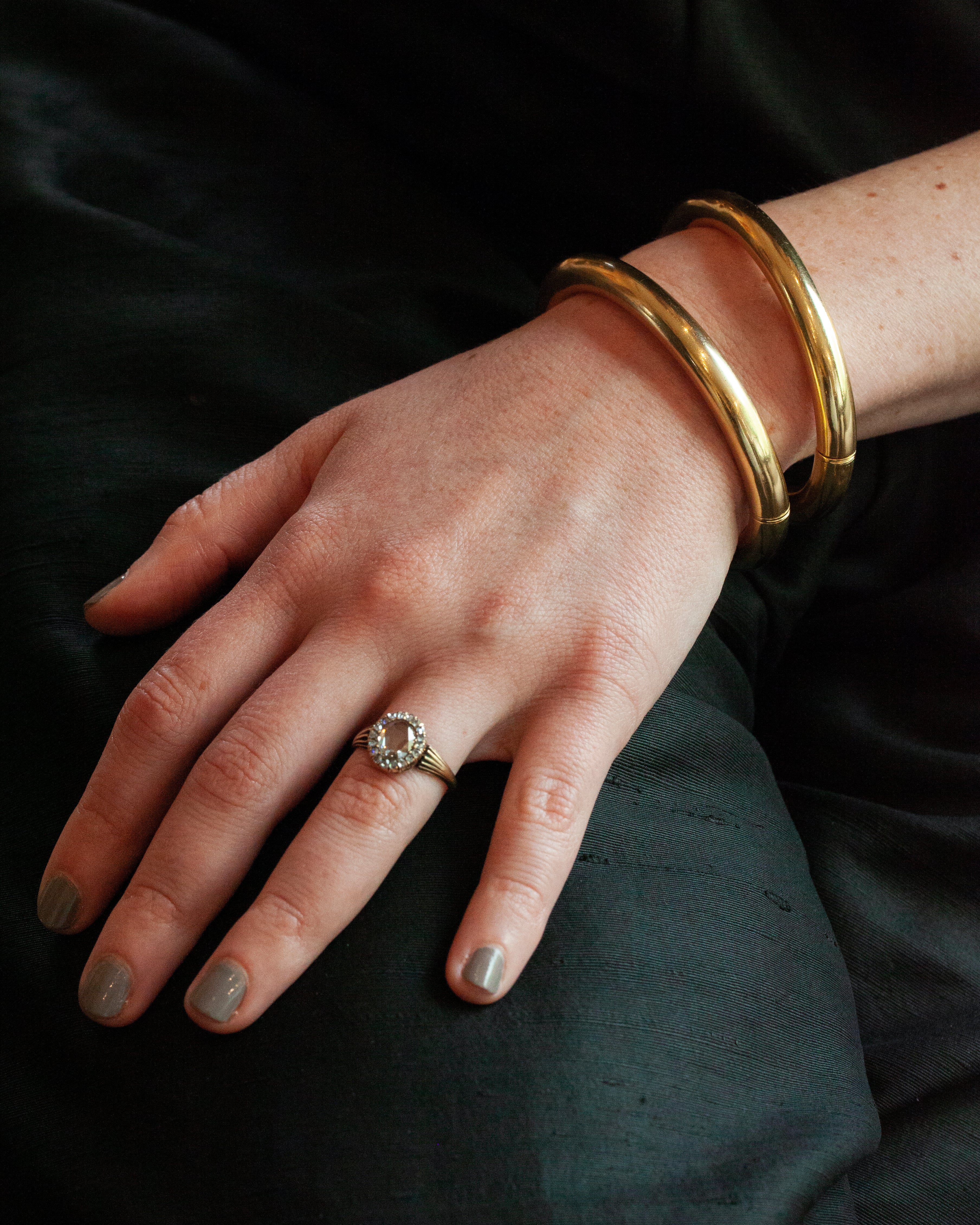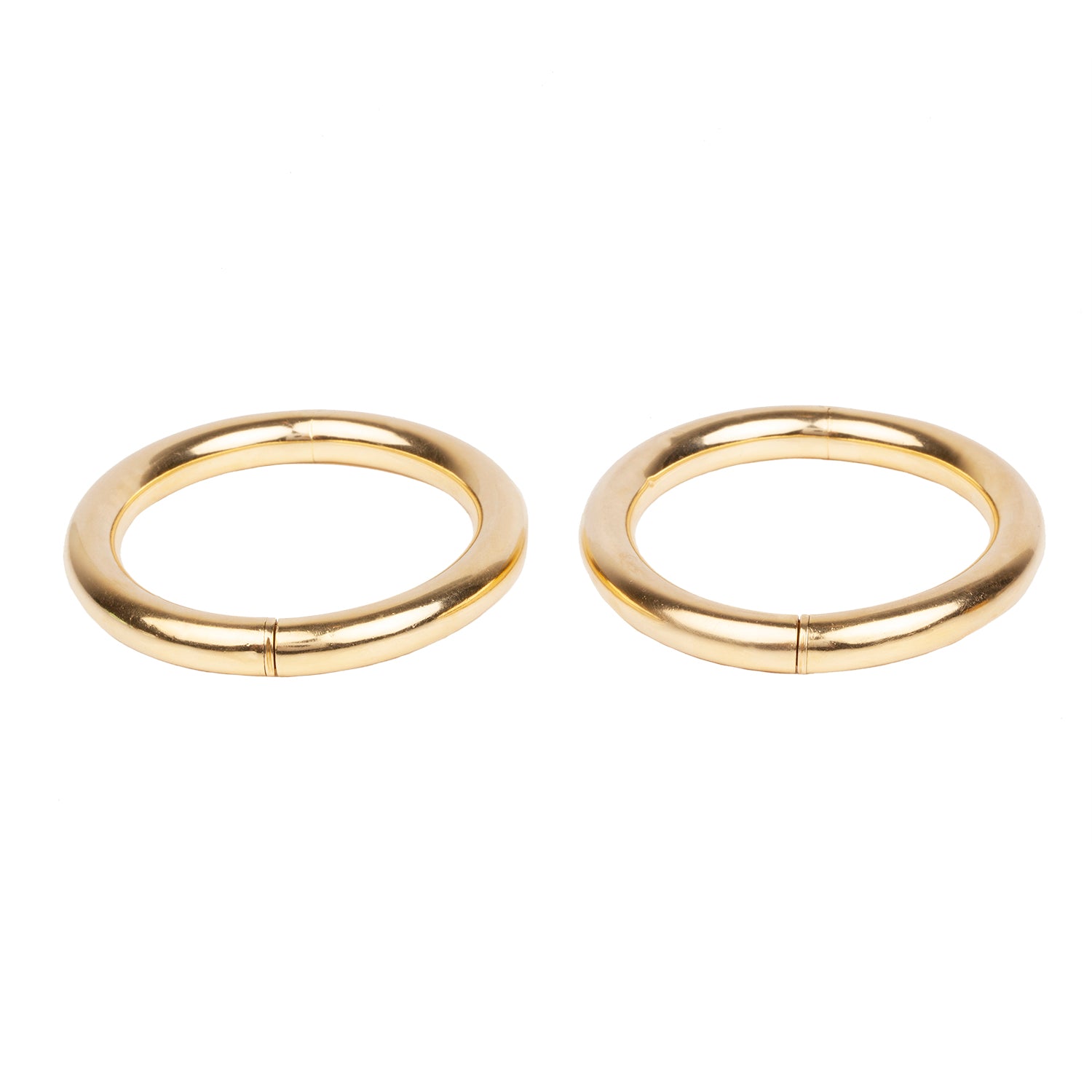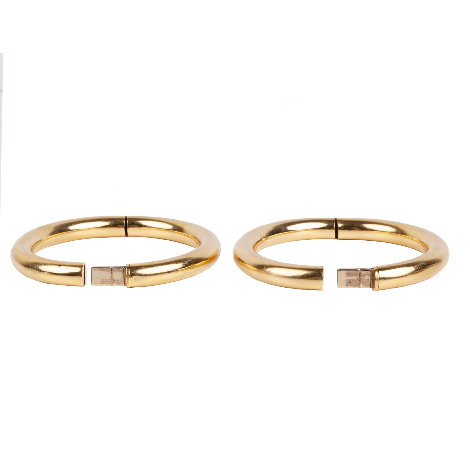 Chic matched pair of oval bangles. Wear them stacked or one on each wrist. Rich yellow gold bracelets finely constructed with hidden push button clasps. Hallmarks indicate an Italian origin, manufactured in the mid-20th century. 18k Gold.