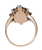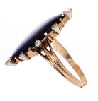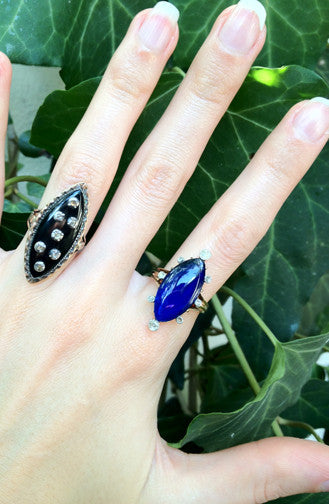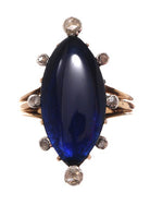 Late 18th century French blue enamel navette shaped ring with old cut diamonds in 9k gold.