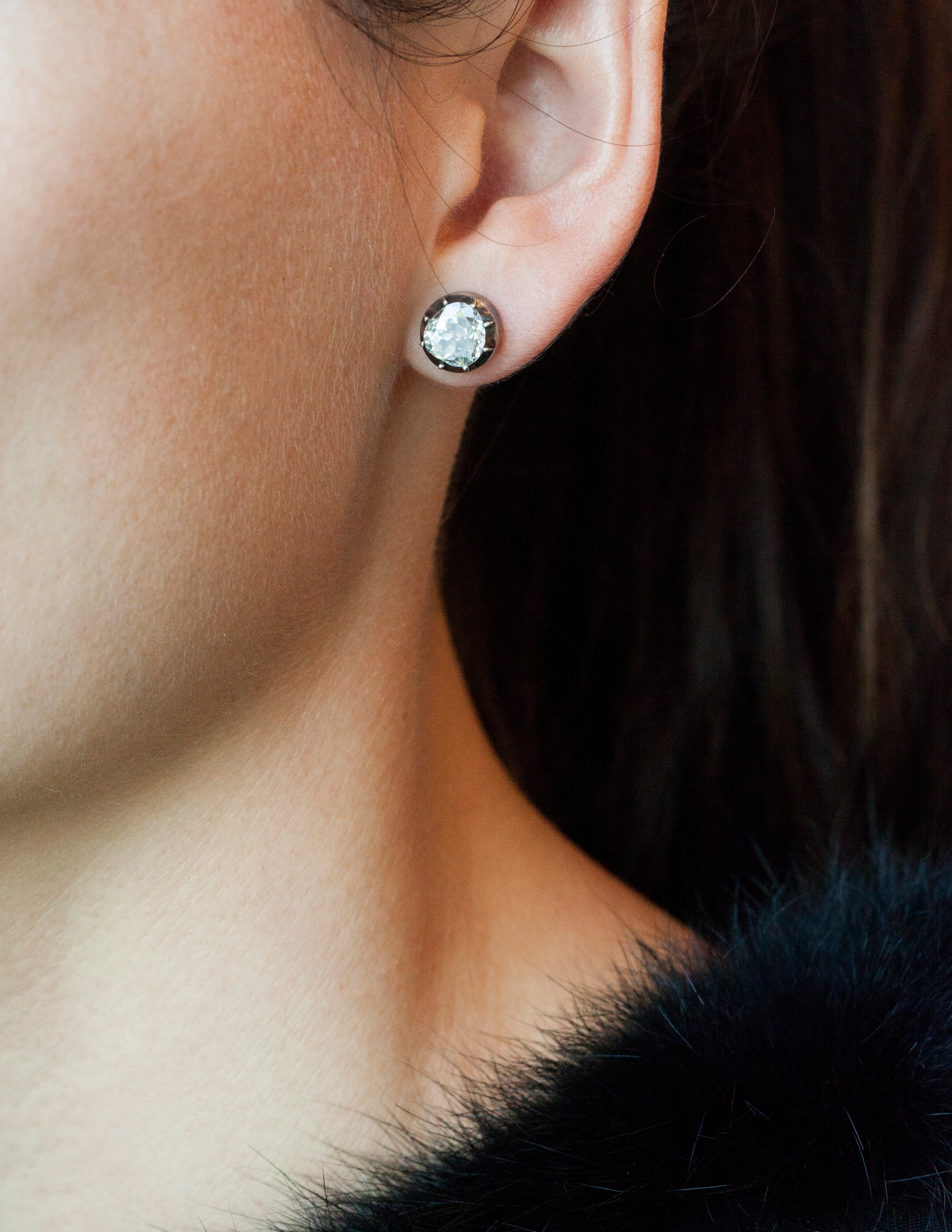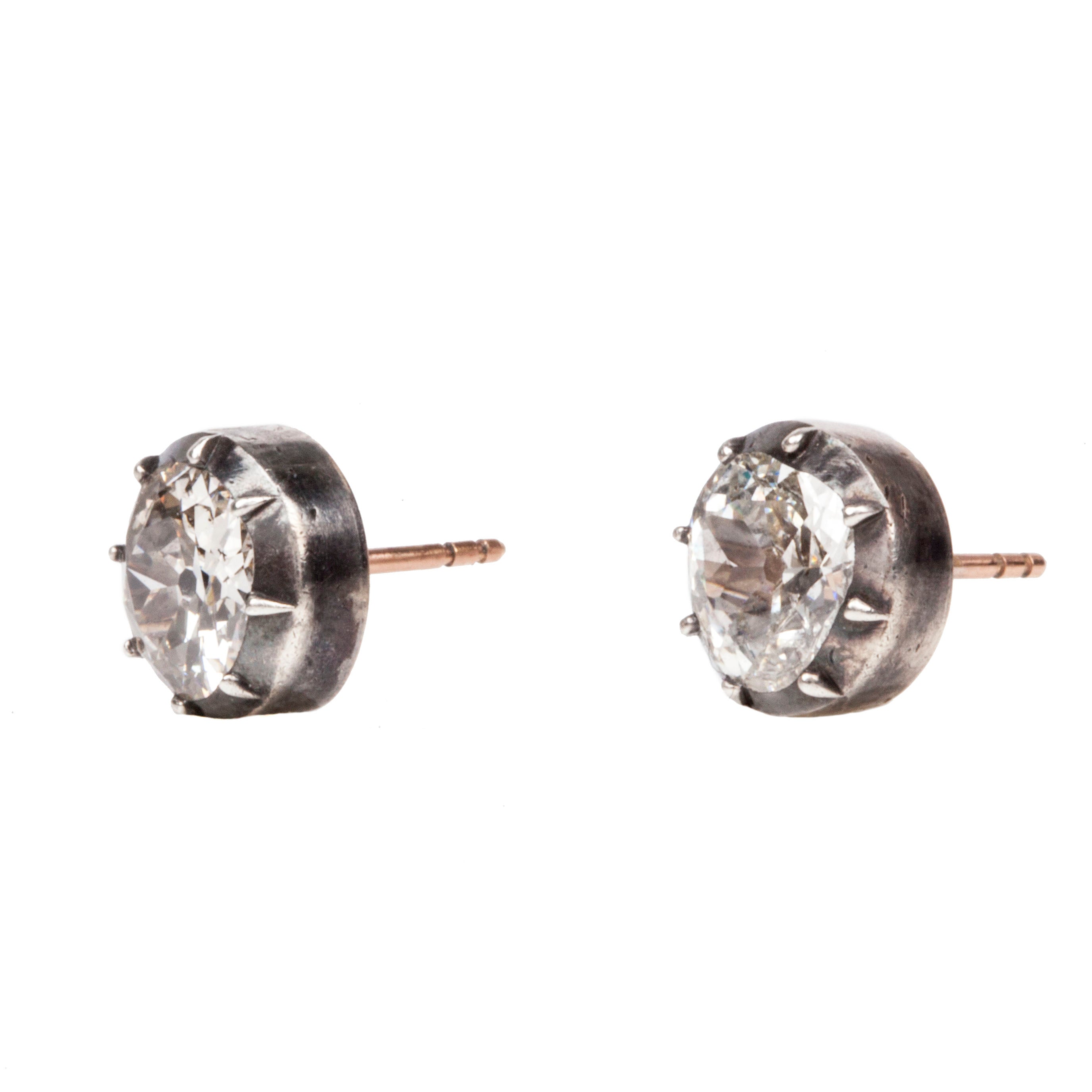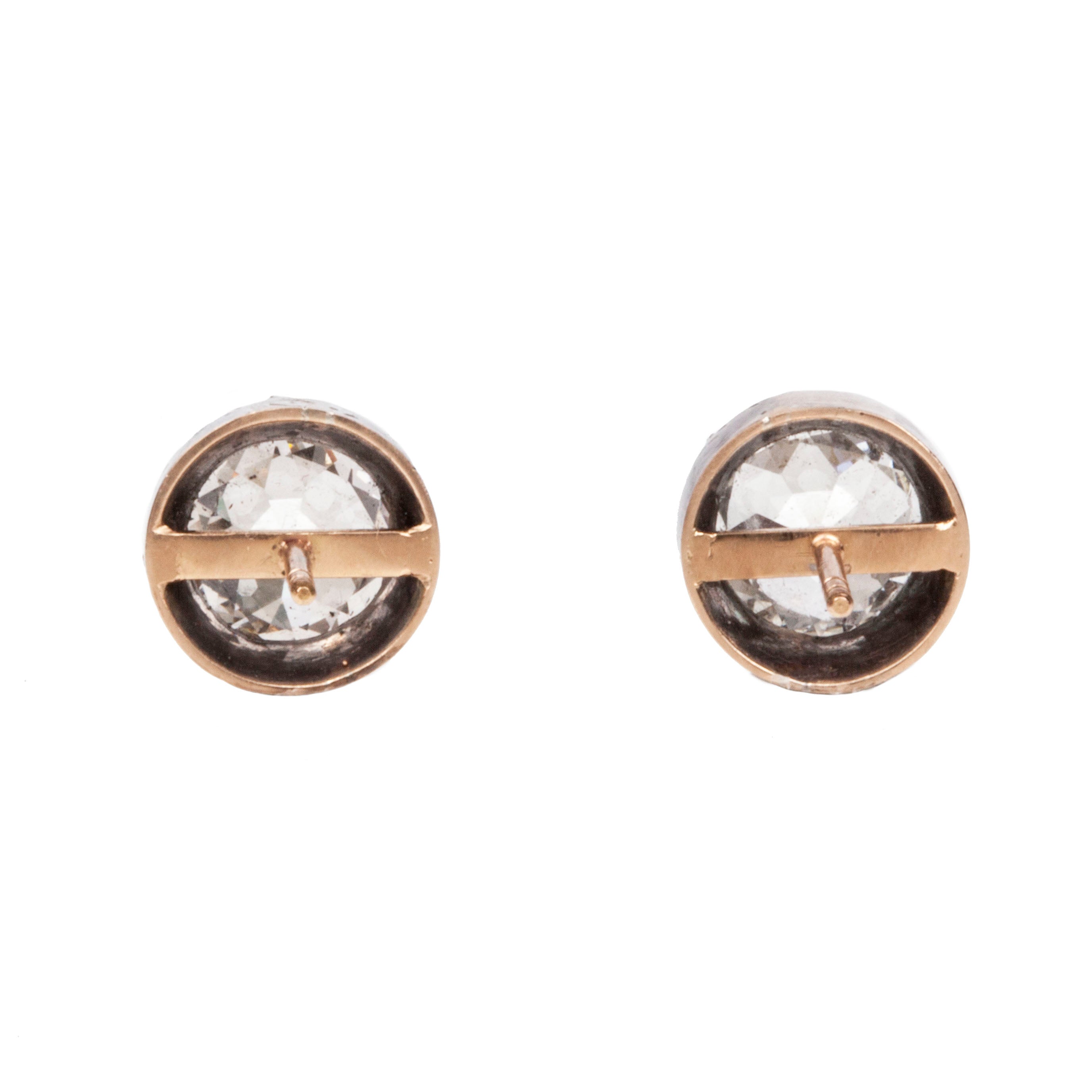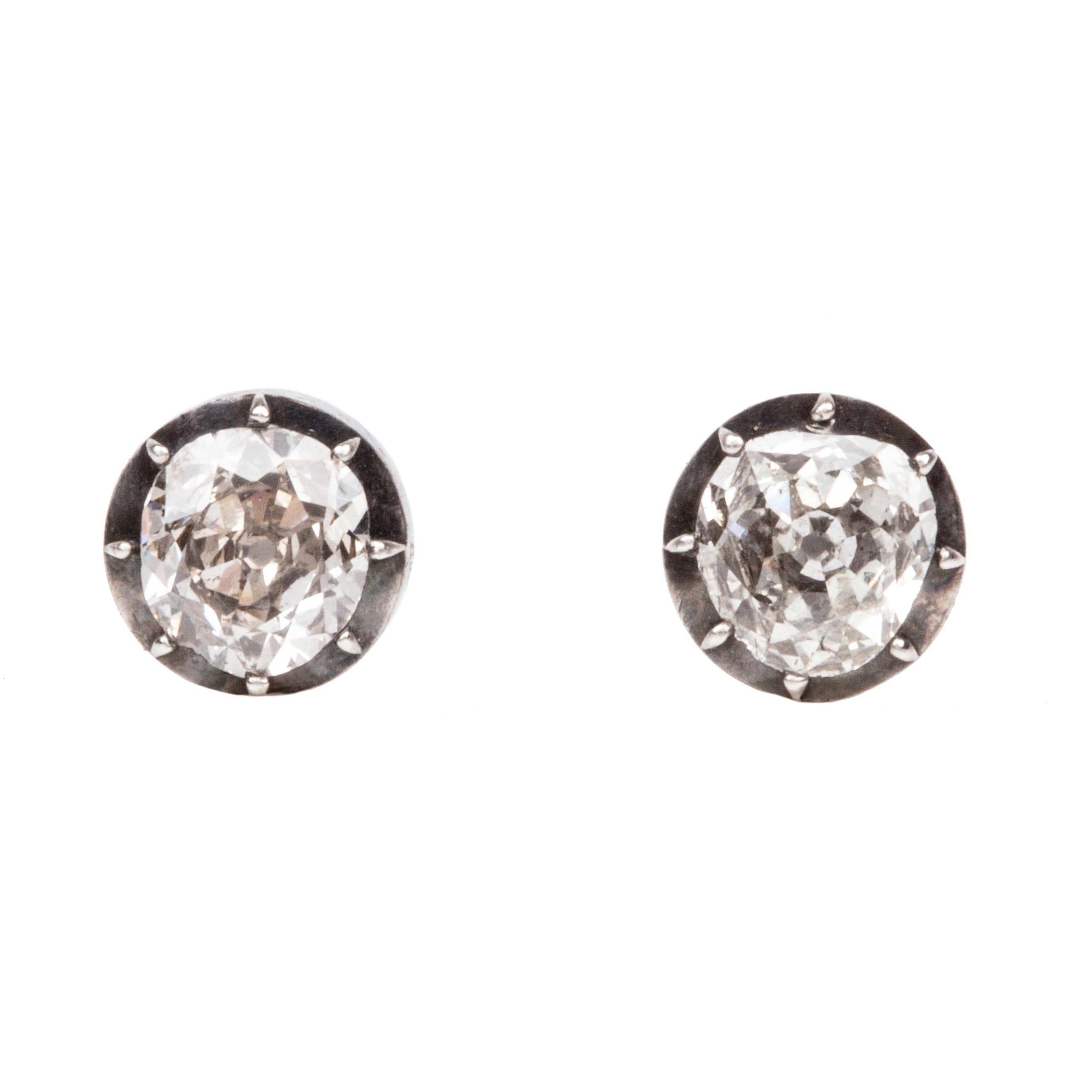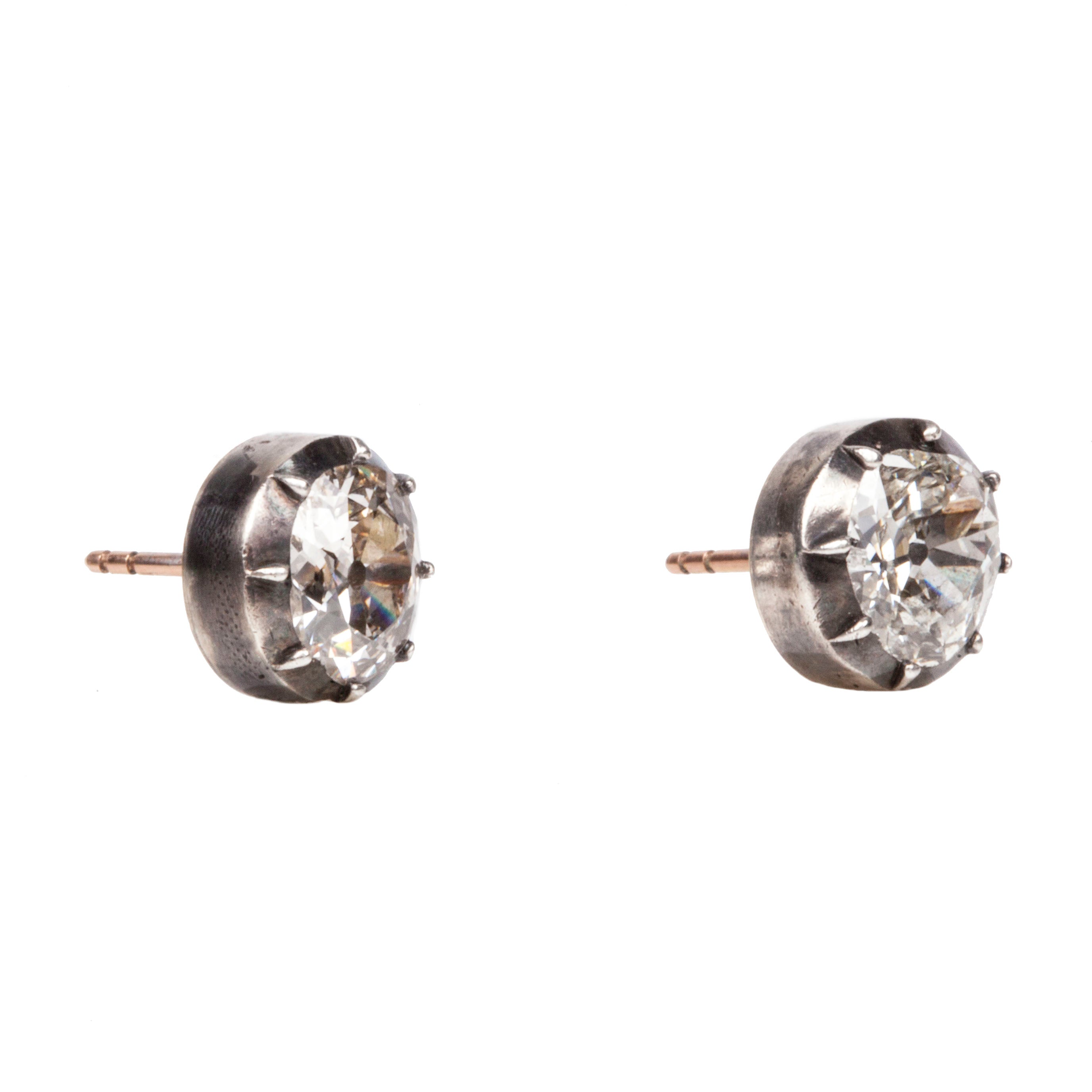 Once a part of a diamond riviere necklace the original settings for these earrings, along with many additional stones, encircled the neck of a Victorian Era woman. The necklace suffered the fate of many grand jewels from earlier times. However, the original 150 year-old silver and gold colette settings have been preserved and converted into earrings with 18k gold posts. Approximately 1.90 carats in total carat weight for the pair of earrings. Each stone has a character of its own, in an asymmetrical shape that reflects the natural shape of the diamond crystal before faceting.