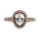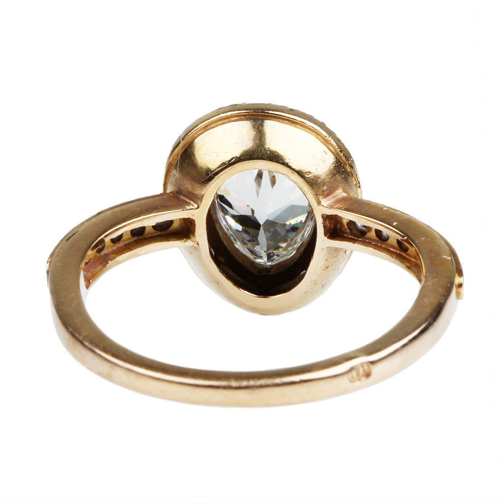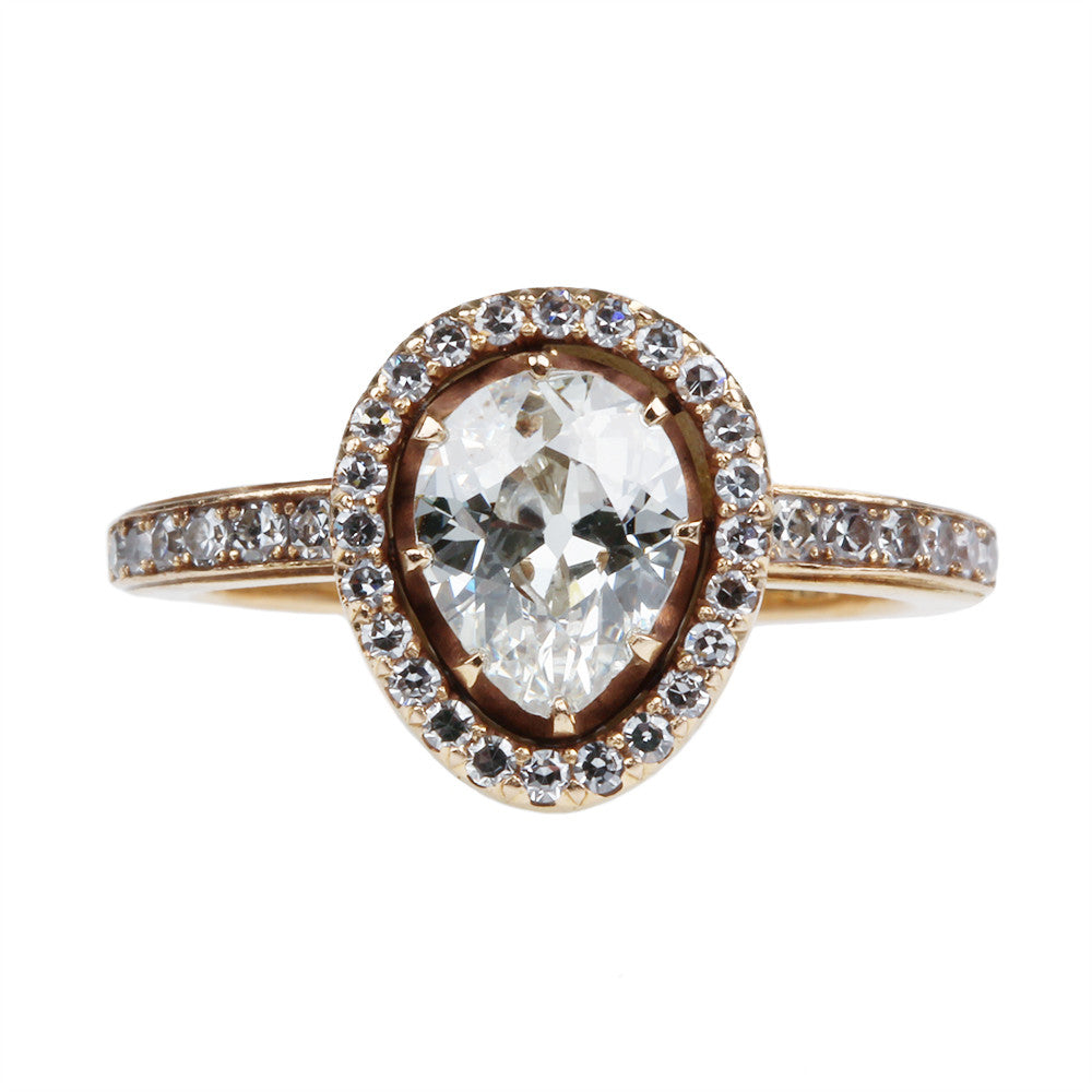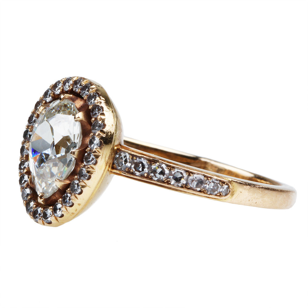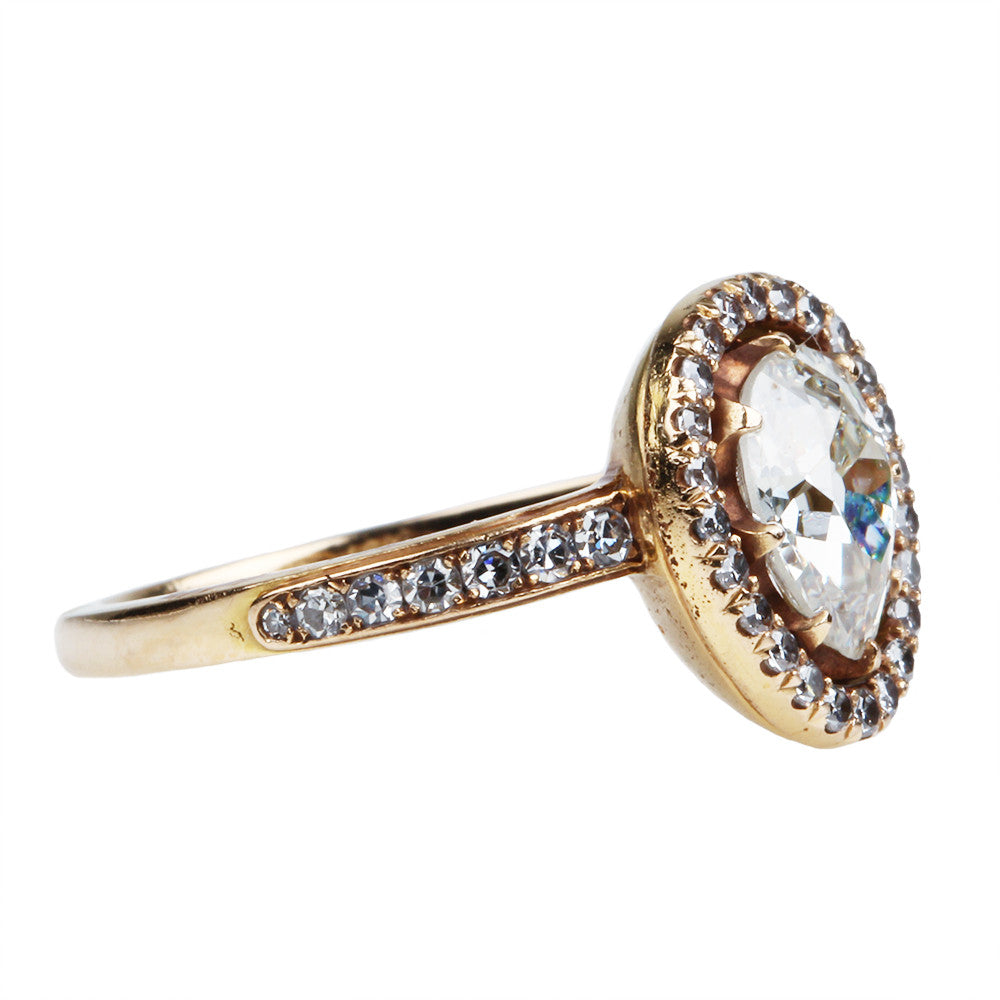 Handcrafted ring in our 18k old gold and featuring a central antique stone surrounded by single cut diamonds. We have applied an acid treatment to the ring darkening the gold, giving great depth to the negative space surrounding the center stone. This example features a 1 carat pear shaped antique old mine cut diamond.
