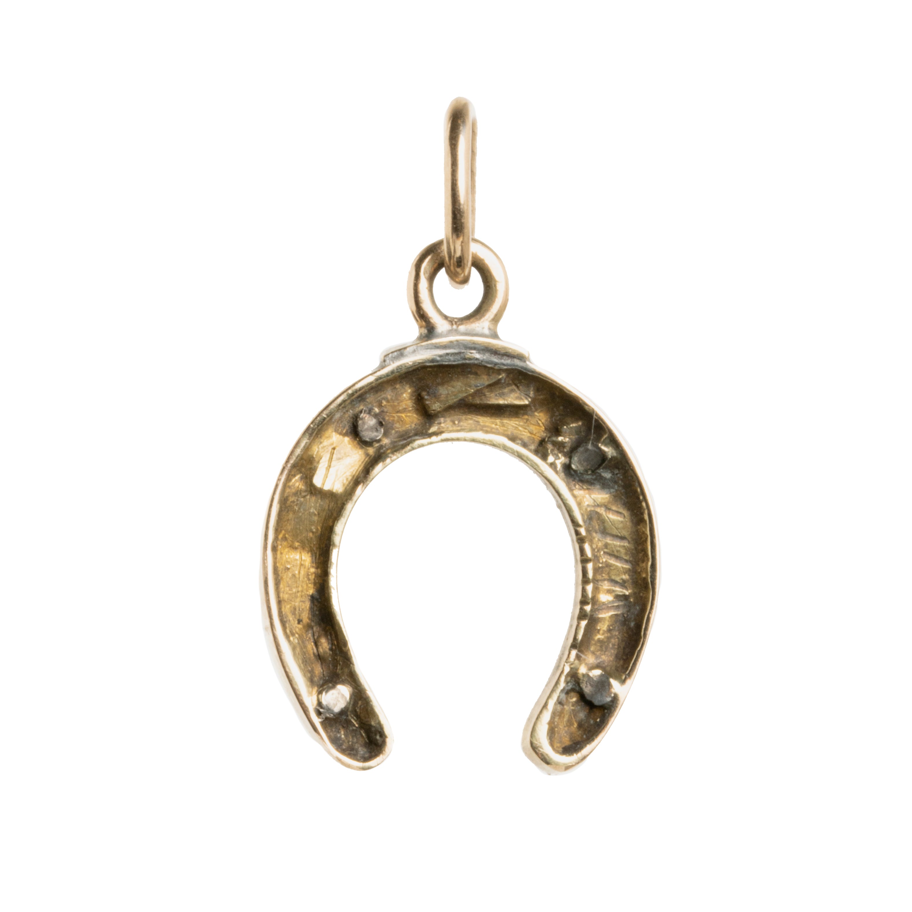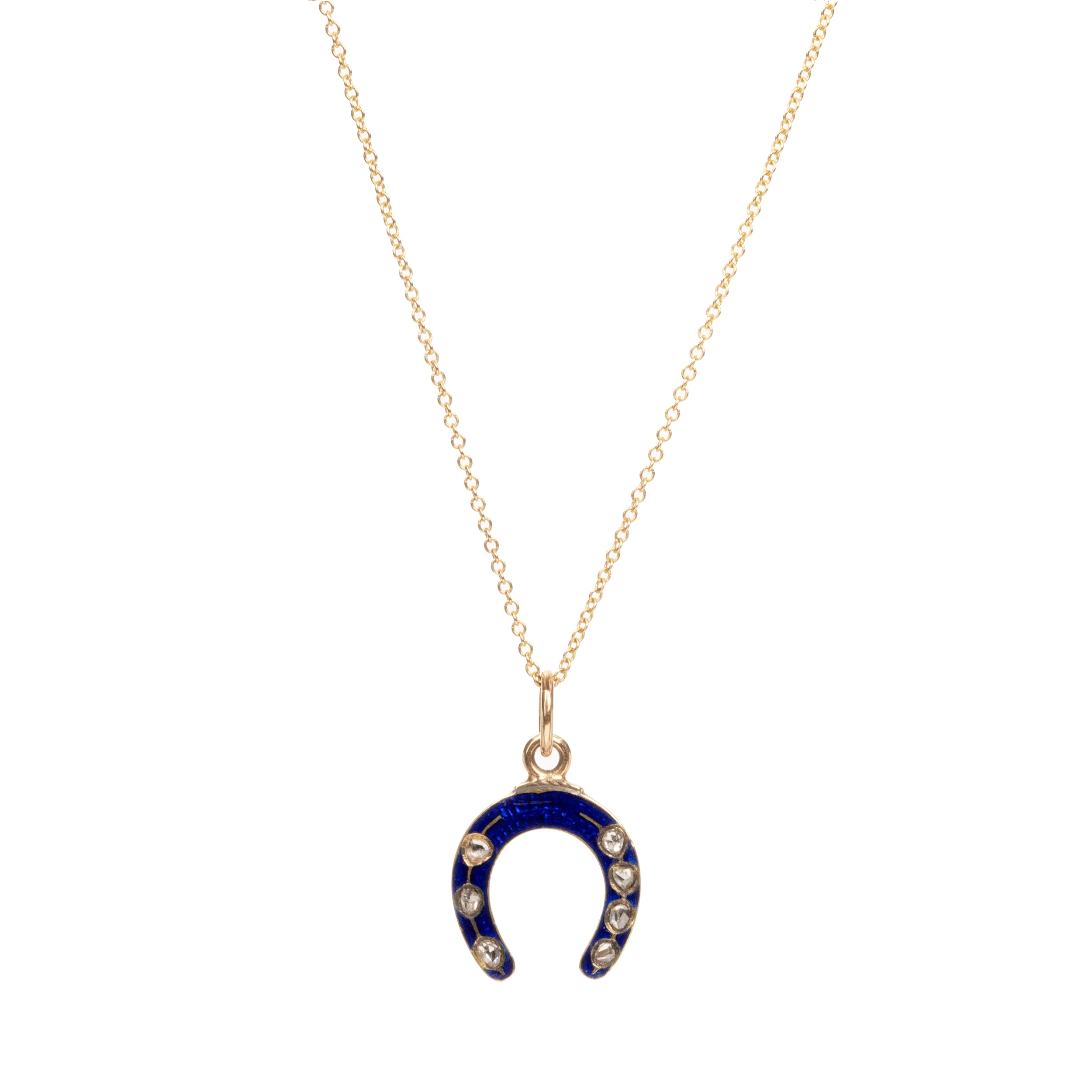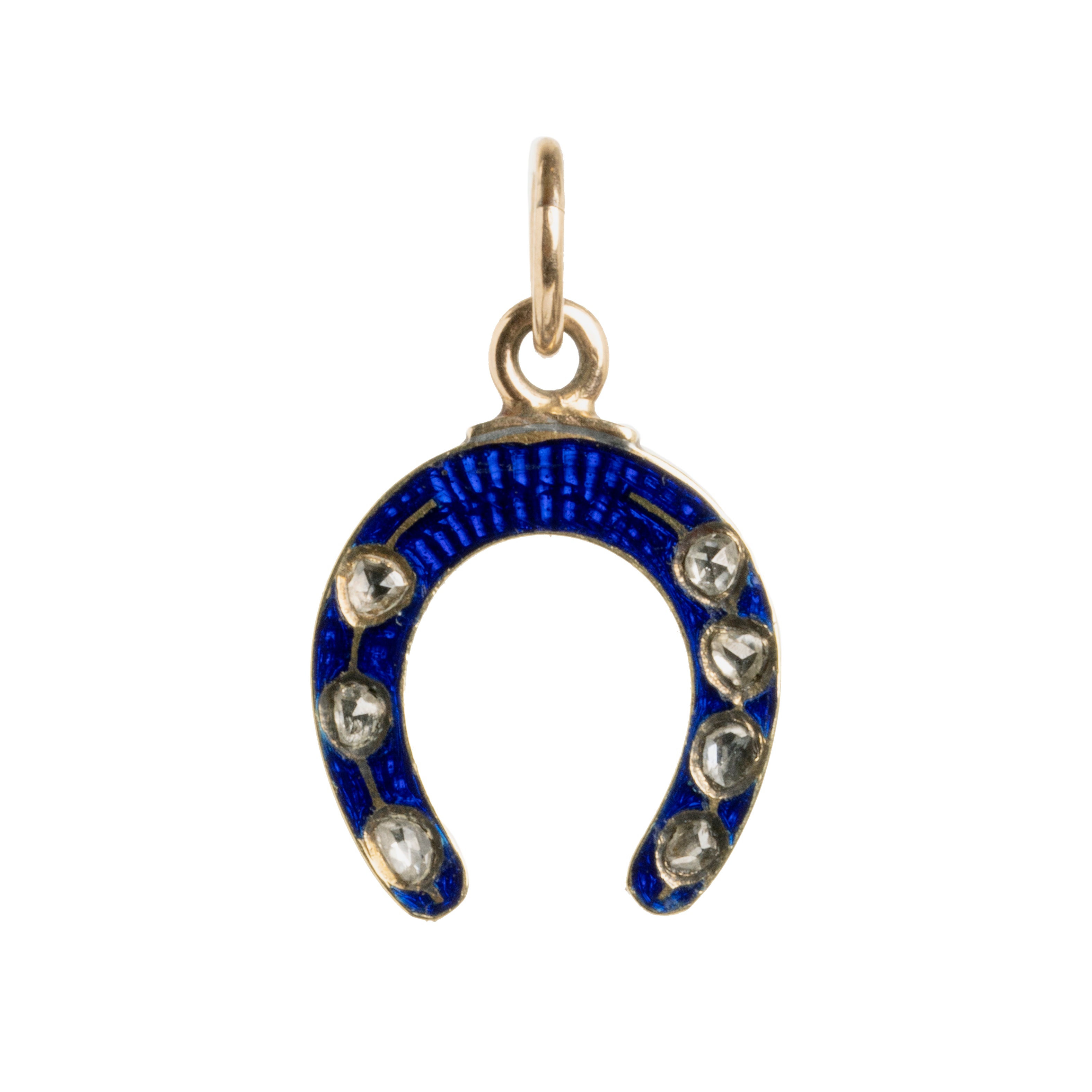 Petite blue enamel and diamond horseshoe charm, in 14k gold, with seven rose cut diamond. English in origin. Circa 1890.