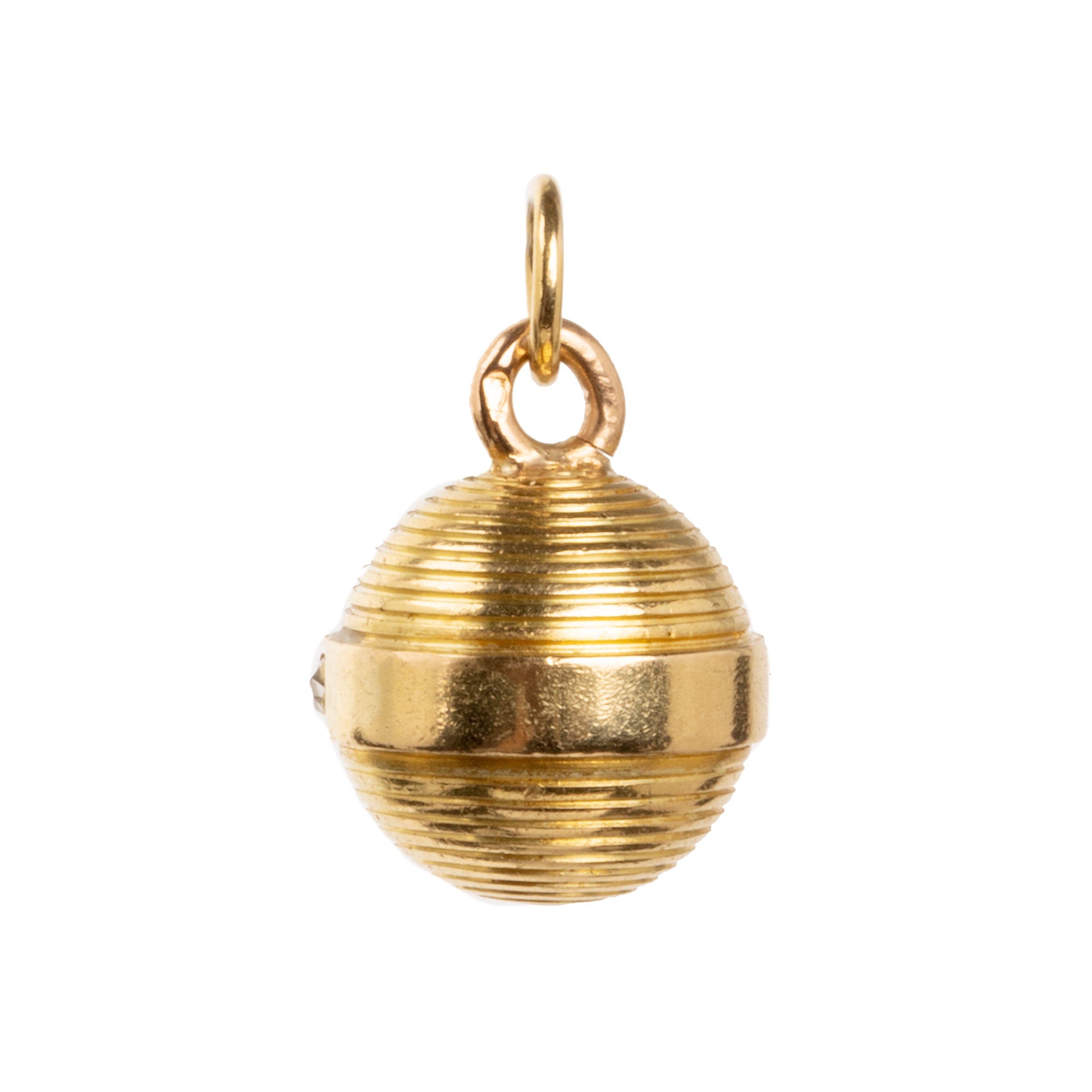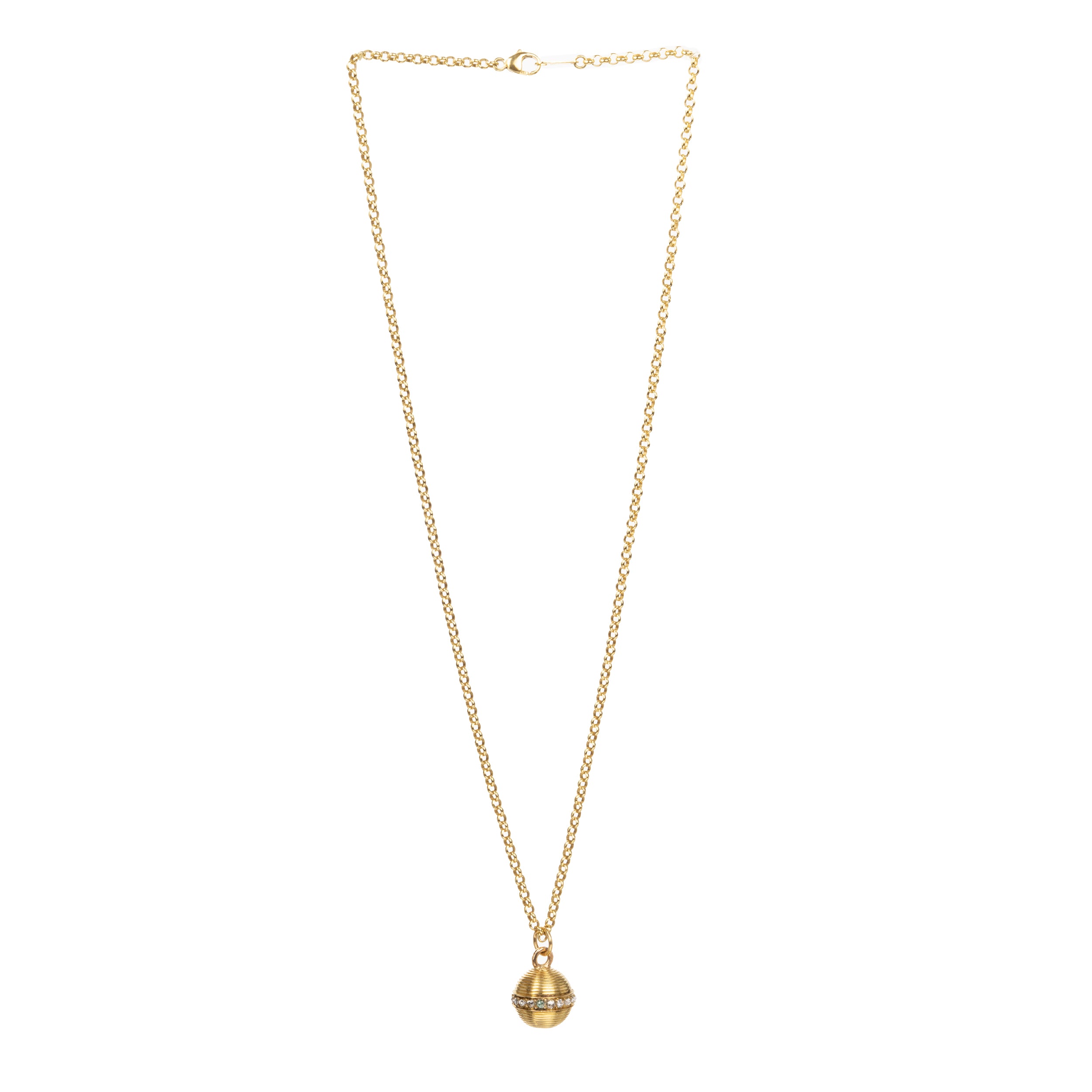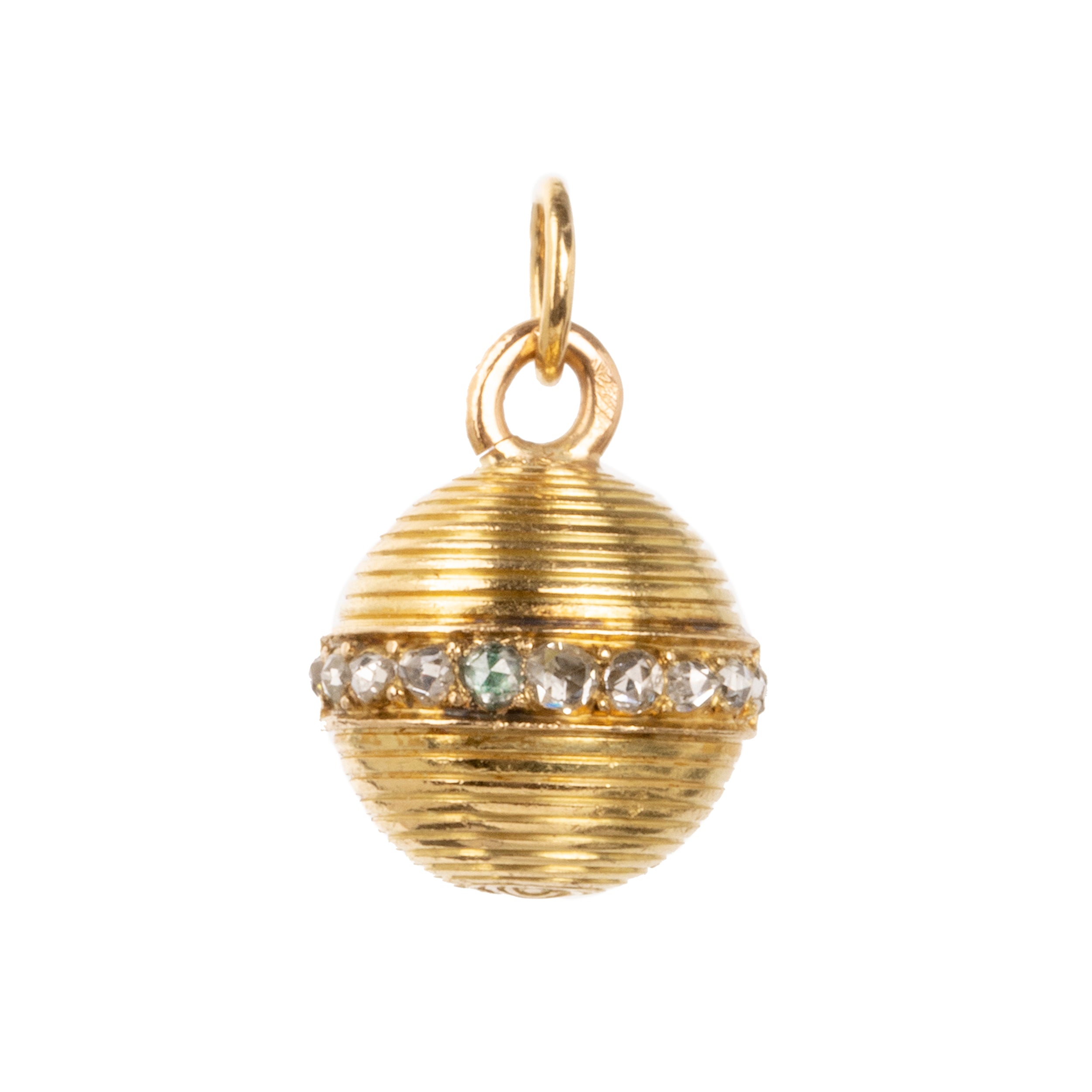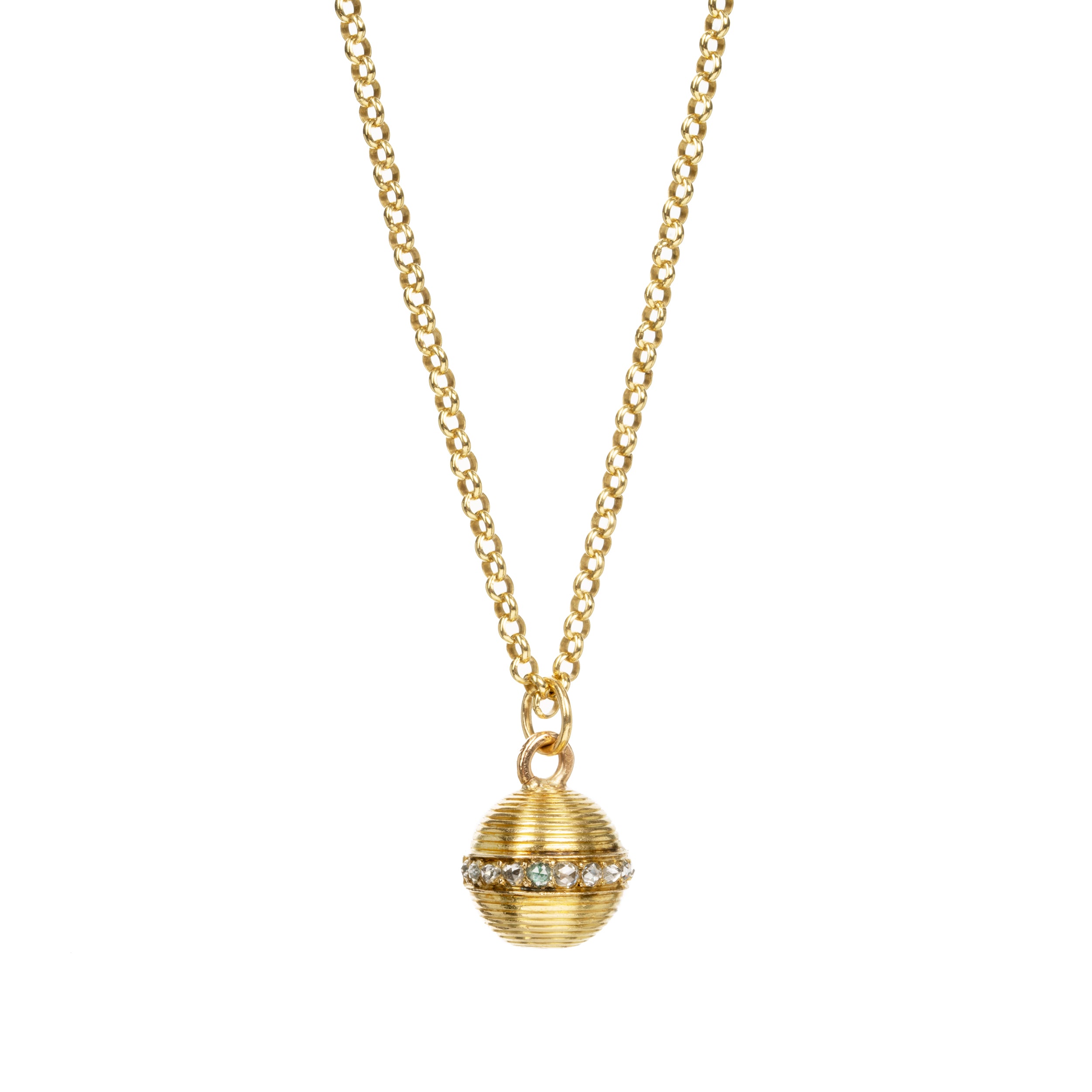 Petite turned diamond ball pendent charm necklace, 18k . Pavé diamonds encircle half the ball. English in origin. The charm would have been an element on a larger piece of jewelry. Circa 1860.