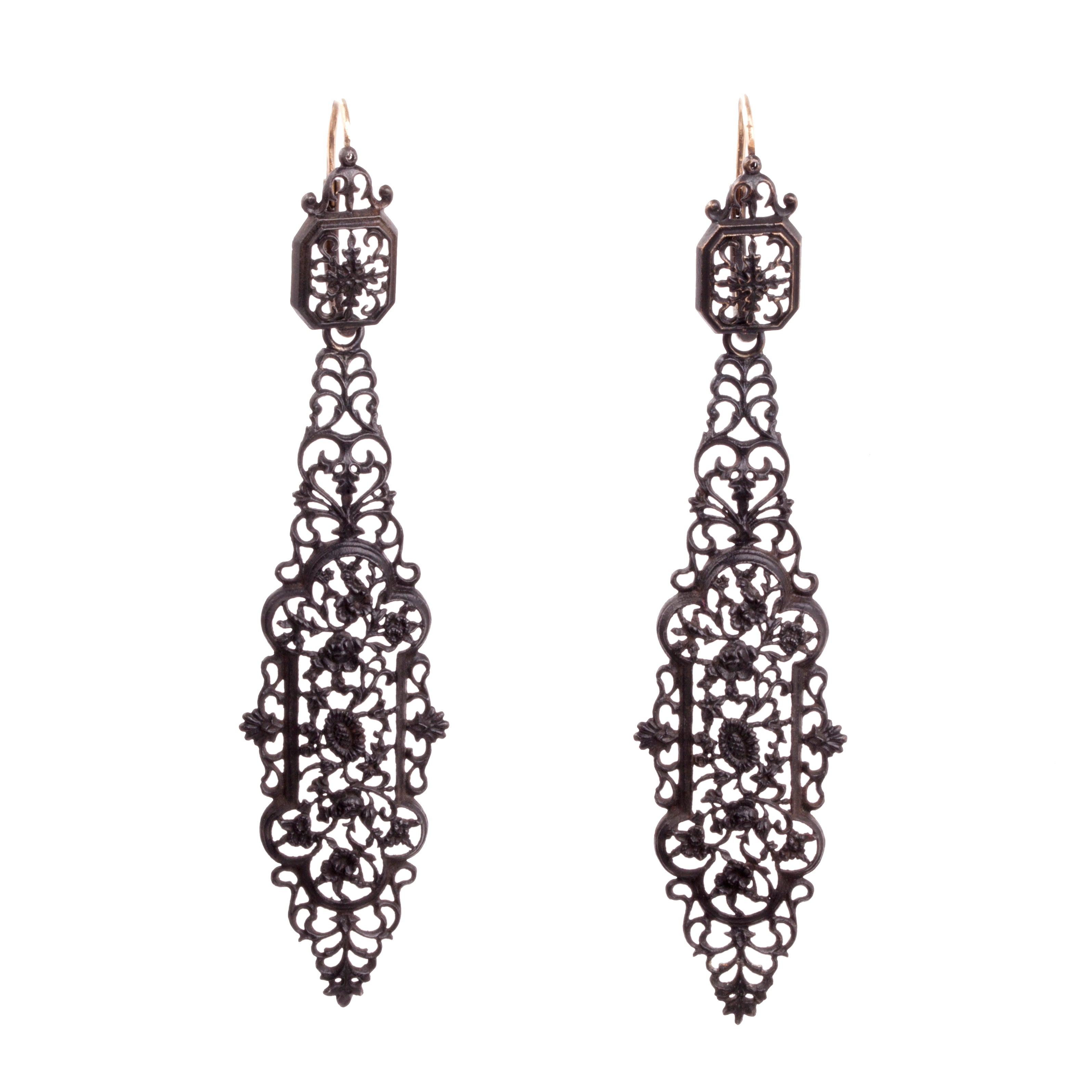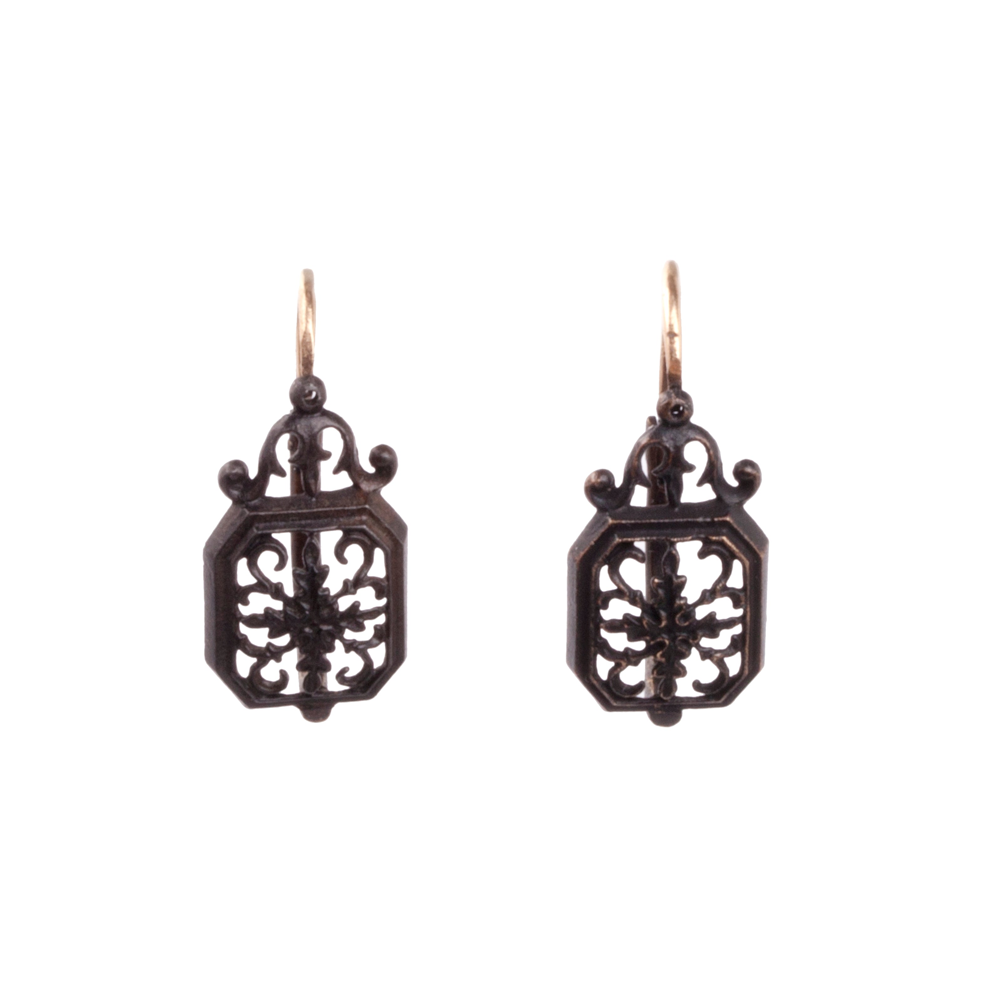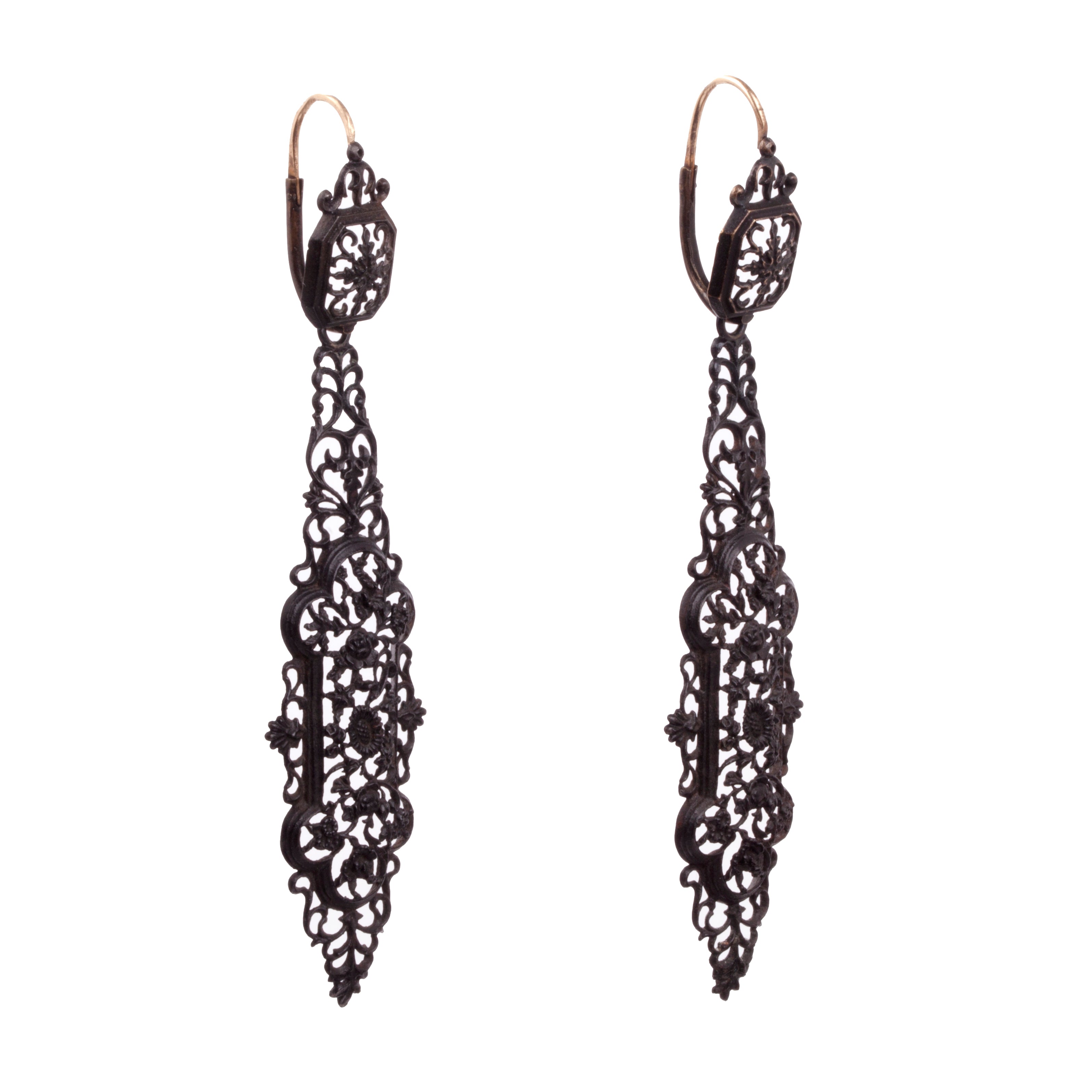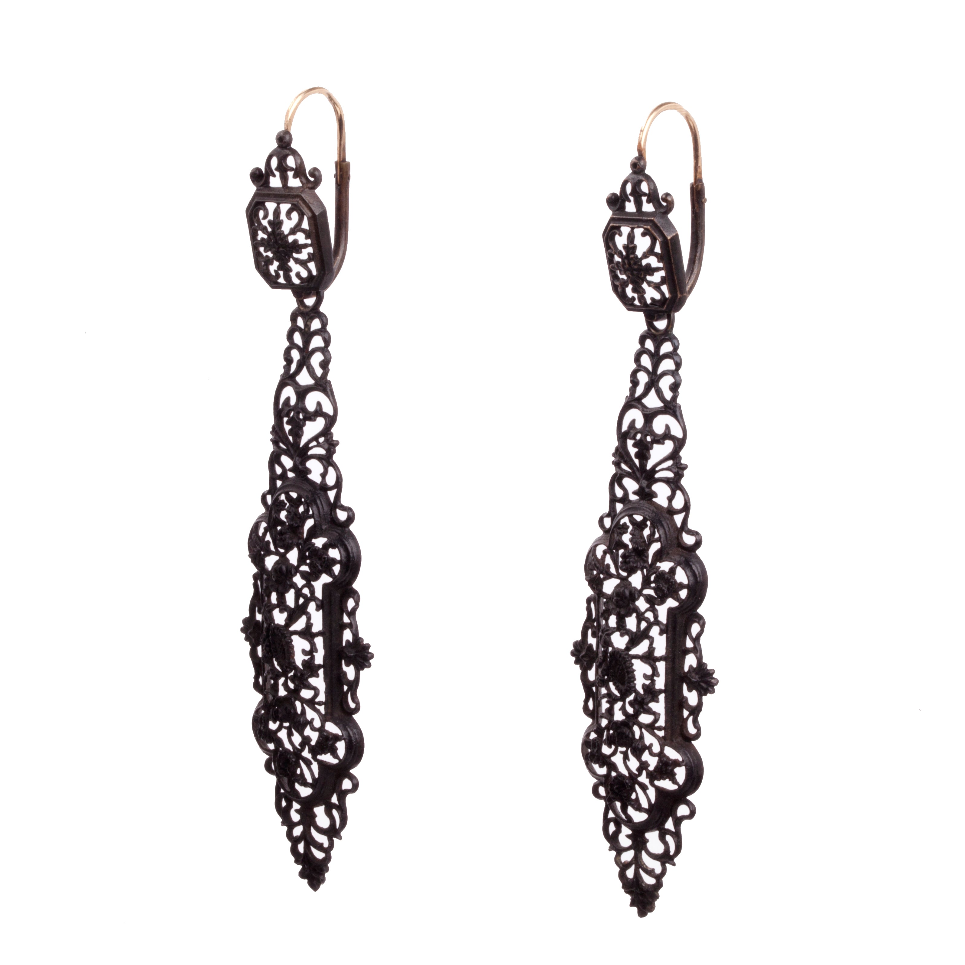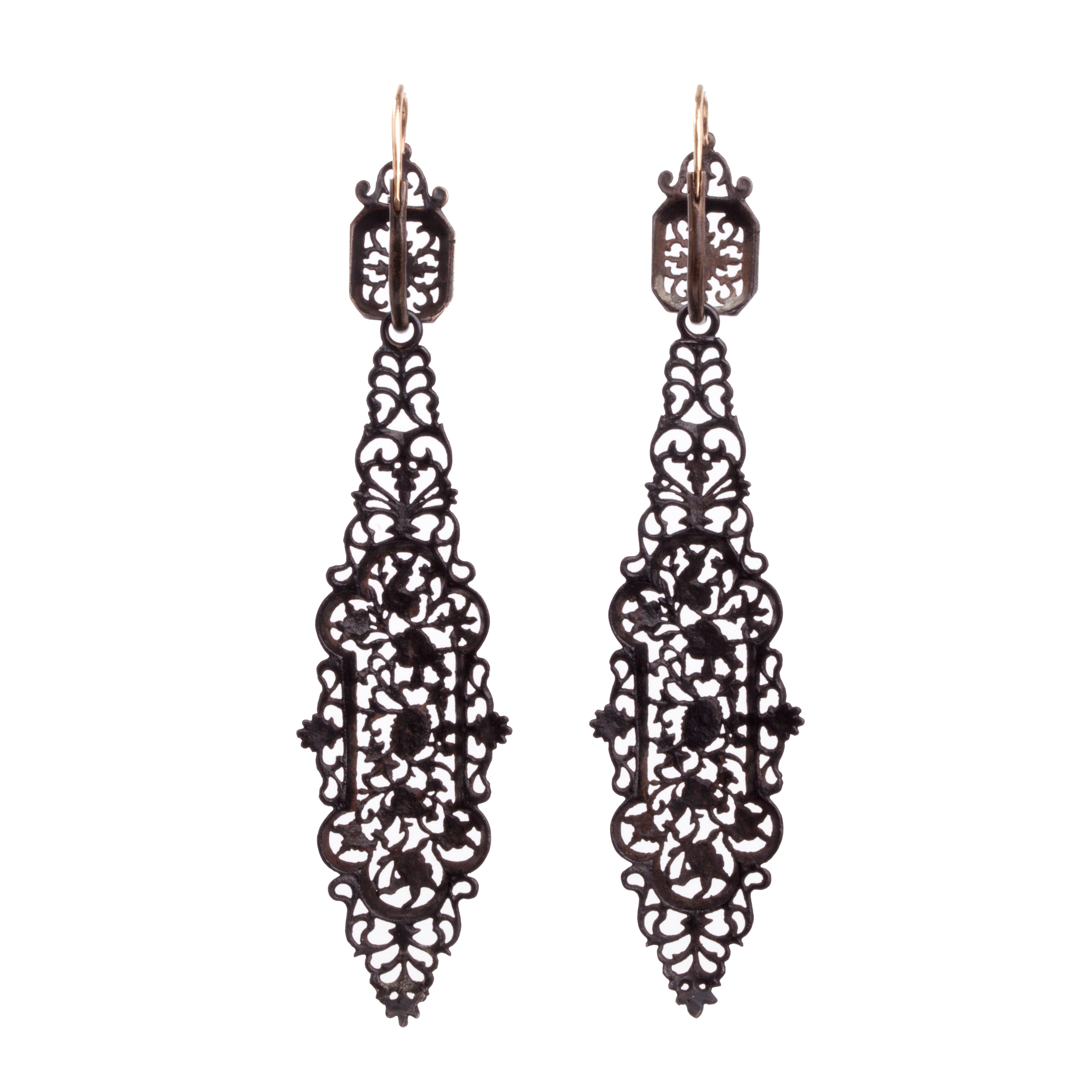 Rare Berlin Iron earrings. Day and night style. Elongated pendeloque shape with day and night style tops. Back to front ear wires are done in the 'day and night' style that allows the drop to be removed and the simple tops worn on their own.