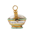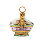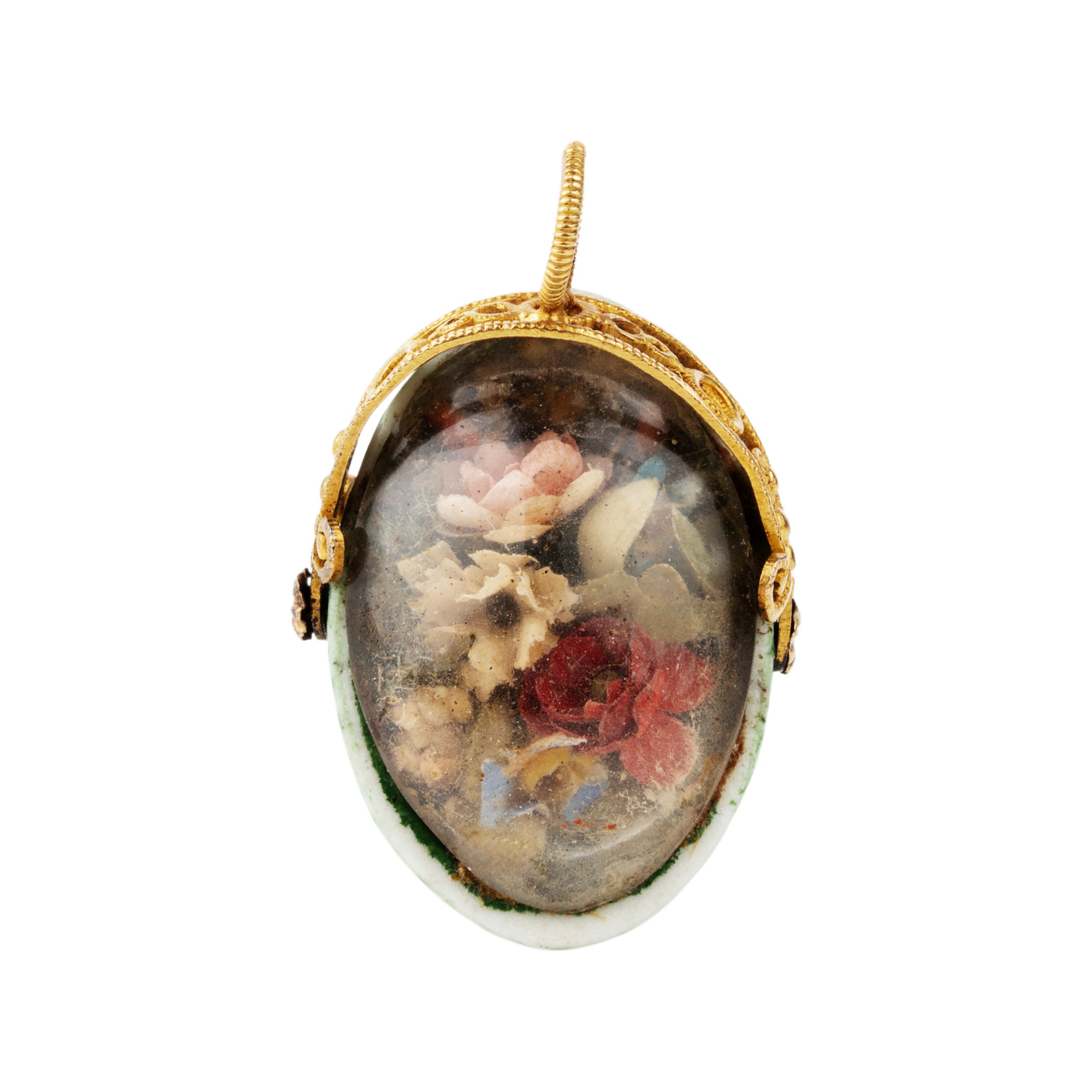 The basket contains tiny fabric flowers under a domed crystal. Delicate enamel details with the French motto " jusqu'au tombeau", inferring "Love to the tomb". An object to display.