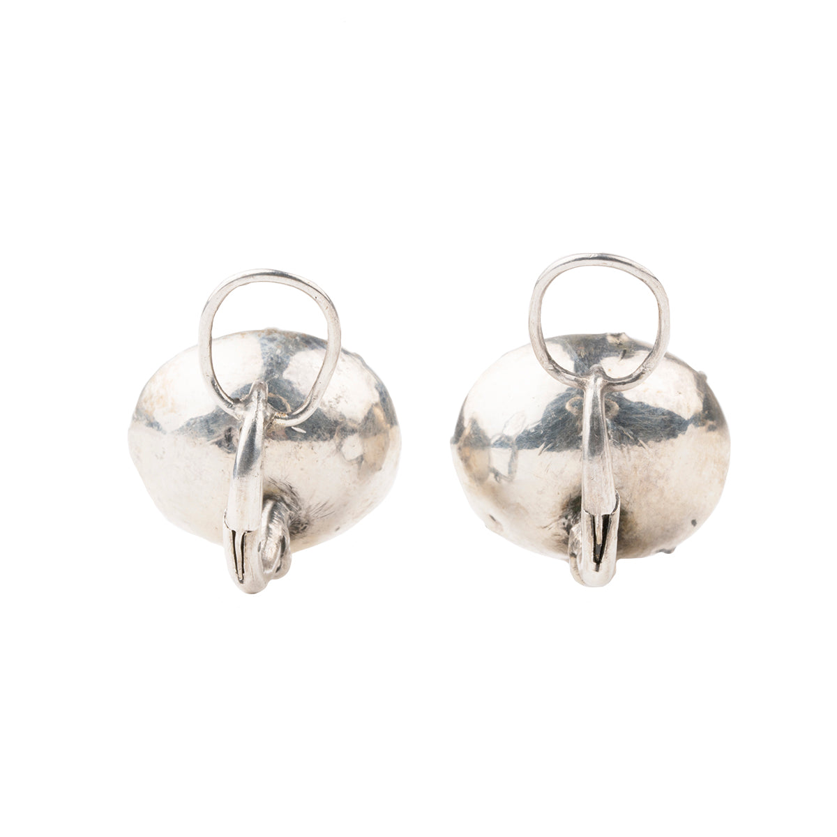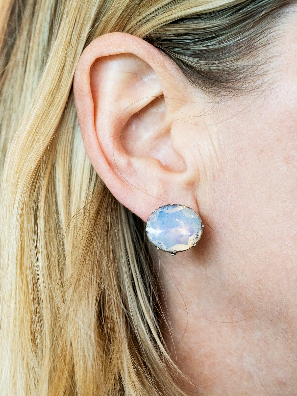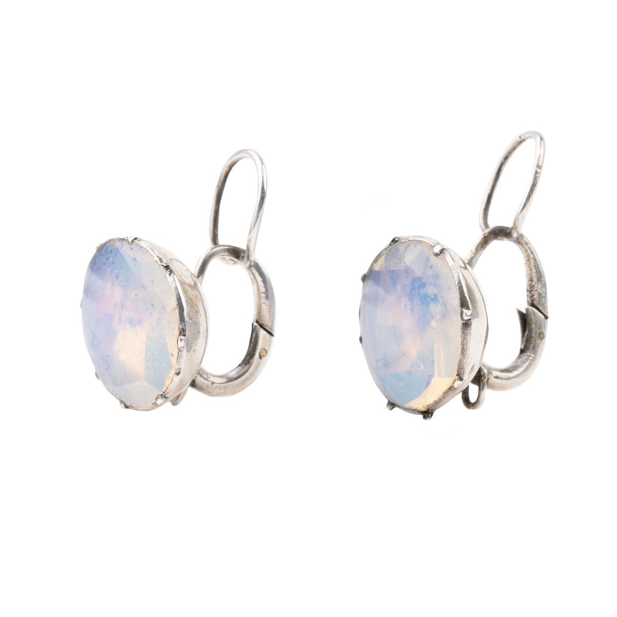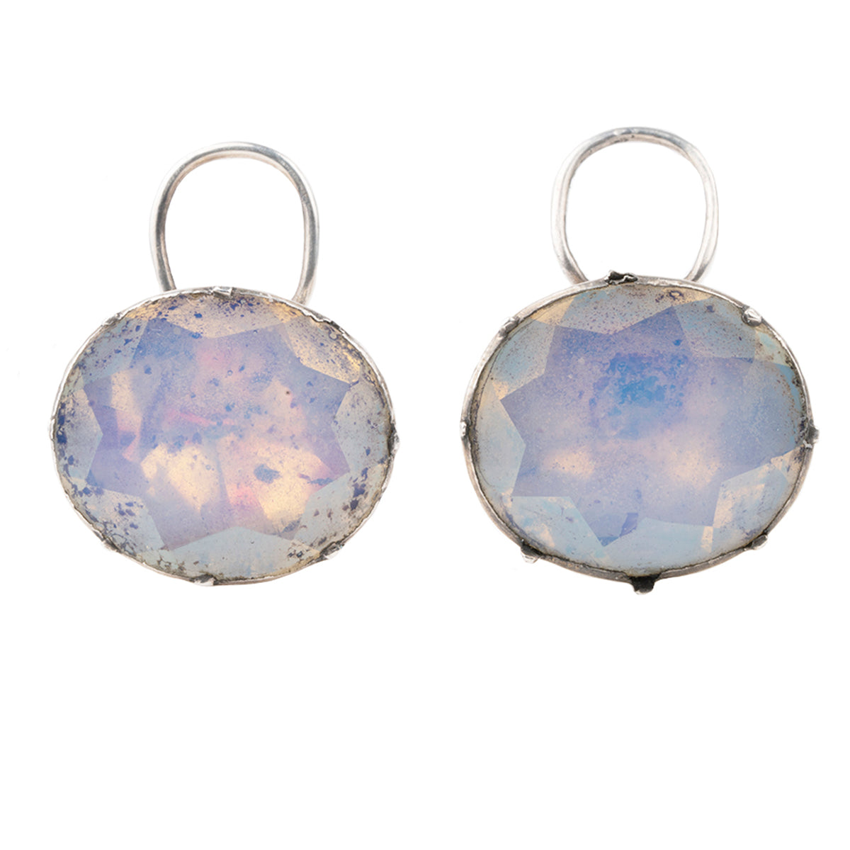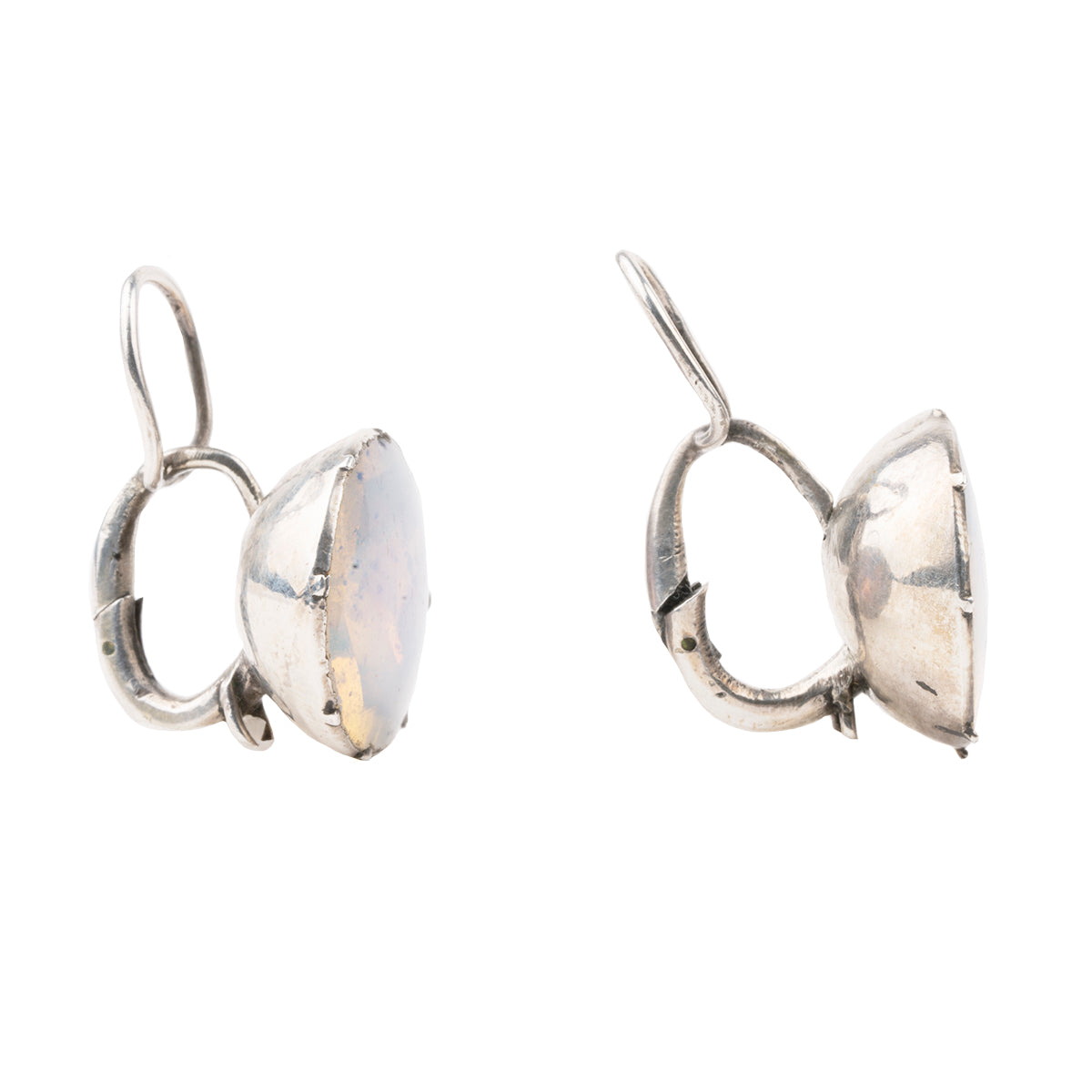 Rare Queen Anne Opaline Paste earrings. 18th century earrings set in sterling silver. The back to front ear wires have a period detail called 'wig hooks'. This clever design catches the back of the ear balancing the earring properly on the ear lobe. In the 1700's there would have been large teardrop shaped drops that coordinated with these tops and the weight could be alleviated by tying a ribbon to the wig hook and pinning it into the hair. English in origin.